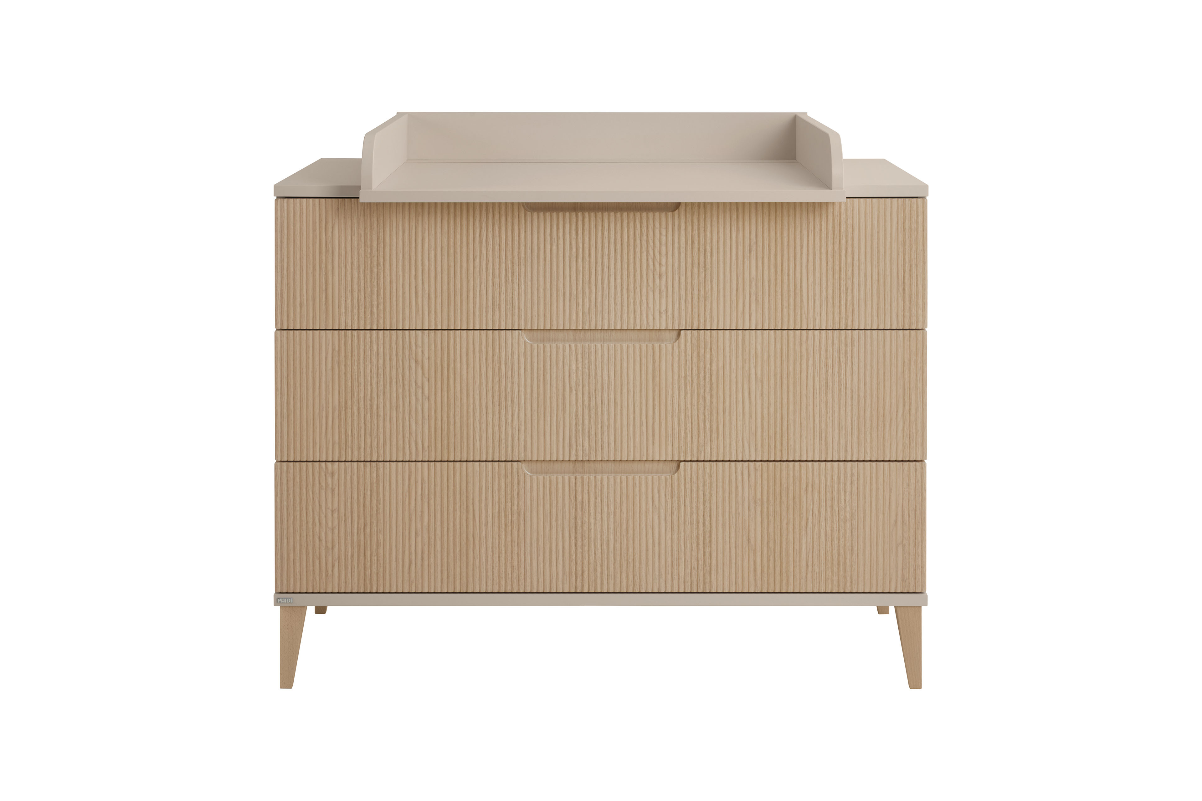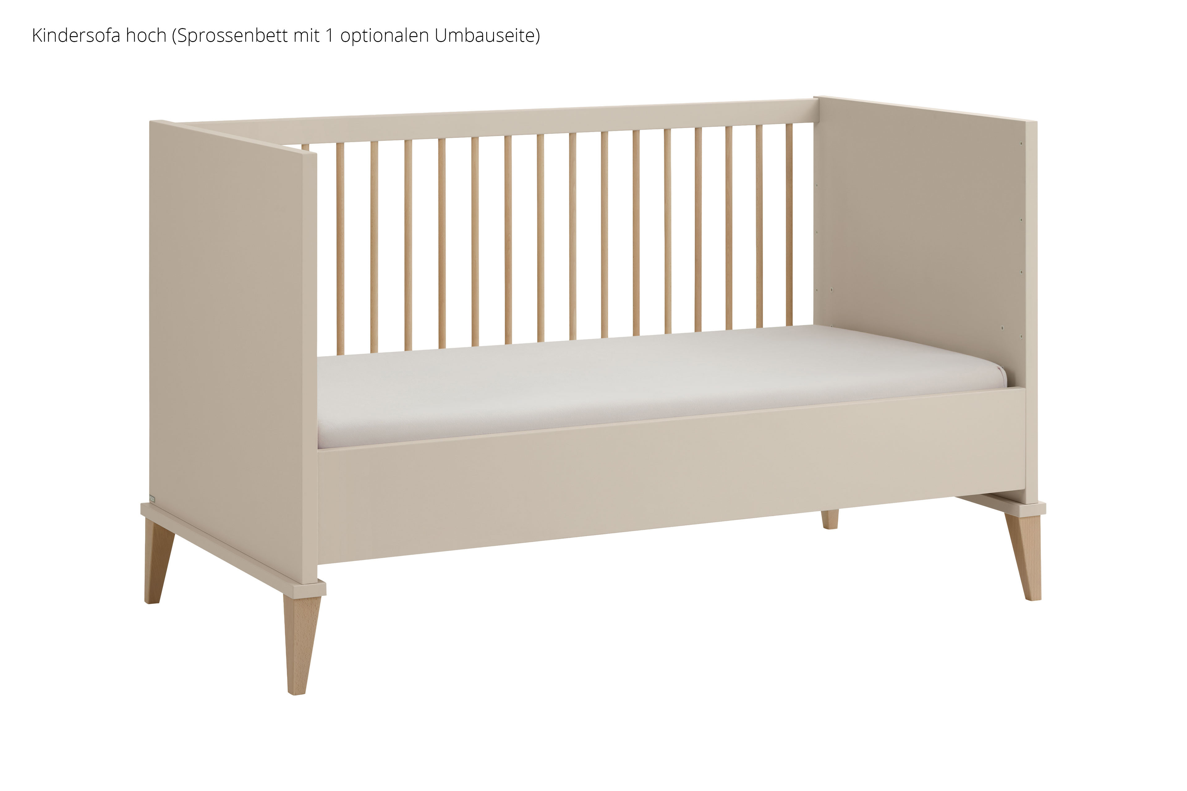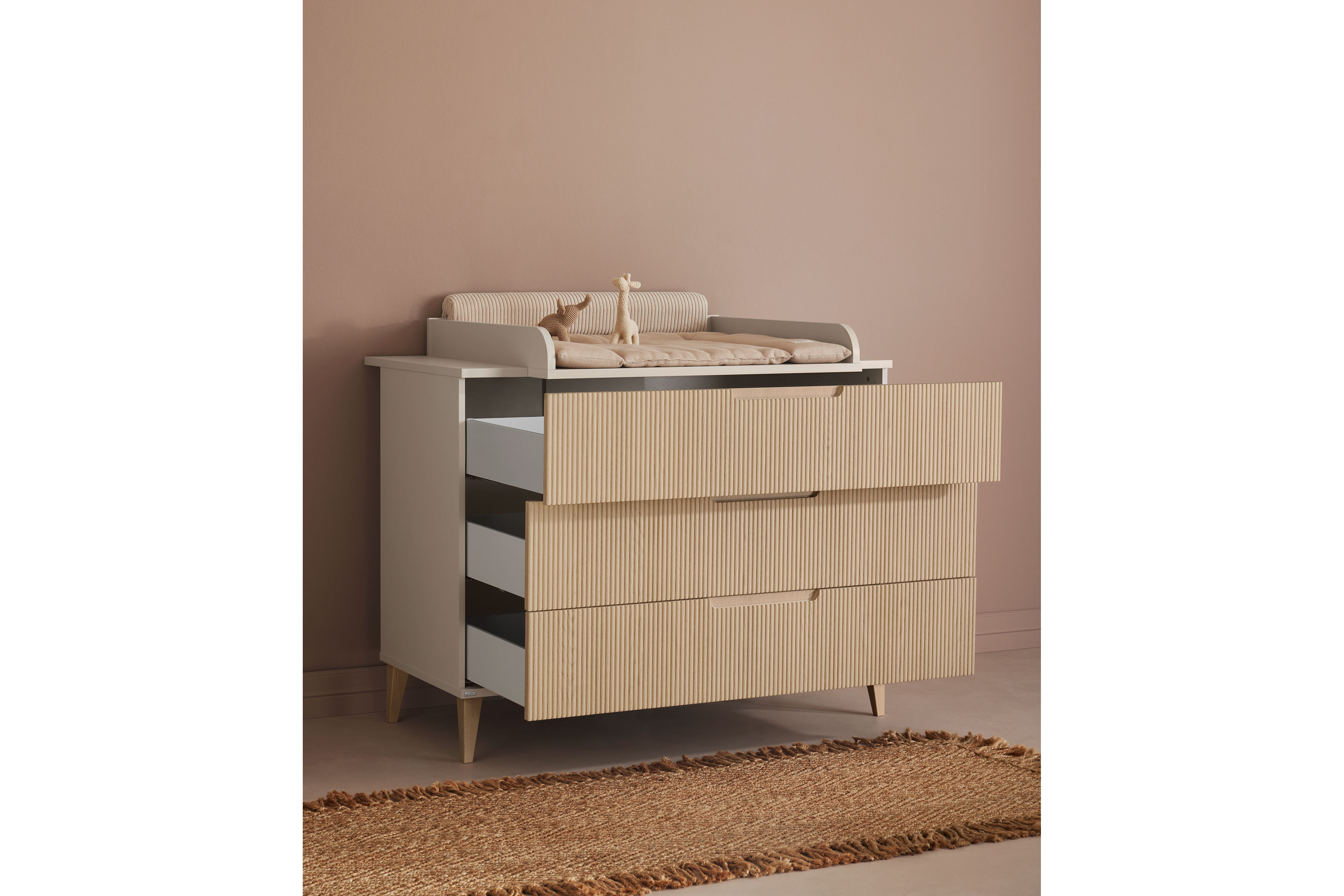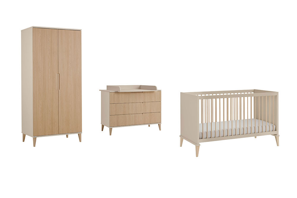 Das Babyzimmer Jonte von PAIDI vereint zeitlose Ästhetik mit ausgeklügelter Funktionalität im angesagten Japandi-Style. Die harmonische Kombination aus warmem Cashmere-Beige und Stripy-Light-Oak verleiht dem Raum eine ruhige, natürliche Ausstrahlung. Sanft gerundete Kanten unterstreichen das weiche, kindgerechte Design und schaffen eine behagliche Atmosphäre. Das 4-teilige Set besteht aus einem geräumigen Kleiderschrank, einem komfortablen Babybett, einer praktischen Schubladenkommode sowie einem Wickelaufsatz. Der Kleiderschrank mit zwei Drehtüren bietet im Inneren ein übersichtliches Kleider- und Wäschefach und sorgt so für Ordnung im Alltag. Das Kinderbett überzeugt mit seinen runden Sprossen aus massivem Buchenholz und einer Liegefläche von 70 x 140 cm. Für optimalen Schlafkomfort sorgt der 4-fach höhenverstellbare AIRWELL®-Comfort Federleistenrost, der sich an die Entwicklung Ihres Kindes anpasst. Die Wickelkommode ist als funktionale Schubkastenkommode gestaltet und verfügt über drei geräumige Schubfächer mit praktischer Facheinteilung, wobei die oberste Schublade mit Vollauszug ausgestattet ist. Der Wickelaufsatz lässt sich flexibel rechts, links oder mittig montieren und bei Bedarf einfach abnehmen. Besonderen Komfort bieten die hochwertigen Dämpfungsbeschläge an den Türen und die Schubkästen, die mit integrierter Stoppfunktion und gedämpftem Selbsteinzug ausgestattet sind – ideal für eine ruhige Umgebung im Babyzimmer. Mit unserem Konfigurator lässt sich das Kinderzimmer individuell ergänzen und ganz nach Ihren Wünschen gestalten. So wächst Jonte von PAIDI mit Ihrem Kind mit und bleibt über viele Jahre hinweg ein stilvoller und funktionaler Begleiter.