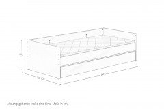 - Kojenbett: mit Bettkasten (als Stauraum oder Gästebett nutzbar), Matratzengröße für Bettkasten BHT ca. 90/11/190 cm