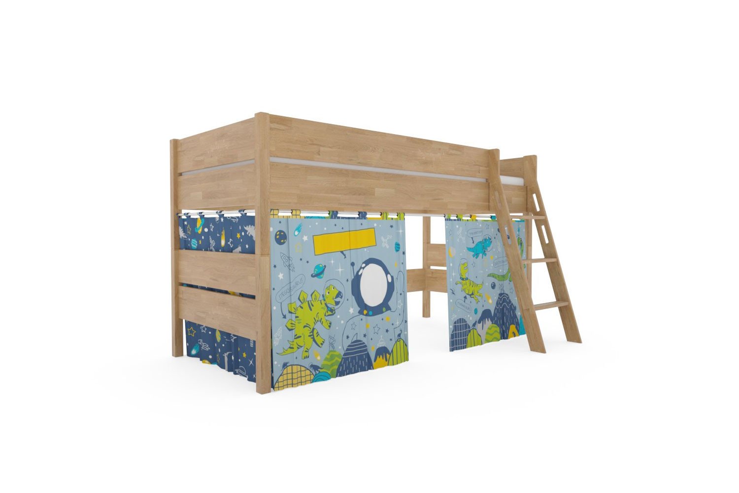 1 x Vorhang-Set Motiv "Dinos im Weltall", 2 Motiv-Vorhänge für die Längsseite für Spielbett, 100 % Baumwolle,