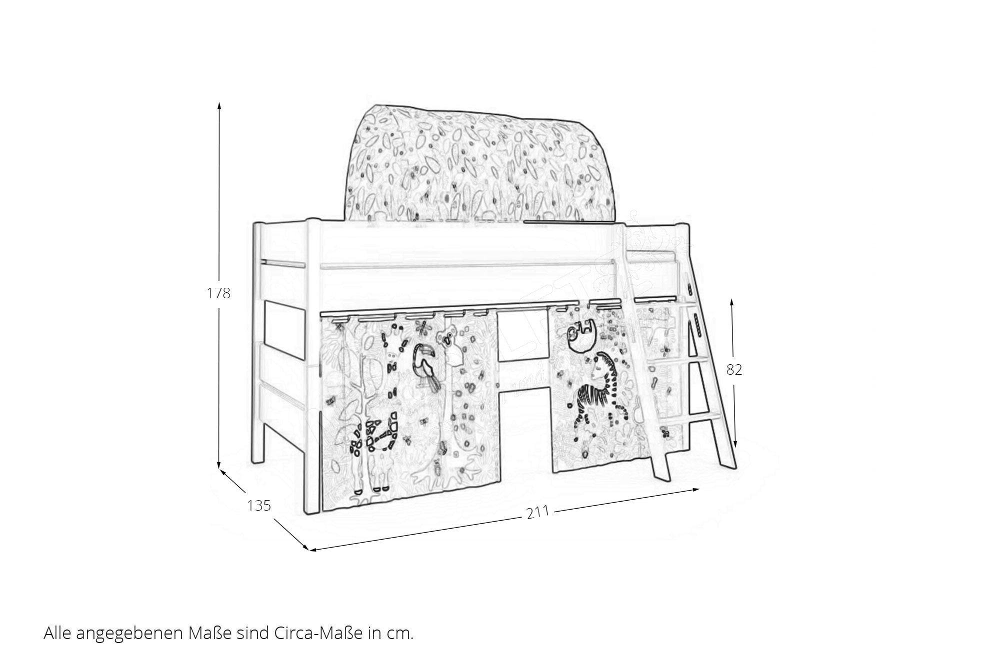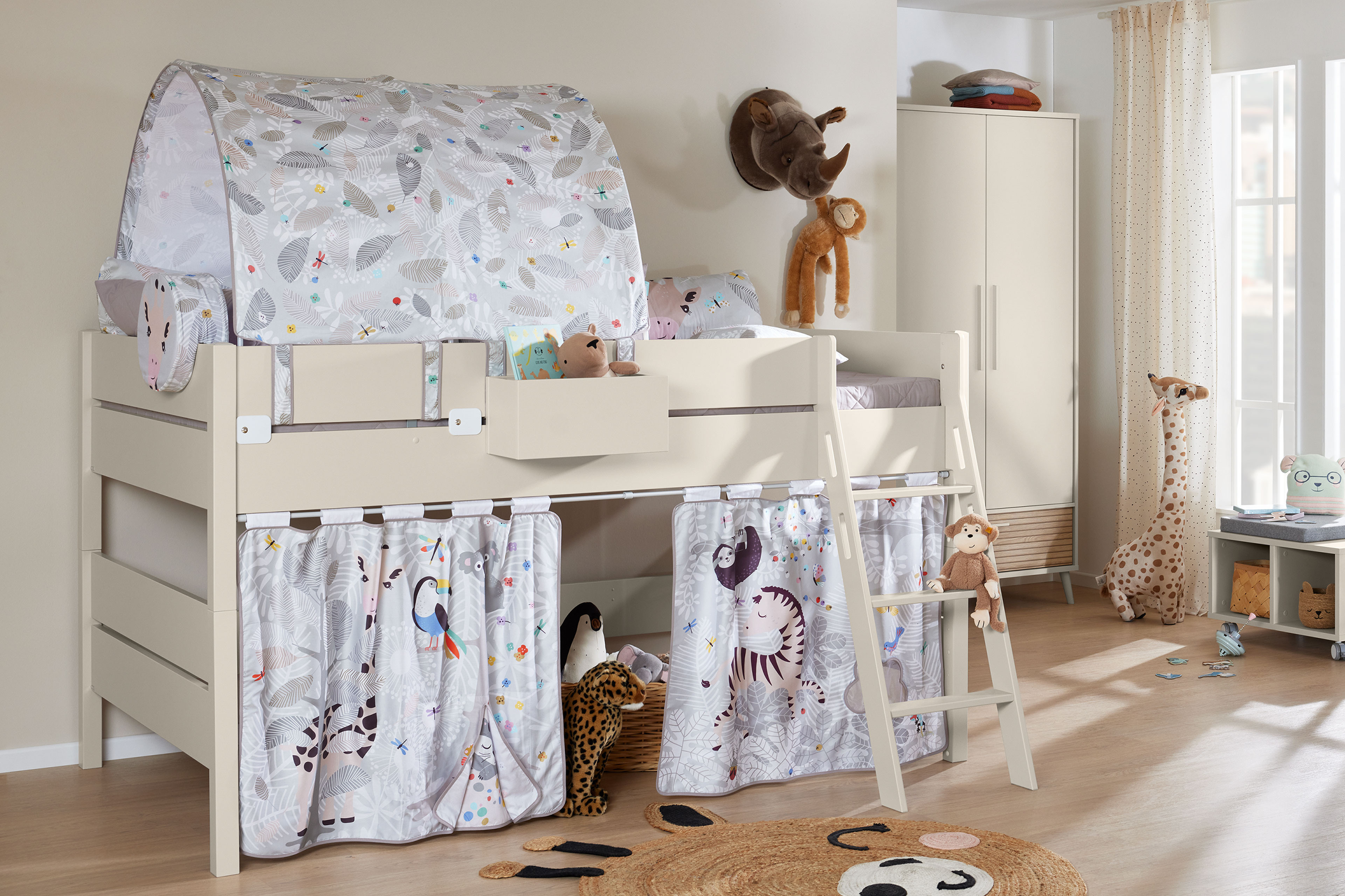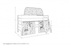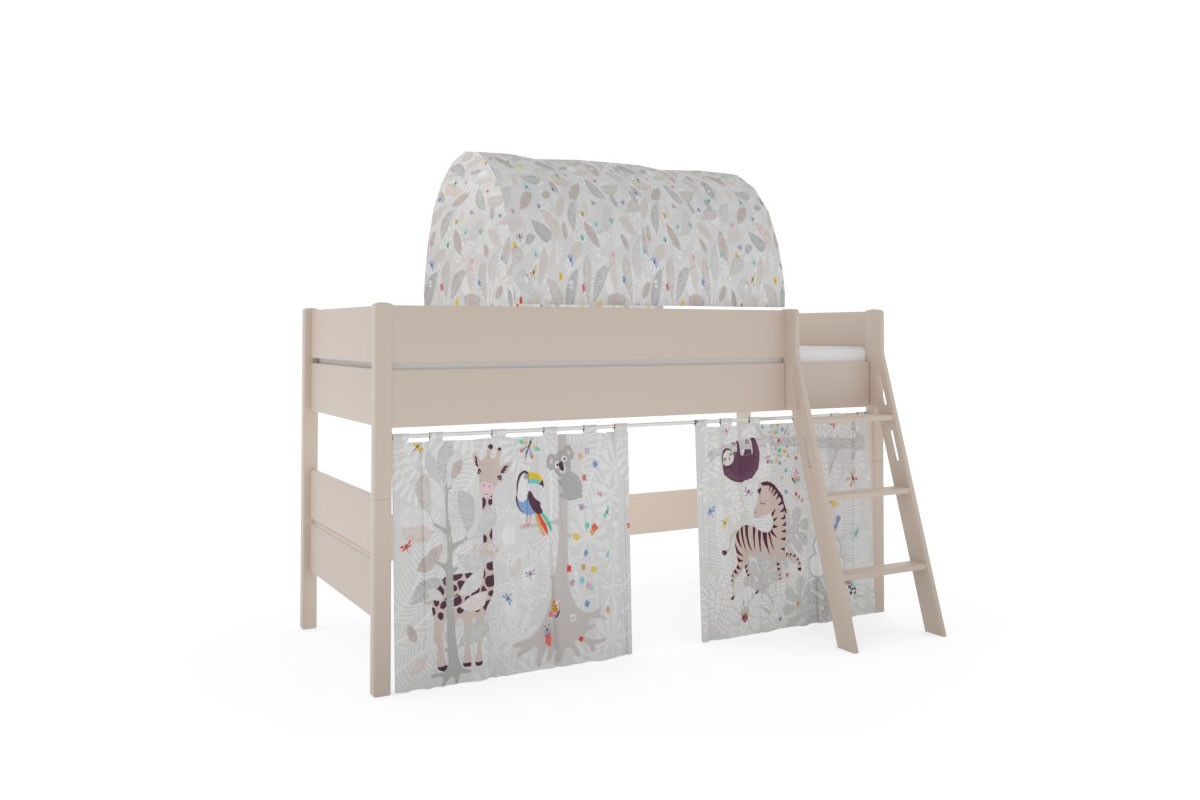 Spielbett 120 von Paidi - Modell Tiago - mit schräger 3-Stufen-Leiter + Baldachin und Vorhängen mit Motiv AFRIKA aus der Kollektion Kidsworld Tiago - Kinderbetten designed to grow