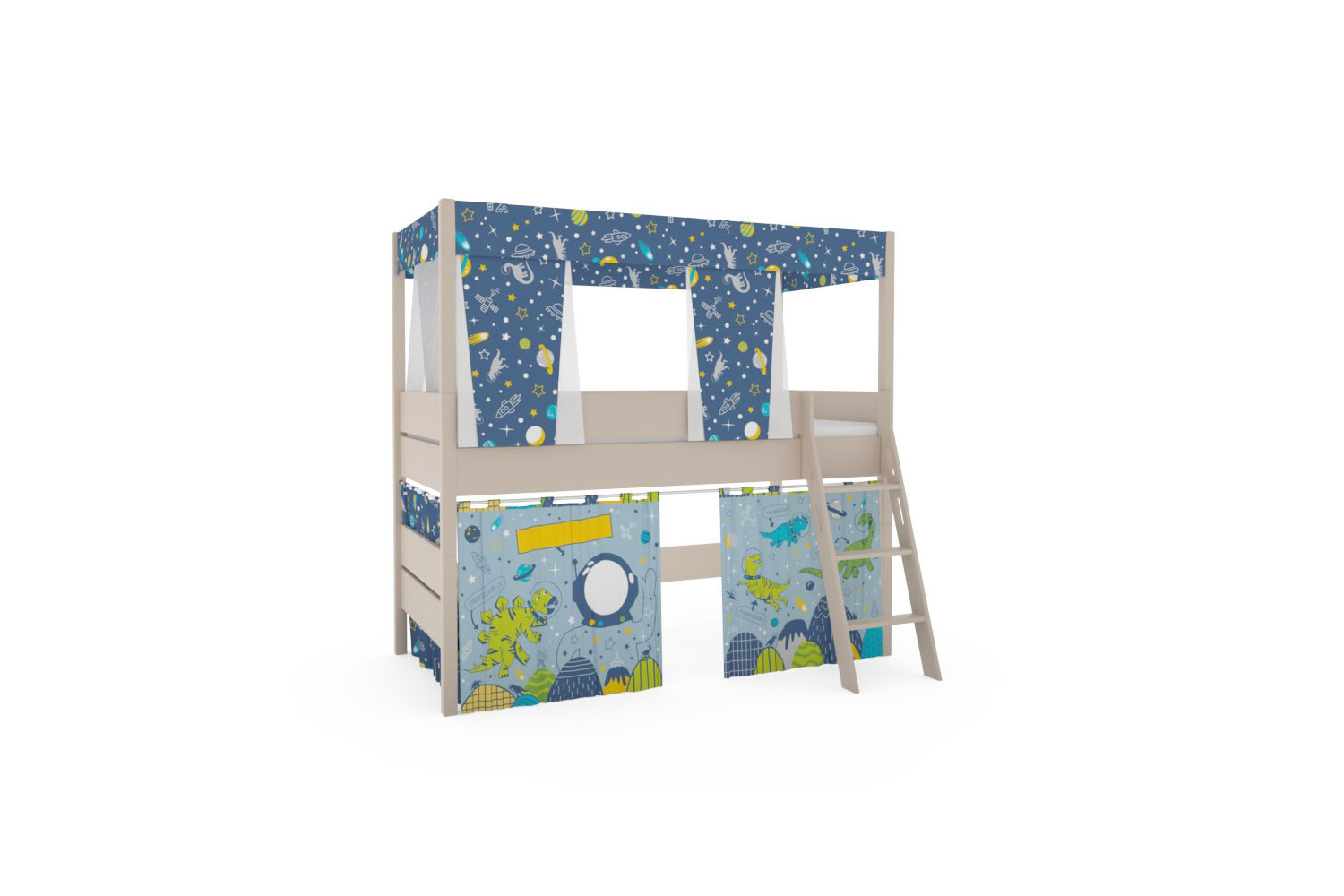 Spielbett 120 von Paidi - Modell Tiago - mit 3-stufiger Schrägleiter + Baldachin und Vorhängen mit Motiv DINOS IM WELTALL aus der Kollektion Kidsworld Tiago - Kinderbetten designed to grow