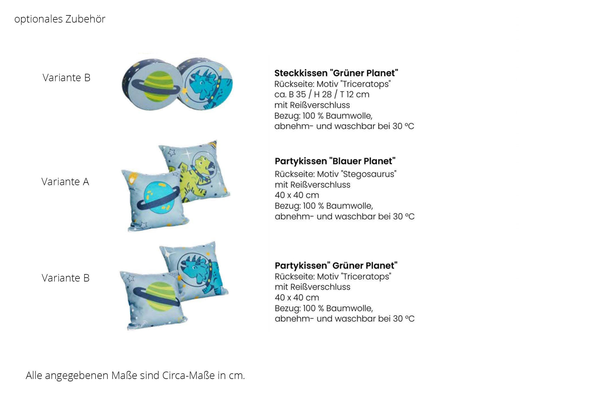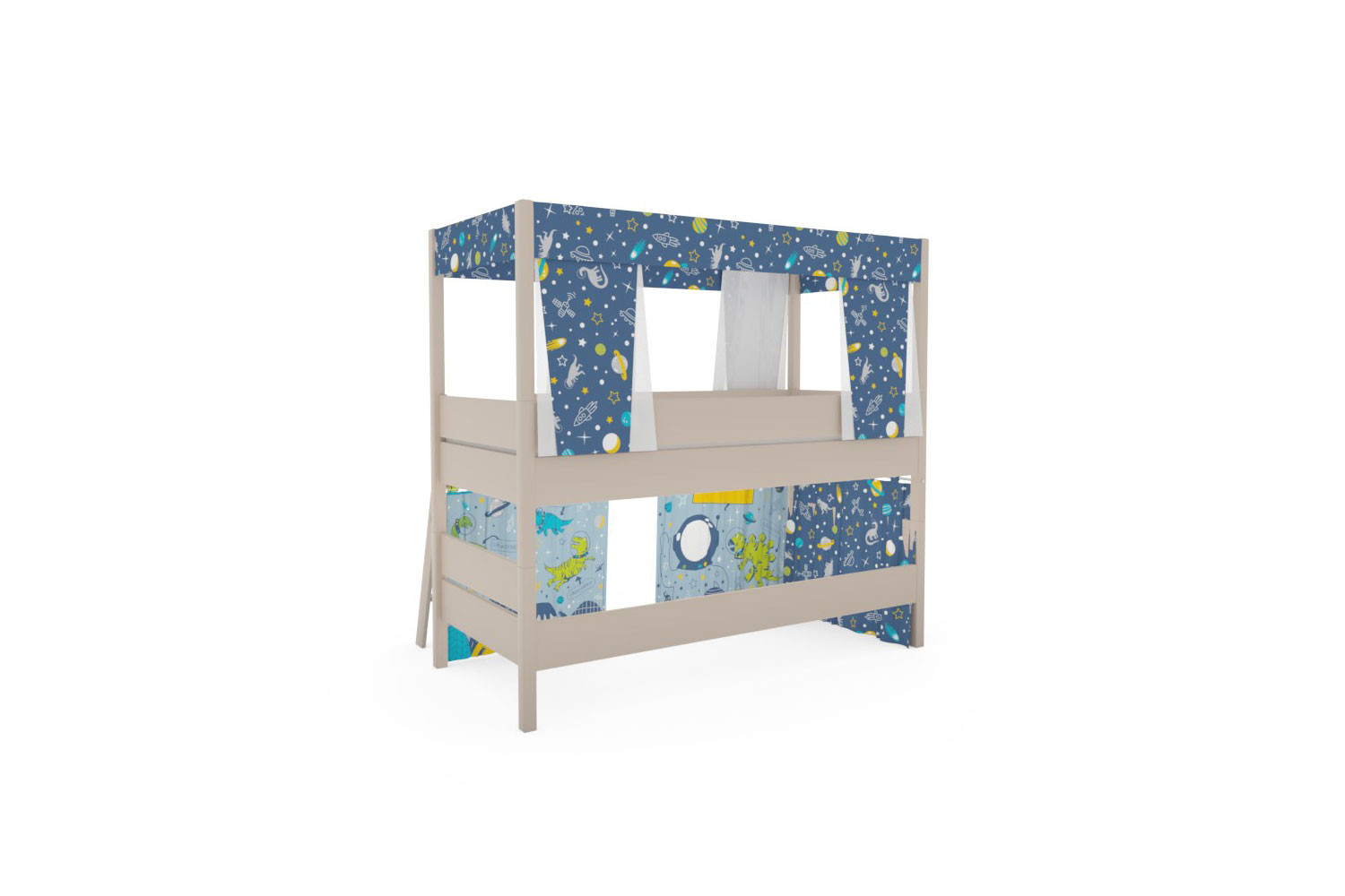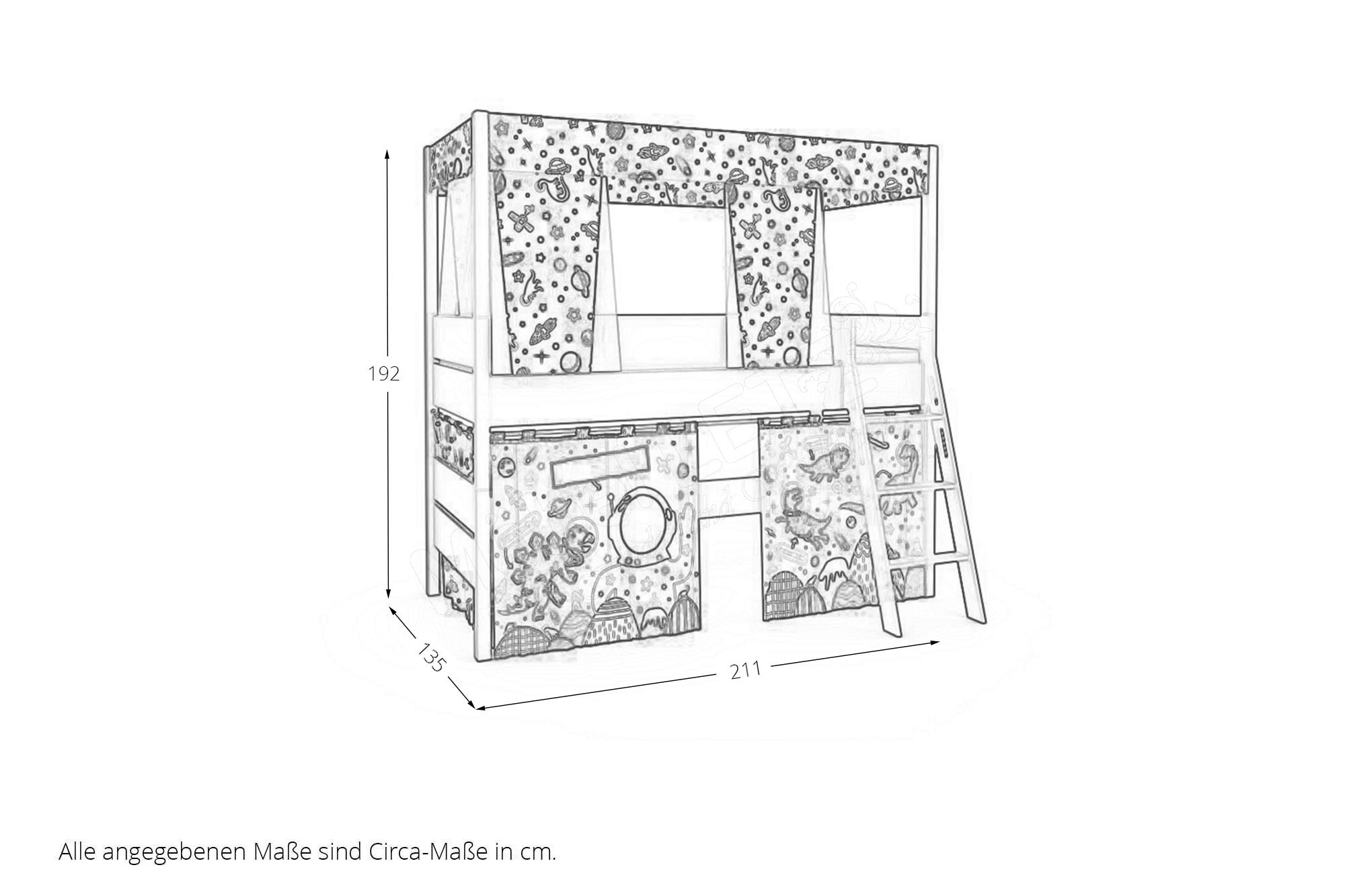 Für Farbe und gute Laune im Kinderzimmer sorgt das Spielbett aus der Modellreihe Tiago von Paidi. Das cashmere-beige-farbene Bettgestell inklusive des niedrigen Baldachin-Aufbaus und den farbenfrohen Vorhängen mit dem Motiv „Dinos im Weltall" sorgen für ein gemütliches Ambiente mit einem kindgerechten Design. Die 90 x 200 cm große Liegefläche ist über eine 3-stufige Schrägleiter erreichbar. Unter der Schlafebene gibt es einen Freiraum, der eine Höhe von etwa 82 cm misst und auf einer Querseite sowie der vorderen Längsseite mit einem Vorhang verschlossen ist: Hier kann eine geschützte Kuschelhöhle mit Verstaumöglichkeiten für Spielzeug eingerichtet werden. Die Liegefläche wird von einem Stoffdach und vier Vorhängen umrahmt. Das passende Bettzubehör wie einen Lattenrost und eine Matratze können Sie über unsere Zusatzoptionen zum Grundangebot hinzufügen. Auch die kuscheligen Accessoires in den unterschiedlichsten Varianten und Formen können ganz einfach online gekauft werden. Um den Platz unter dem Bett effizient nutzbar zu gestalten, haben Sie die Möglichkeit, unterschiedliche Rollboxen gleich mit zu bestellen. Das Möbel-Programm Tiago steht für eine Vielzahl an hochwertigen Bettvariationen und inspirierenden Kombinationsideen, mit denen Sie das Kinderbett durch einen Baldachin, Vorhänge und Kissen in eine Oase der Gemütlichkeit verwandeln können. Tiago von Paidi - kompromisslos glücklich.