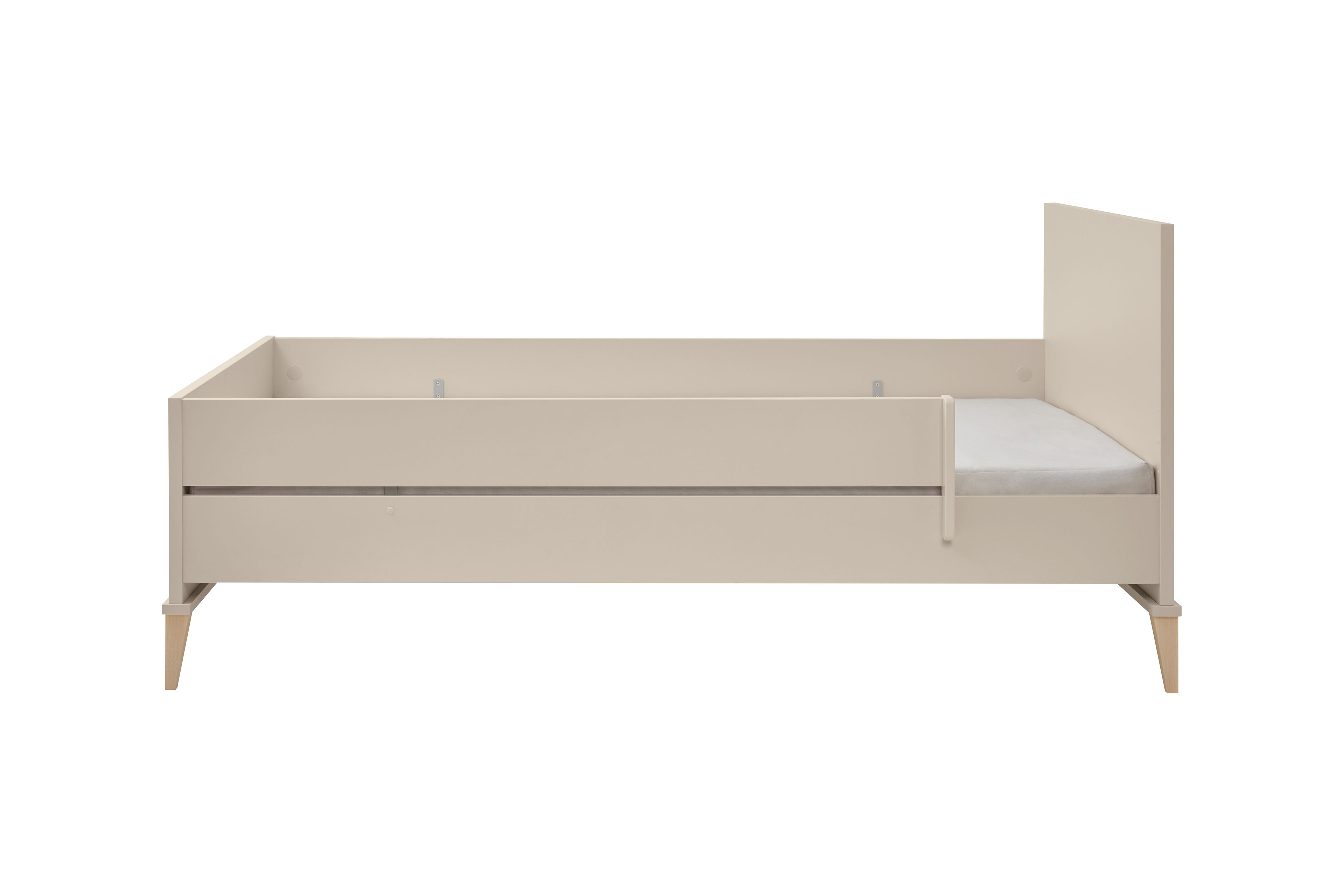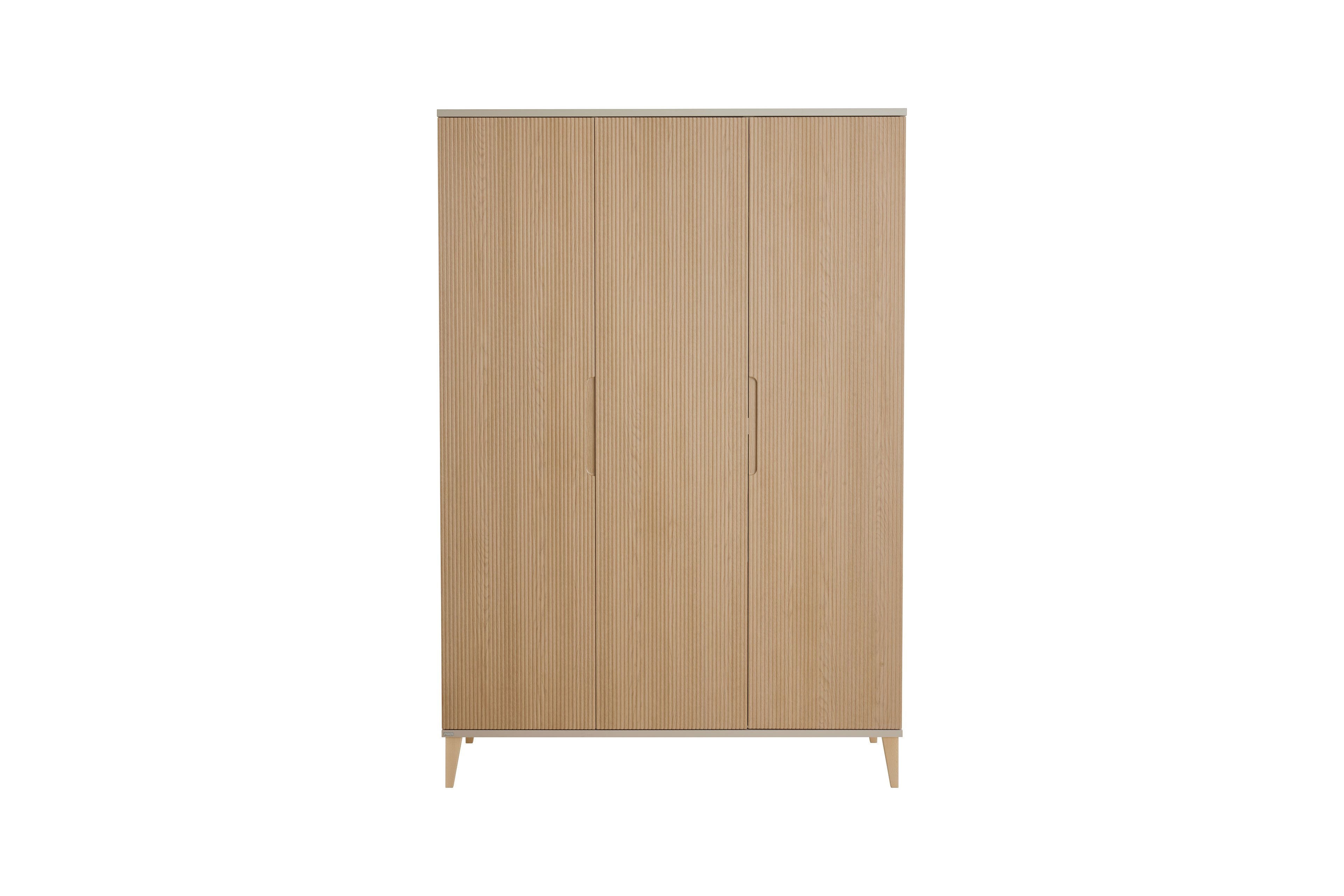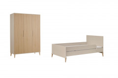 Mit dem gemütlich großen Bett und dem geräumigen Drehtüren-Kleiderschrank ist alles da, was man in einem Kinderzimmer braucht. Unser Möbel-Bundle schafft einen Ort für Ihr Kind, an dem es sich geborgen fühlt und seiner Fantasie freien Lauf lassen kann. Dieses Einrichtungs-Set gehört zur Serie Jonte von PAIDI und ist im ruhigen, natürlichen Japandi-Stil gehalten und ist damit perfekt zum Spielen, Träumen und Entspannen. Der sanfte Farbton in Cashmere-Beige, die warm wirkende gestreifte Eichenholz-Nachbildung und die massiven Buchenholz-Füße verleihen dem Raum eine freundliche Ausstrahlung und machen das Kinderzimmer zu einem echten Wohlfühlort für Ihr Kind - wie eine kleine, sichere Welt zum Ankommen. Das Bett wird schnell zum Lieblingsplatz, denn die hintere Schutzseite wirkt wie eine sanfte Umarmung, während die vordere Absturzsicherung nachts gut aufpasst, damit Ihr Kind sicher schlafen kann. So entsteht ein Gefühl von Geborgenheit, fast so, als würde das Bett selbst über den Schlaf wachen. In dem großen Kleiderschrank, der drei leise schließende Türen hat, finden die unterschiedlichsten Dinge Ihres Kindes einen Platz – von Kleidung bis zu den Lieblingskuscheltieren. In diesem Schrank wird alles ordentlich verstaut und ist jederzeit griffbereit. Besonders schön: Dieses Kinderzimmer-Programm ist über unseren Konfigurator frei planbar, sodass alle Möbel ganz individuell zusammenstellbar und an Ihre Wünsche anpassbar sind. Eine reichhaltige Auswahl an Matratzen finden Sie in unserem Online-Shop, sodass für das neue Kinderzimmer auch gleich ein komfortables Liegepolster mit bestellt werden kann. Ob zusätzliche Möbel für mehr Stauraum oder kuschelige Kissen - das Zimmer wächst einfach mit und wird zu einem ganz persönlichen Lieblingsort. Jonte von PAIDI - Ein Kinderzimmer, das nicht nur praktisch ist, sondern sich anfühlt wie ein guter Freund: warm, sicher und immer für Ihr Kind da.