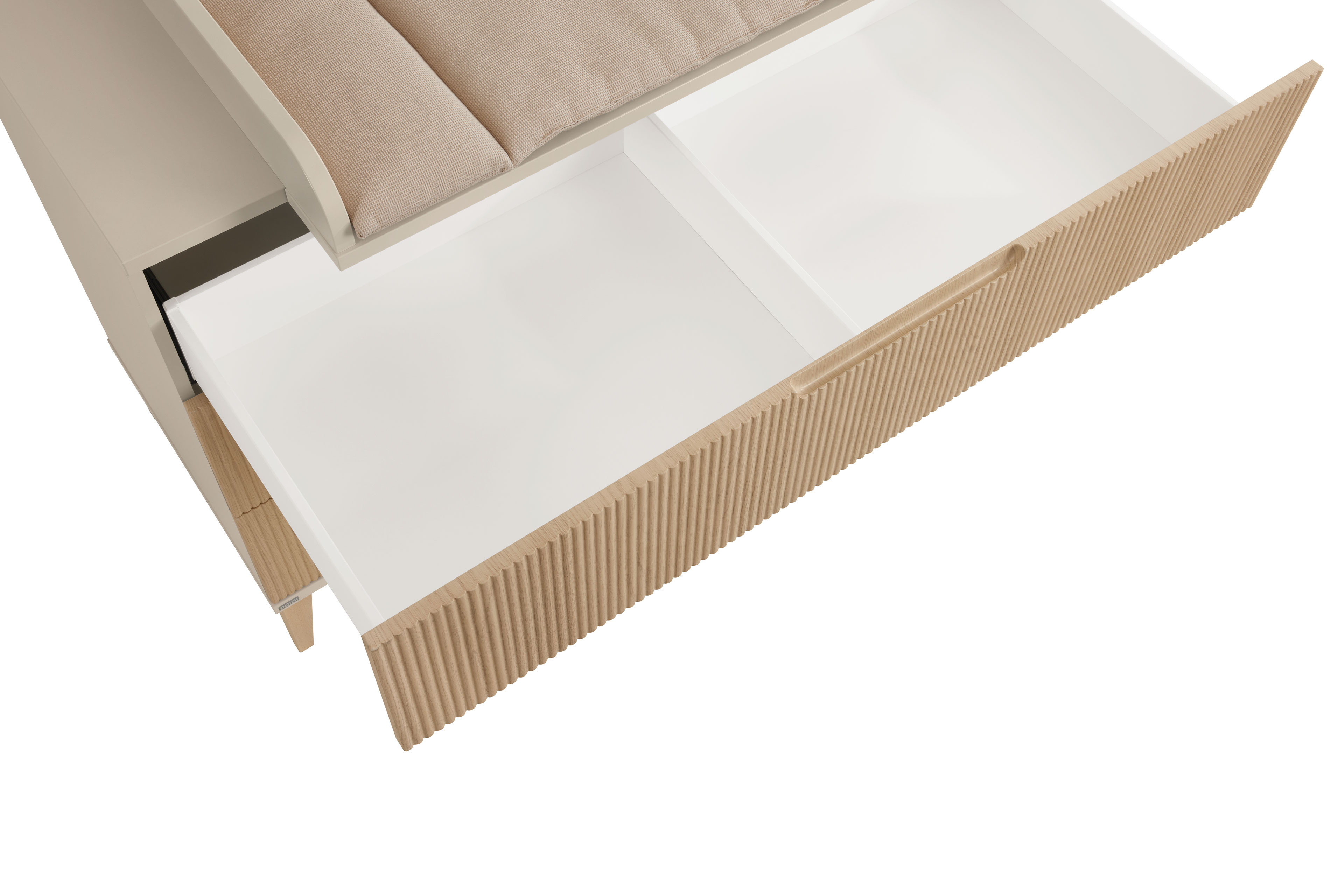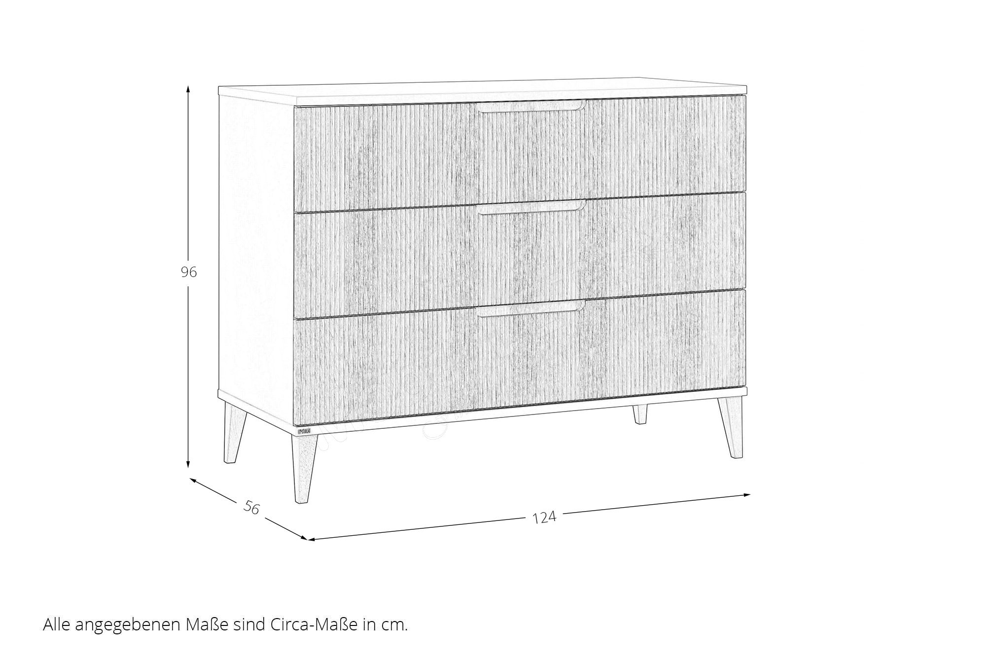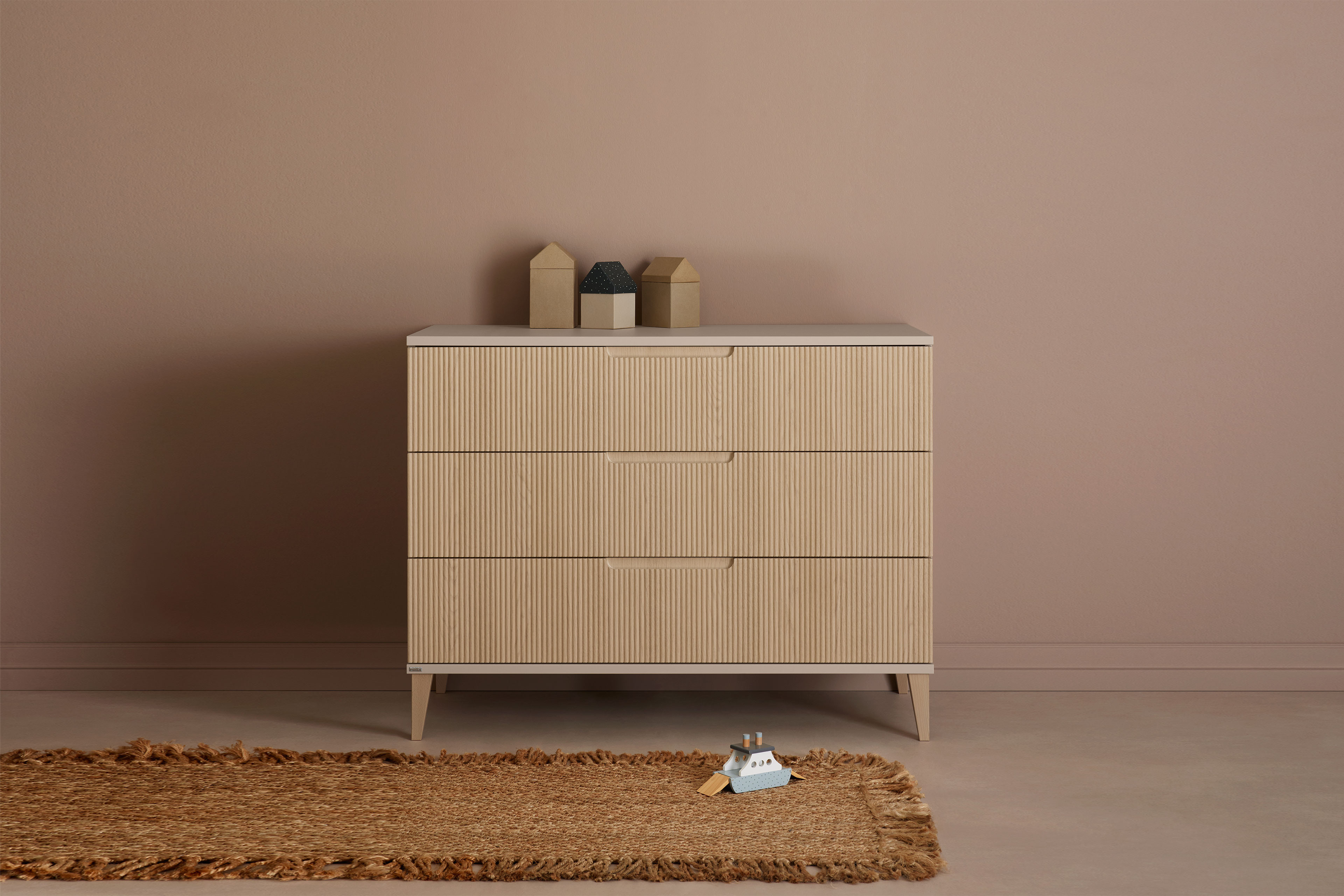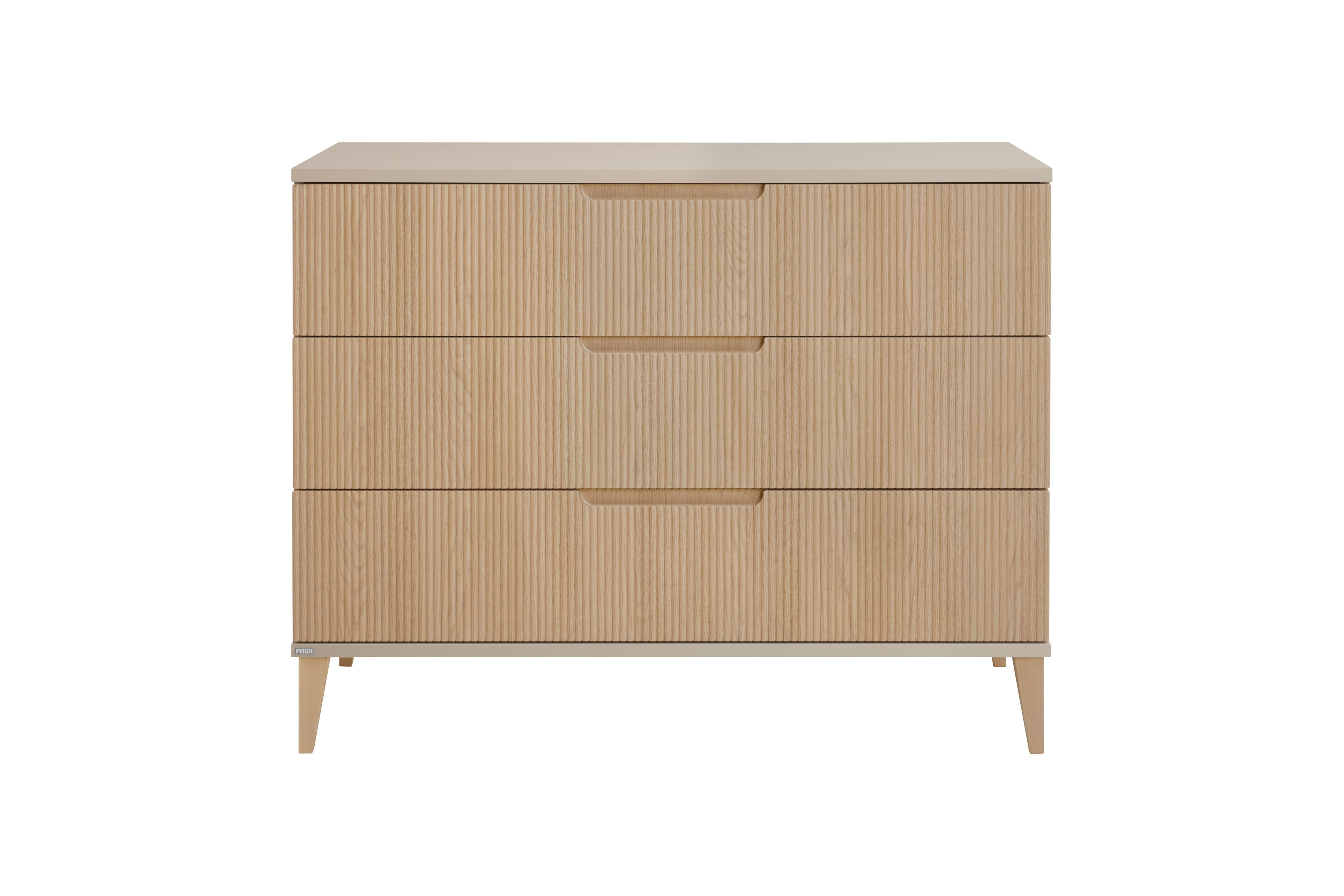 Zarte Linien, die die Front in heller Eichenholz-Nachbildung verzieren, ein Korpus im wohnlichen Farbton Cashmere-Beige und massive, leicht abgeschrägte Buchenholzfüße bestimmen die Optik der Schubladenkommode Jonte von PAIDI. Bei diesem Möbelprogramm im Japandi-Style beruht das ansprechende Design auf japanischer Ästhetik und skandinavischer Zweckmäßigkeit. Die ansprechende Einrichtungsserie, die eine Vielzahl an unterschiedlichen Elementen enthält, eignet sich perfekt zur Möblierung von Baby-, Kinder- und Jugendzimmern. Die Jonte Schubladenkommode ist etwa 96 cm hoch und stellt neben dem etwa 124 x 56 cm großen Ablageboden auch drei Schubfächer mit integrierter Stoppfunktion und gedämpftem Selbsteinzug zum Verstauen zur Verfügung. Um das Sortieren zu vereinfachen, ist jeder Schubkasten innen in zwei Fächer gegliedert. Die oberste Lade kann zudem komplett aufgezogen werden, sodass man den gesamten Inhalt des Kastens überblicken kann. Ergänzen Sie die Schubladenkommode mit weiteren modellgleichen Typen und richten Sie den ganzen Raum mit diesem Programm ein. Jonte von PAIDI - japanische Schlichtheit trifft nordische Klarheit.