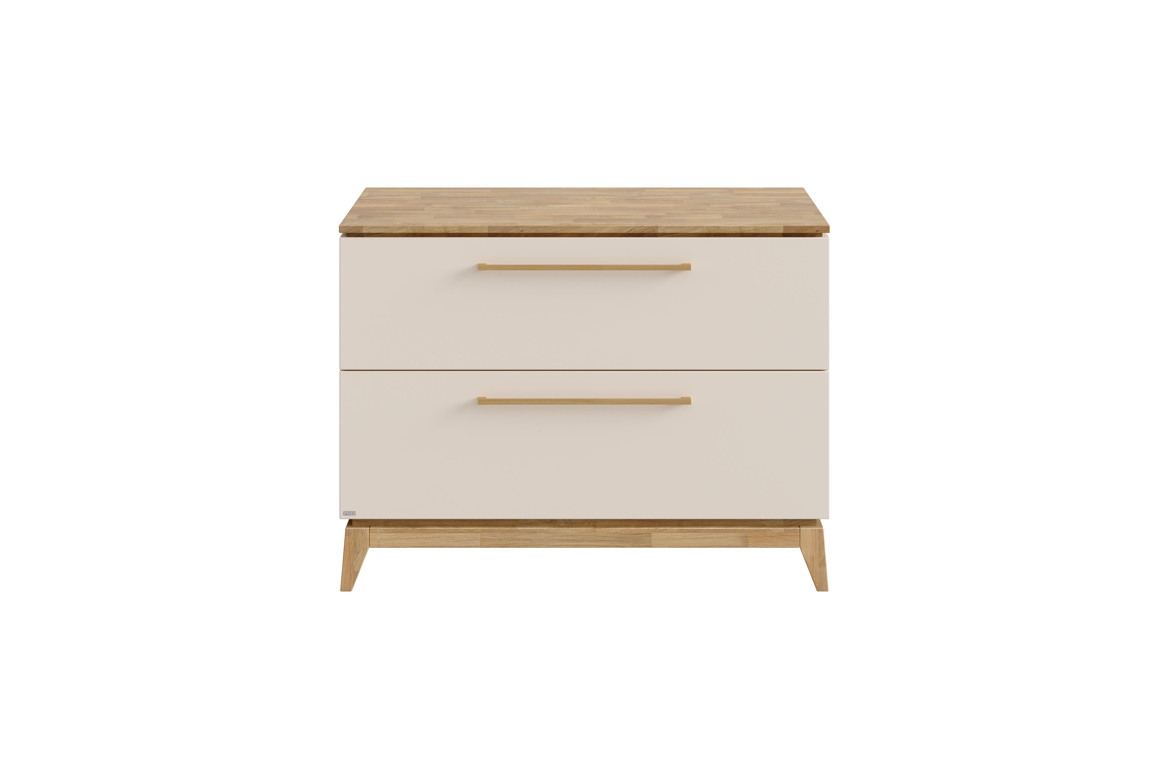 Mit einem warm und gemütlich wirkenden Materialmix, der auf cashmere-beige-farbenen Oberflächen und massivem Eichenholz beruht, tritt die Schubfachkommode aus dem Kinderzimmer-Einrichtungsprogramm Stiene von Paidi auf. Der Seiten-Elemente und auch die Front sind in sanftem Beige gehalten, während die Deckplatte, die Griffe und auch der Fuß-Sockel aus massiver Eiche gefertigt wurden. Diese praktische, etwa 124 cm breite und ungefähr 92 cm hohe Kommode hat zwei Schubfächer, wobei sich in dem oberen Auszug außerdem eine innenliegende Schublade mit Facheinteilung befindet. Beide Schubkästen haben innovative Auszüge mit Stoppfunktion und anschließendem Selbsteinzug. Über unseren Möbelplaner können Sie diese Kommode mit weiteren Möbelstücken aus der Serie Stiene von Paidi zu einer kompletten Zimmer-Einrichtung ergänzen.