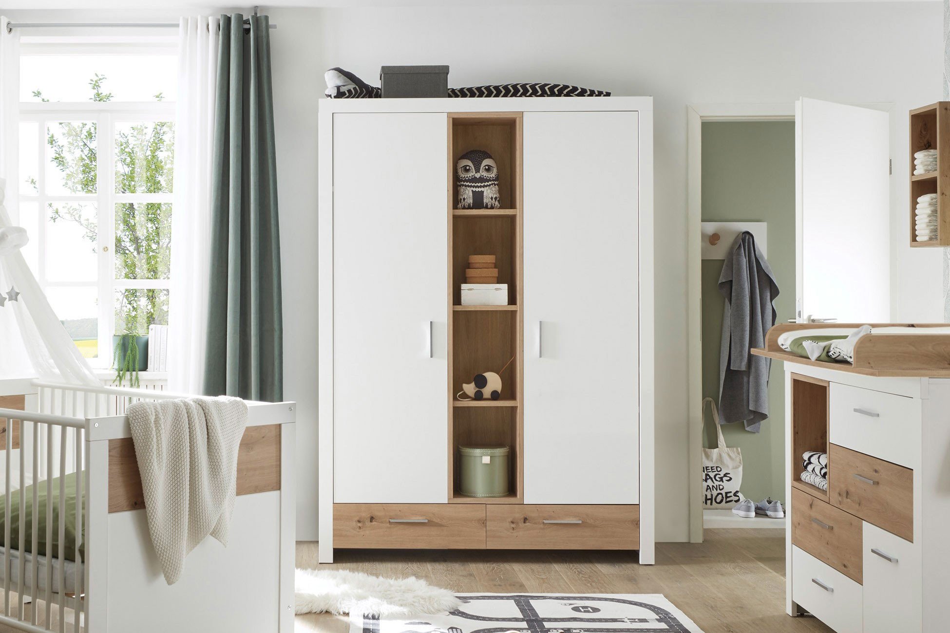 Kleiderschrank von POL Power - Modell Filou-LE25 - 2 Türen, 4 offene Regalfächer, 2 Schubladen Geborgenheit in jedem Detail – Babyzimmer Filou