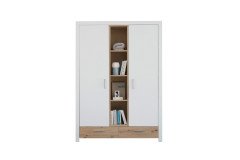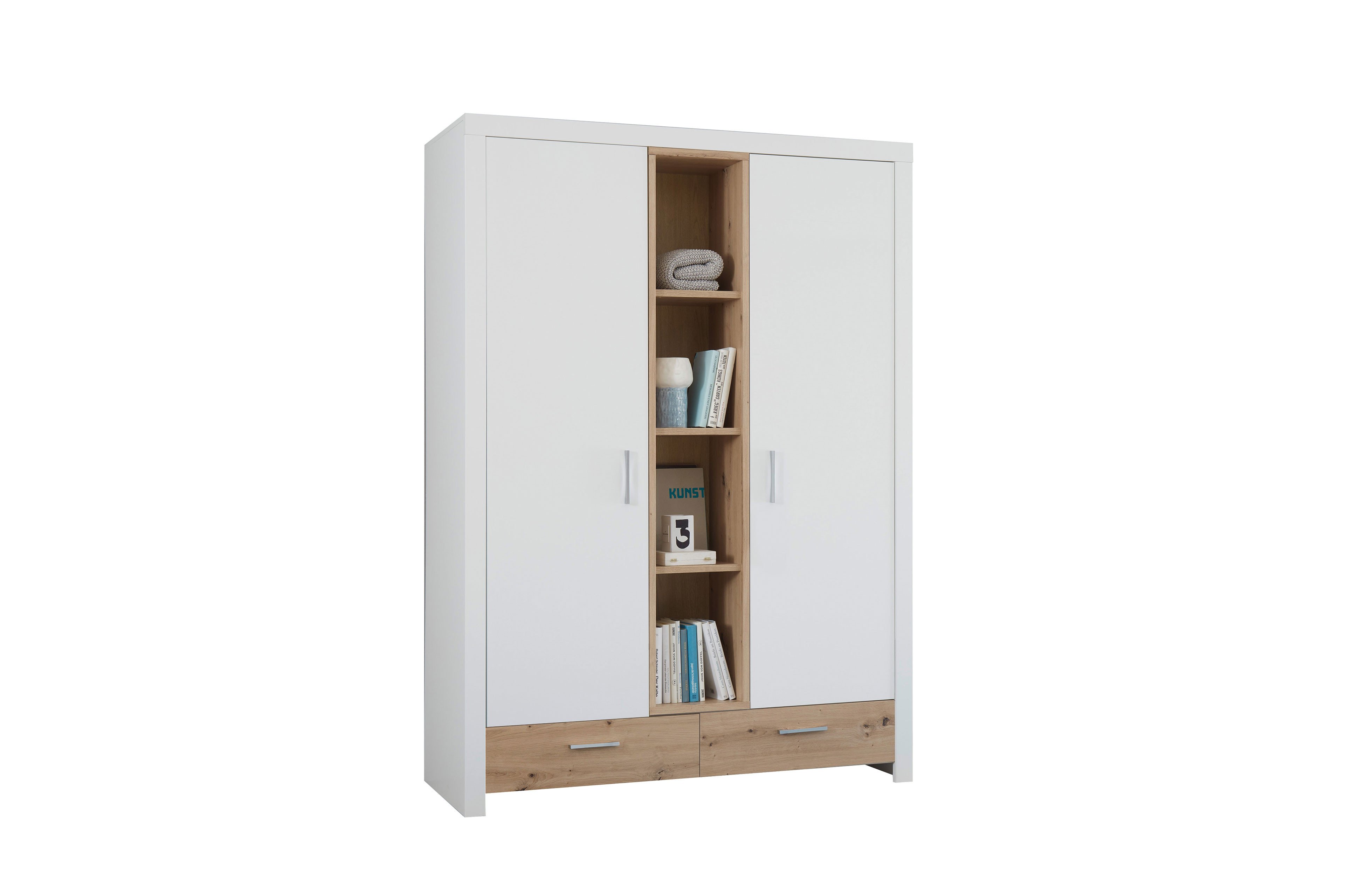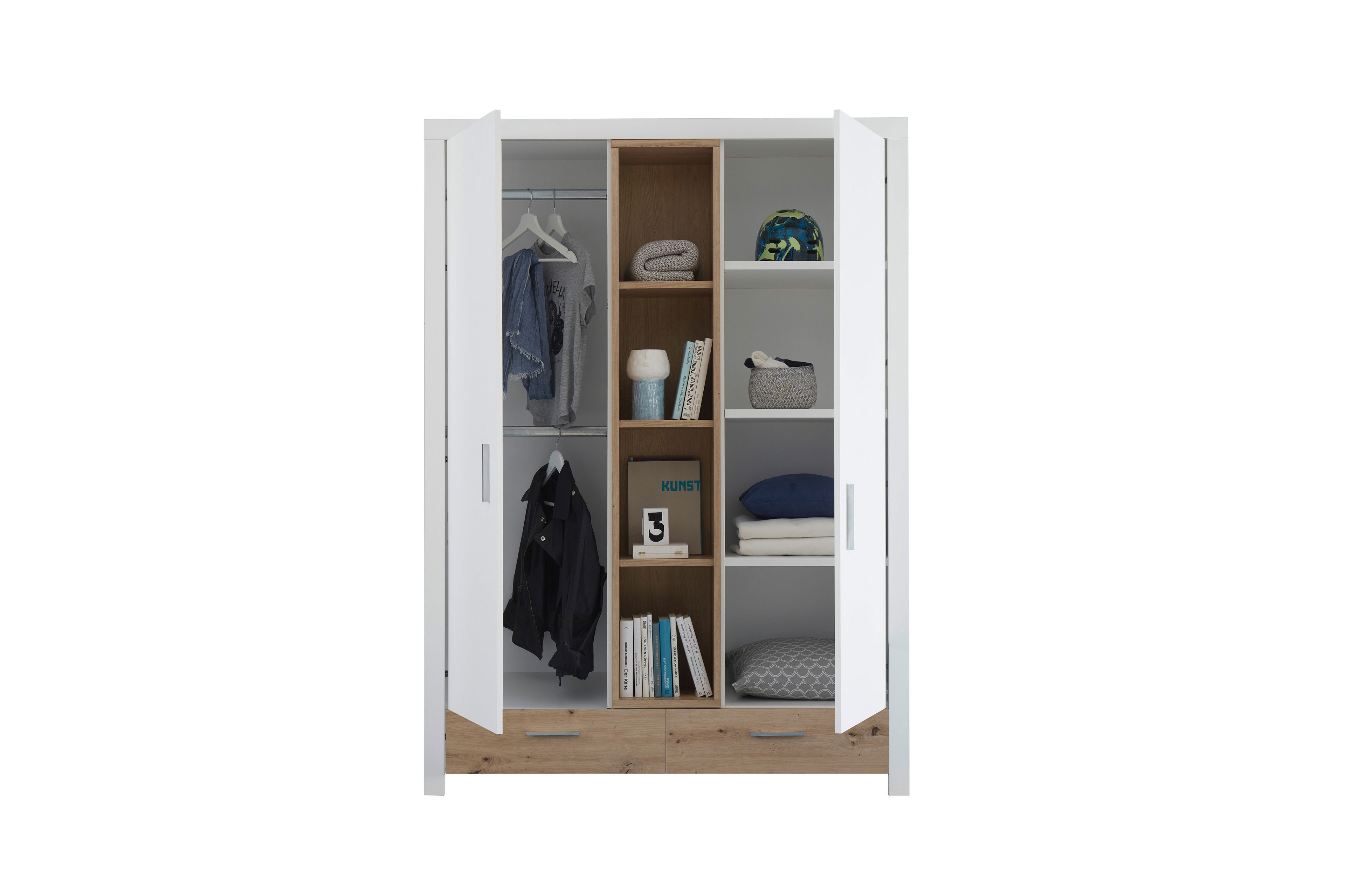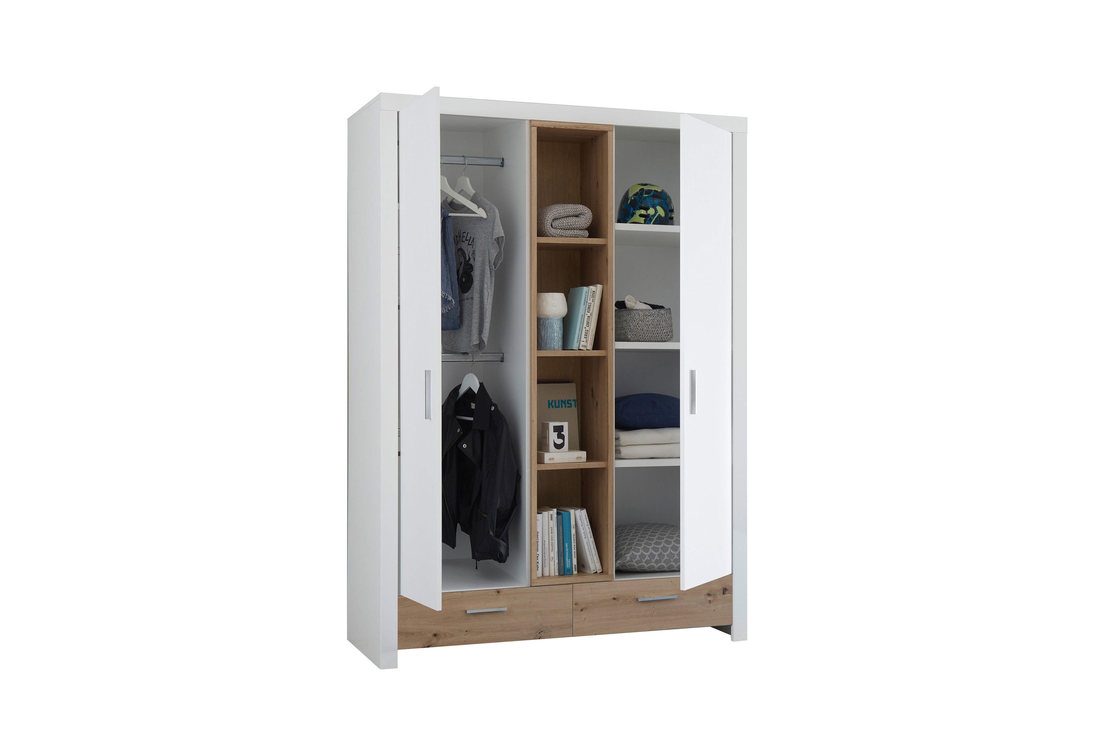 Der POL Power Drehtürenschrank Filou-LE25 verbindet stilvolle Optik mit durchdachtem Stauraumkonzept. Der Kleiderschrank präsentiert sich in einem harmonischen Mix aus weißen Oberflächen sowie Absetzungen in Artisan Eiche Nachbildung, die dem Möbelstück eine warme, natürliche Ausstrahlung verleihen. Hinter den zwei Türen rechts und links verbirgt sich reichlich Stauraum für Kleidung und Wäsche. In der Mitte des Schranks sorgen vier offene Regalfächer für eine dekorative Aufteilung und bieten Platz für Bücher, Spielzeug oder liebevolle Accessoires. Ergänzt wird das funktionale Design durch zwei Schubladen im unteren Bereich, in denen kleinere Utensilien ihren Platz finden. Mit den etwaigen Maßen von ca. 144 x 201 x 56 cm bietet der Filou-LE25 eine durchdachte Aufbewahrungslösung, die in jedes Kinder- oder Jugendzimmer passt. Dank seiner freundlichen Farbkombination und klaren Linien fügt er sich harmonisch in verschiedene Einrichtungsstile ein. Entdecken Sie den POL Power Schrank Filou-LE25 jetzt online - stilvoll gestaltet.