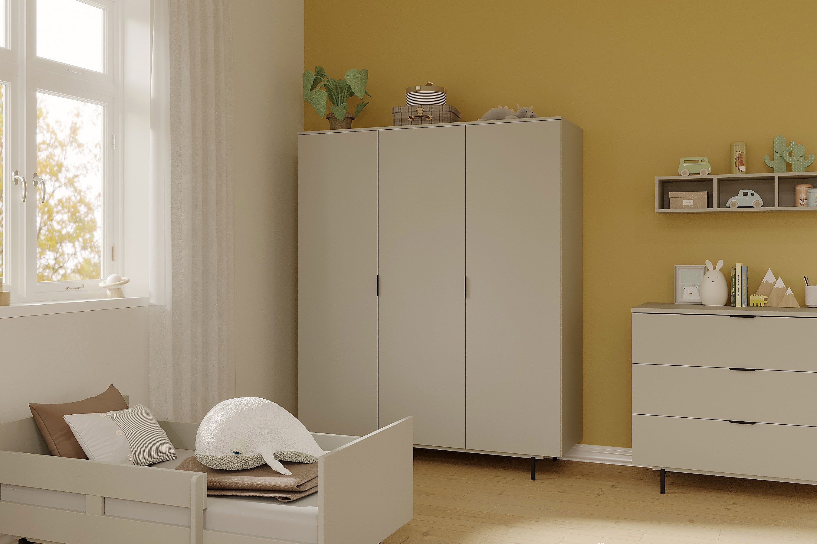 Der Kleiderschrank aus dem Programm GW-Tomino der GERMANIA mini Kollektion verbindet eine zeitlose Optik mit einer durchdachten Funktionalität. In elegantem Steingrau gehalten, fügt er sich harmonisch in jedes Kinder- oder Jugendzimmer ein und überzeugt durch seine hochwertige Verarbeitung. Die melaminharzbeschichteten Oberflächen sind besonders pflegeleicht und robust, während die ABS-Kanten zusätzlichen Schutz und Langlebigkeit bieten. Ein schwarzer Sockel mit schwebender Optik verleiht dem Schrank eine moderne Leichtigkeit, die durch die dezenten Metall-Kantengriffe stilvoll abgerundet wird. Hinter den drei gedämpften Türen verbirgt sich ein strukturiertes Stauraumkonzept: Das 100er Element auf der linken Seite verfügt über drei höhenverstellbare Einlegeböden mit einer Belastbarkeit von jeweils 15 kg sowie eine stabile Kleiderstange für Jacken, Hemden oder Kleider. Im 50er Element auf der rechten Seite sorgen vier weitere Einlegeböden mit einer Tragkraft von je 5 kg für übersichtliche Ordnung. Mit seinem klaren Design, der hochwertigen Ausstattung und den praktischen Details ist der Kleiderschrank GW-Tomino von GERMANIA ein stilvolles und langlebiges Möbelstück, das Funktion und Ästhetik perfekt vereint ... ideal für moderne Kinder- und Jugendzimmer.