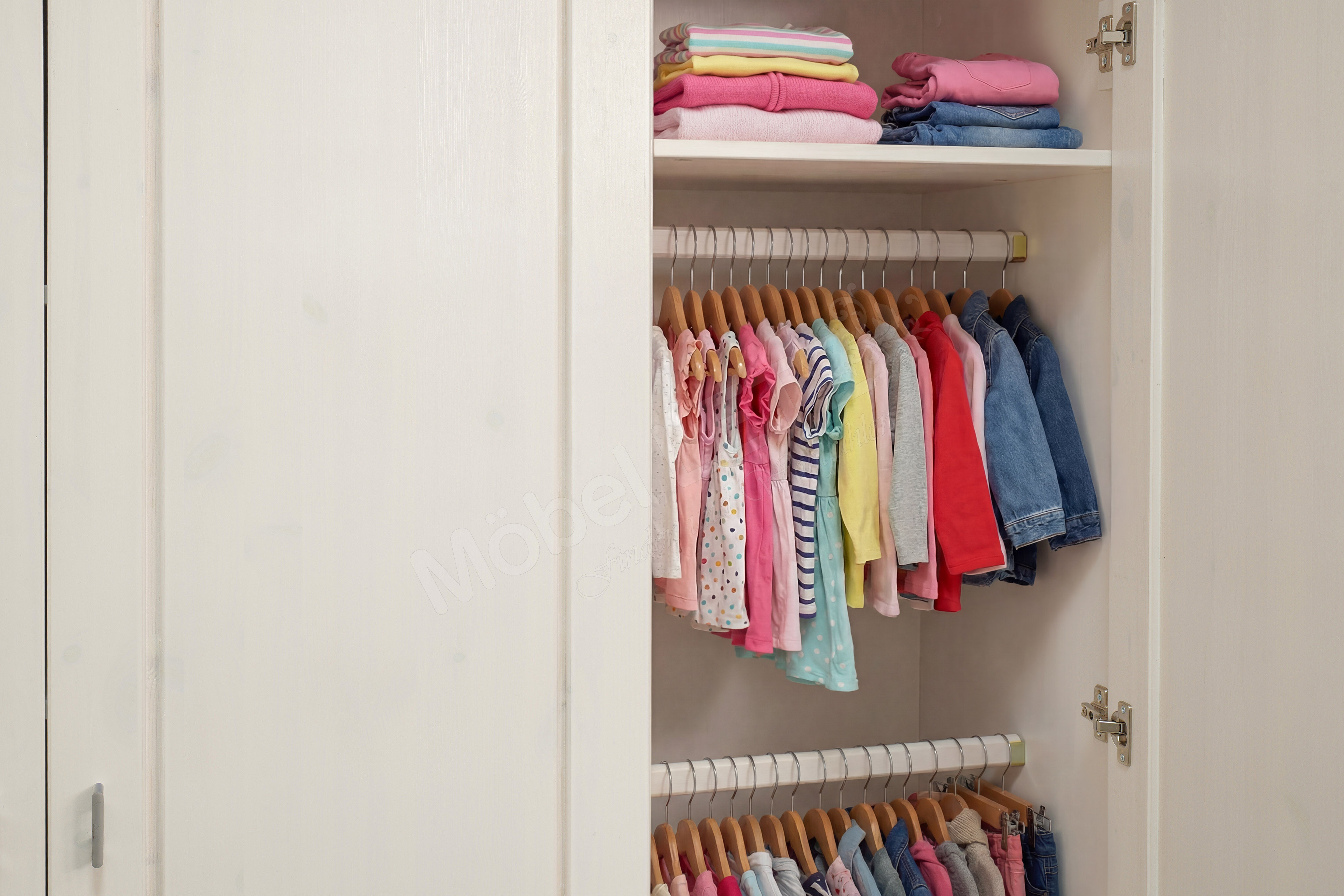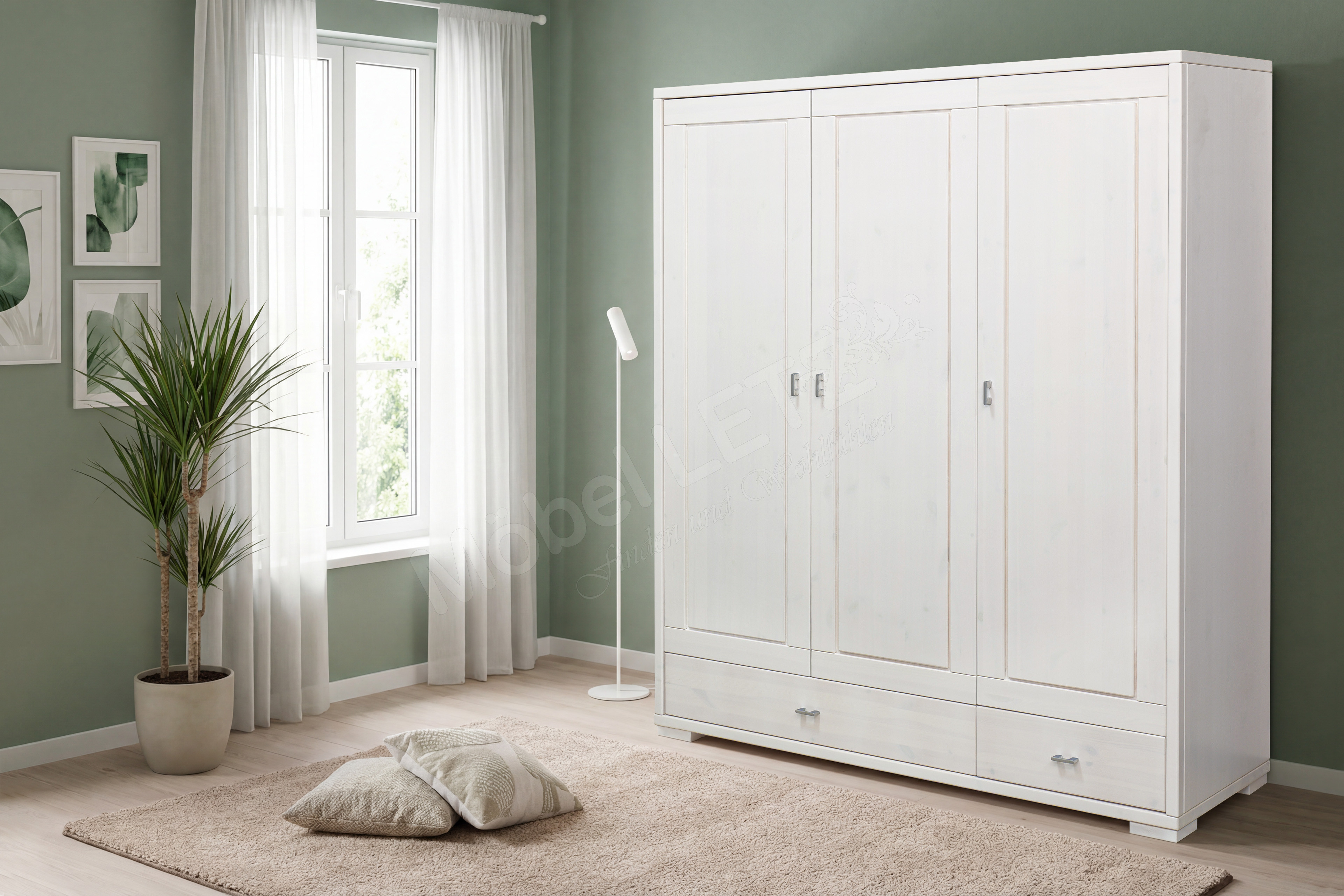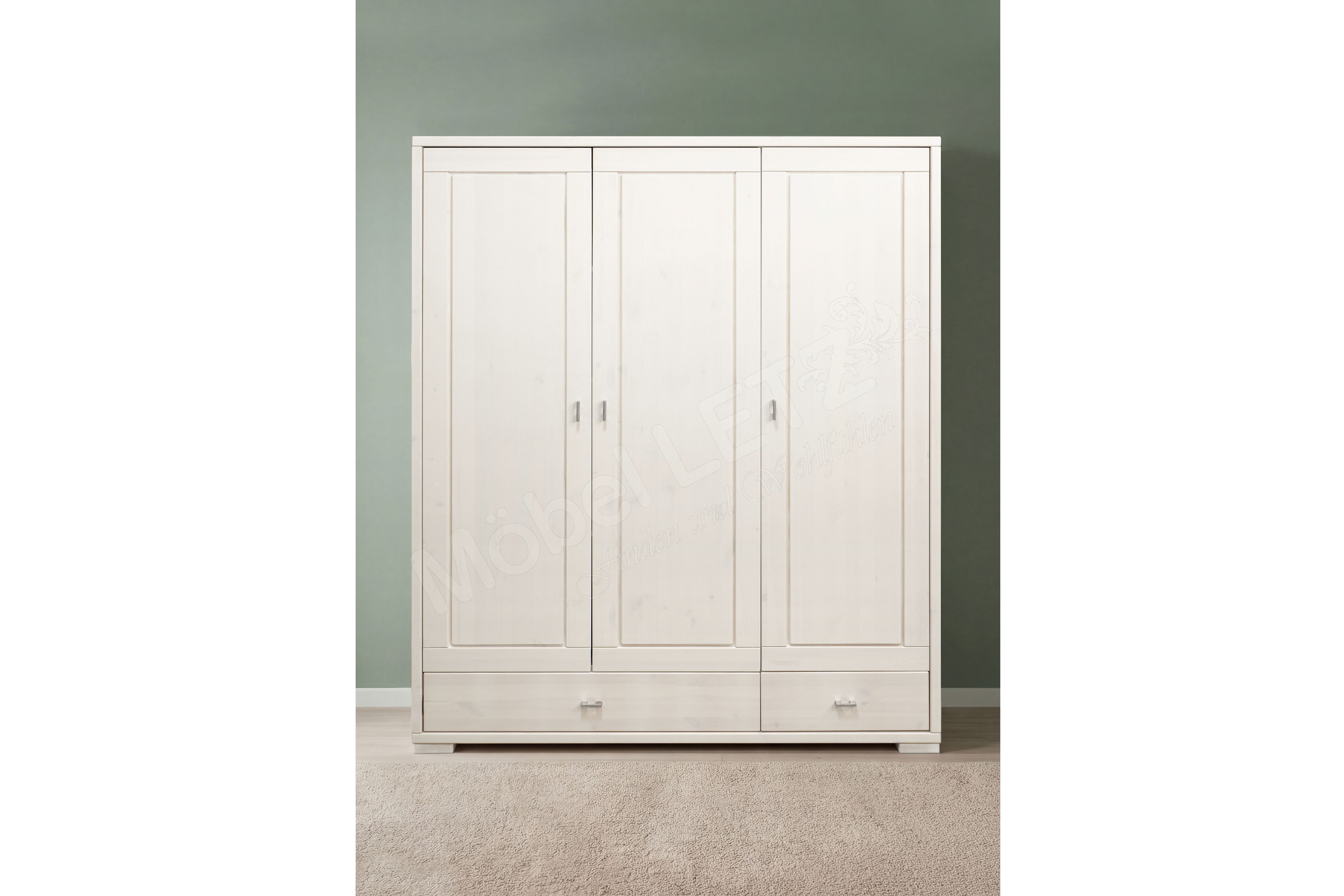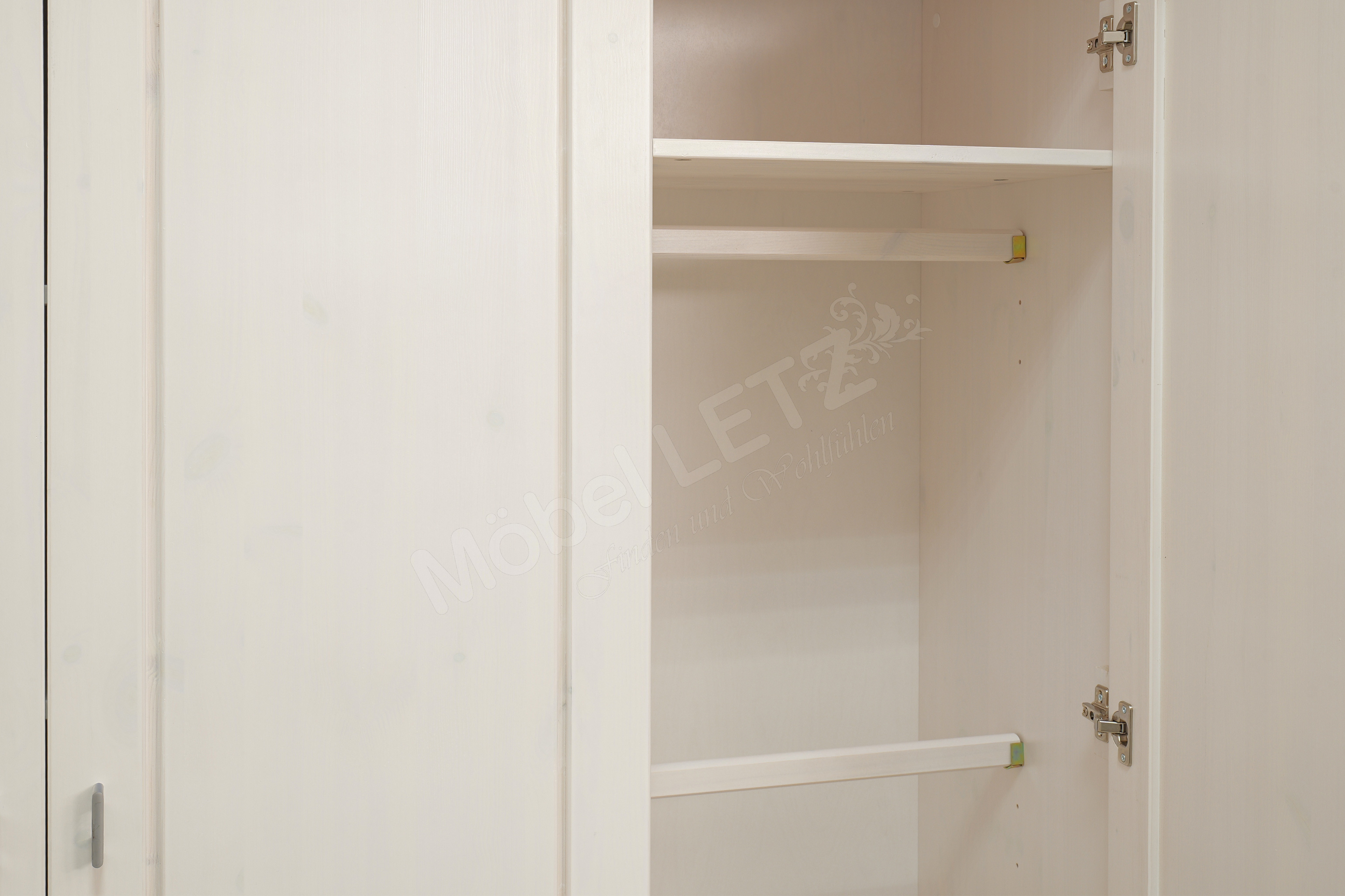 Einen klassischen Holzschrank in schlichtem Weiß stellen wir Ihnen in diesem Angebot vor. Er stammt aus dem Kinder- und Jugendzimmer-Programm Vita von Wohnglücklich by Infantil. Der 3-türige Schrank mit einer Gesamtgröße von etwa 147 x 178 x 52 cm besteht aus einem breiten Element mit drei Wäscheböden und einem schmalen Abteil mit zwei Kleiderstangen und einem Fachboden. Zudem bietet jedes Schrank-Element noch einen Schubkasten. Damit ist bereits serienmäßig ein ansehnliches Ordnungssystem gegeben, das es Ihnen erleichtert, die unterschiedlichen Kleidungsstücke sortiert unterzubringen. Natürlich kann der Kinder- und Jugendzimmerschrank auch in anderen Wohnräumen oder im Flur als Ordnungshüter genutzt werden. Mit einer Einrichtung aus der Möbel-Serie Vita der Marke Wohnglücklich sorgen Sie für ein natürliches und wohltuendes Raumklima in Ihrem Zuhause. Die Türen dieses Massivholzschrankes zum Sonderpreis sind ganz leicht verzogen - dies ist jedoch relativ unscheinbar (siehe Bilderstrecke) und hat keinen Einfluss auf den Öffnungs- und Schließvorgang.