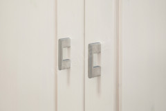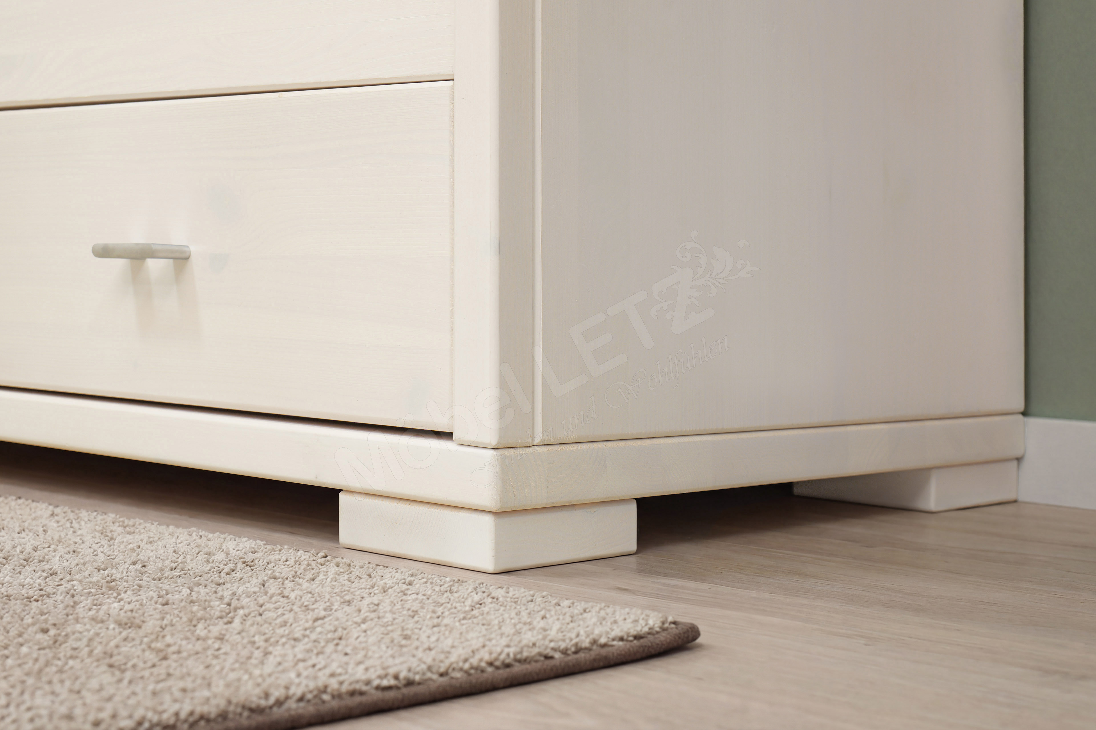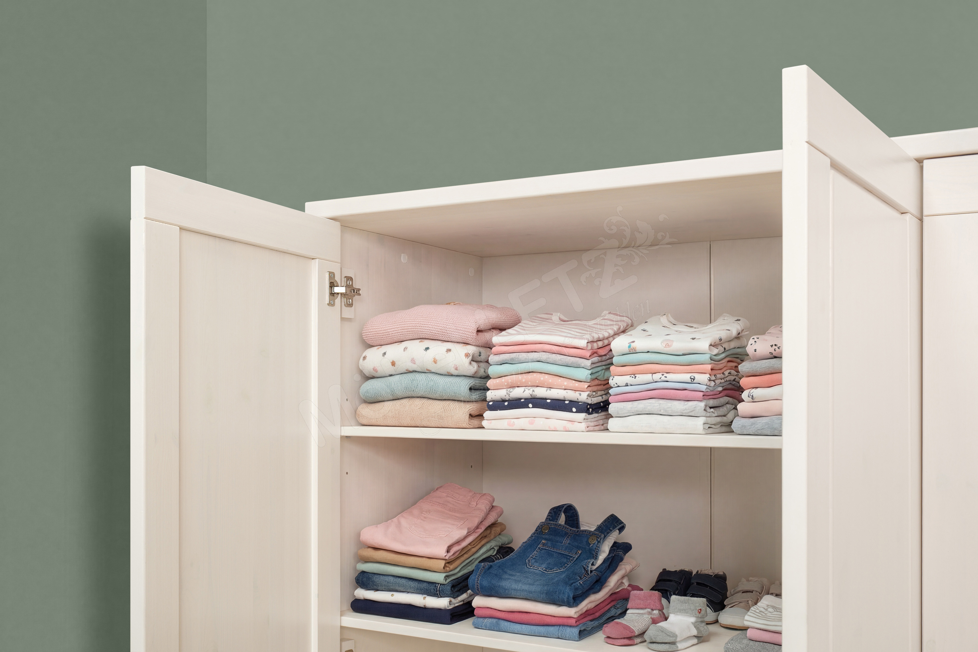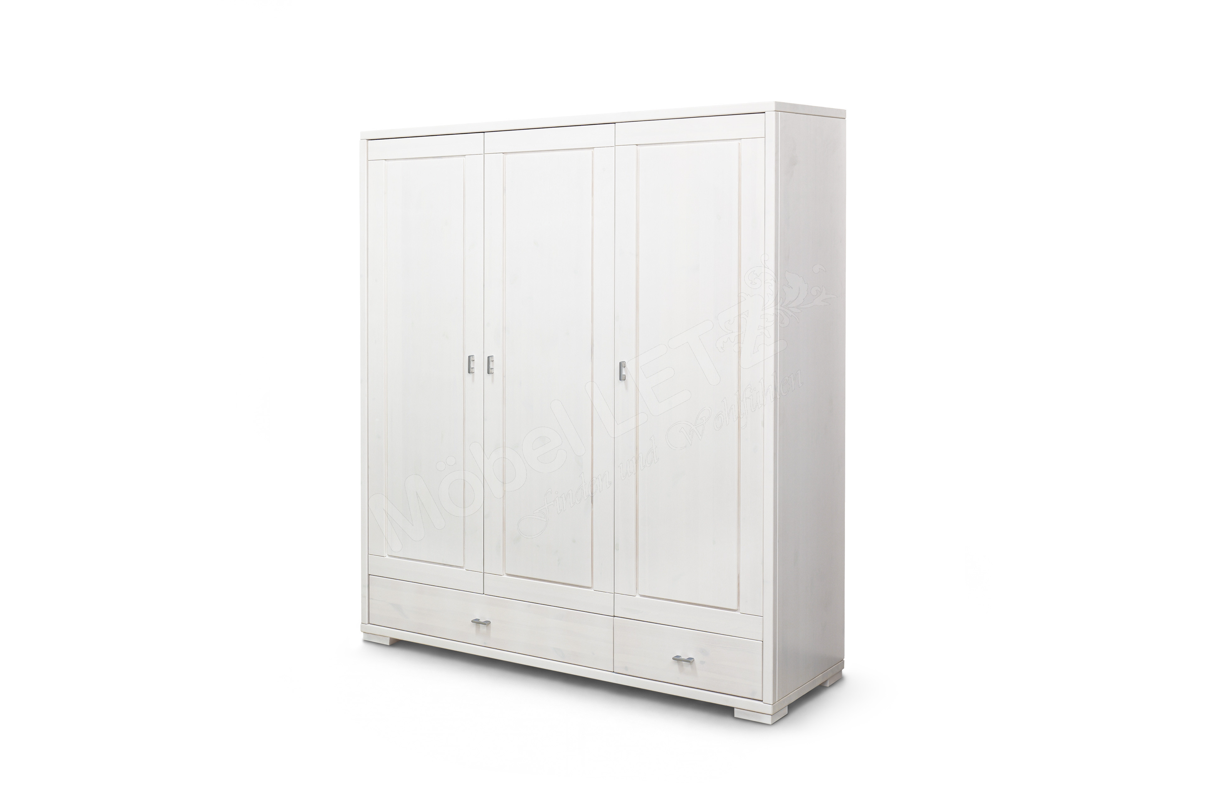 Einen klassischen Holzschrank in schlichtem Weiß stellen wir Ihnen in diesem Angebot vor. Er stammt aus dem Kinder- und Jugendzimmer-Programm Vita von Wohnglücklich by Infantil. Der 3-türige Schrank mit einer Gesamtgröße von etwa 147 x 178 x 52 cm besteht aus einem breiten Element mit drei Wäscheböden und einem schmalen Abteil mit zwei Kleiderstangen und einem Fachboden. Zudem bietet jedes Schrank-Element noch einen Schubkasten. Damit ist bereits serienmäßig ein ansehnliches Ordnungssystem gegeben, das es Ihnen erleichtert, die unterschiedlichen Kleidungsstücke sortiert unterzubringen. Natürlich kann der Kinder- und Jugendzimmerschrank auch in anderen Wohnräumen oder im Flur als Ordnungshüter genutzt werden. Mit einer Einrichtung aus der Möbel-Serie Vita der Marke Wohnglücklich sorgen Sie für ein natürliches und wohltuendes Raumklima in Ihrem Zuhause. Die Türen dieses Massivholzschrankes zum Sonderpreis sind ganz leicht verzogen - dies ist jedoch relativ unscheinbar (siehe Bilderstrecke) und hat keinen Einfluss auf den Öffnungs- und Schließvorgang.