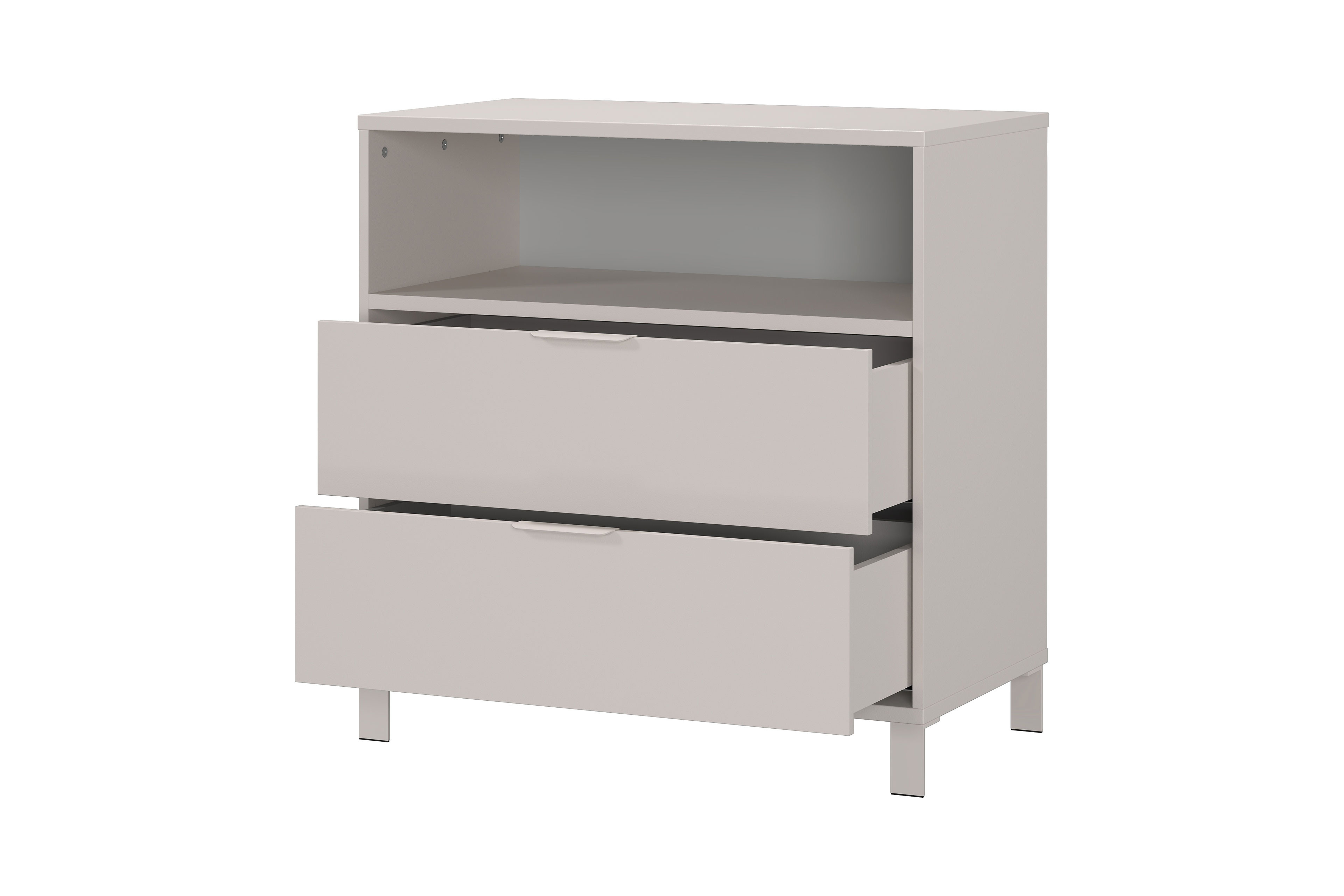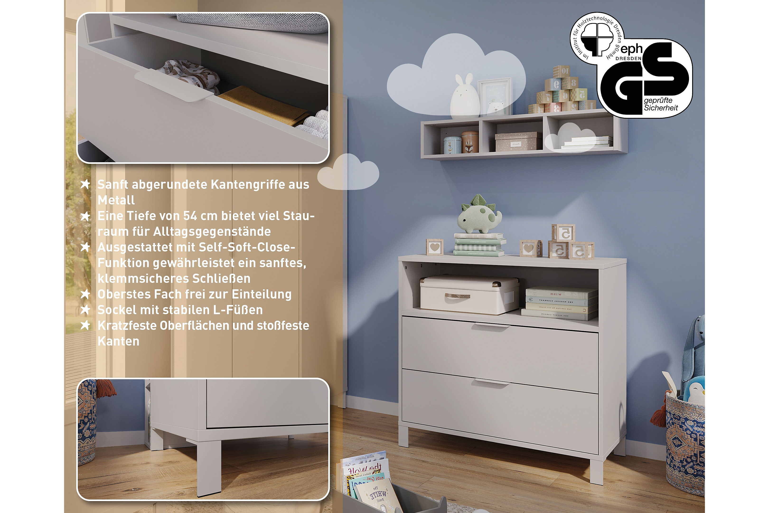 Die Wickelkommode aus dem Babyzimmer-Programm GW-Alkmaar der GERMANIA mini-Kollektion vereint praktische Alltagstauglichkeit mit einem klaren, modernen Design, das auch optisch Maßstäbe setzt. In der eleganten Farbe Kashmir gehalten, fügt sich das Möbelstück harmonisch in jede Einrichtung ein und bietet alles, was junge Familien in den ersten Jahren benötigen. Die robuste Melaminharz-Oberfläche ist besonders pflegeleicht sowie kratzfest, stoßfest, feuchtigkeitsabweisend und lichtbeständig - ideal für den täglichen Gebrauch im Kinderzimmer. Zwei geräumige Schubladen mit leiser Self-Soft-Close-Funktion sorgen für komfortables und klemmsicheres Schließen, während ein offenes Fach zusätzlichen Stauraum für Wickelutensilien oder Pflegeprodukte bietet. Edle Kantengriffe aus Metall, hochwertige ABS-Kanten und ein stabiler L-Fuß-Sockel unterstreichen die langlebige Verarbeitung und sorgen für ein sicheres Standgefühl. Der großzügige Wickelaufsatz mit einer Fläche von ca. 85 x 75 cm schafft eine ergonomische und komfortable Wickelzone und lässt sich nach der Wickelzeit spurlos entfernen, sodass die Kommode auch als stilvolles Stauraummöbel weiterverwendet werden kann. Mit durchdachter Funktion und zeitloser Gestaltung bietet die Wickelkommode GW-Alkmaar von GERMANIA eine langlebige Lösung, die perfekt auf die Bedürfnisse im Familienalltag abgestimmt ist.