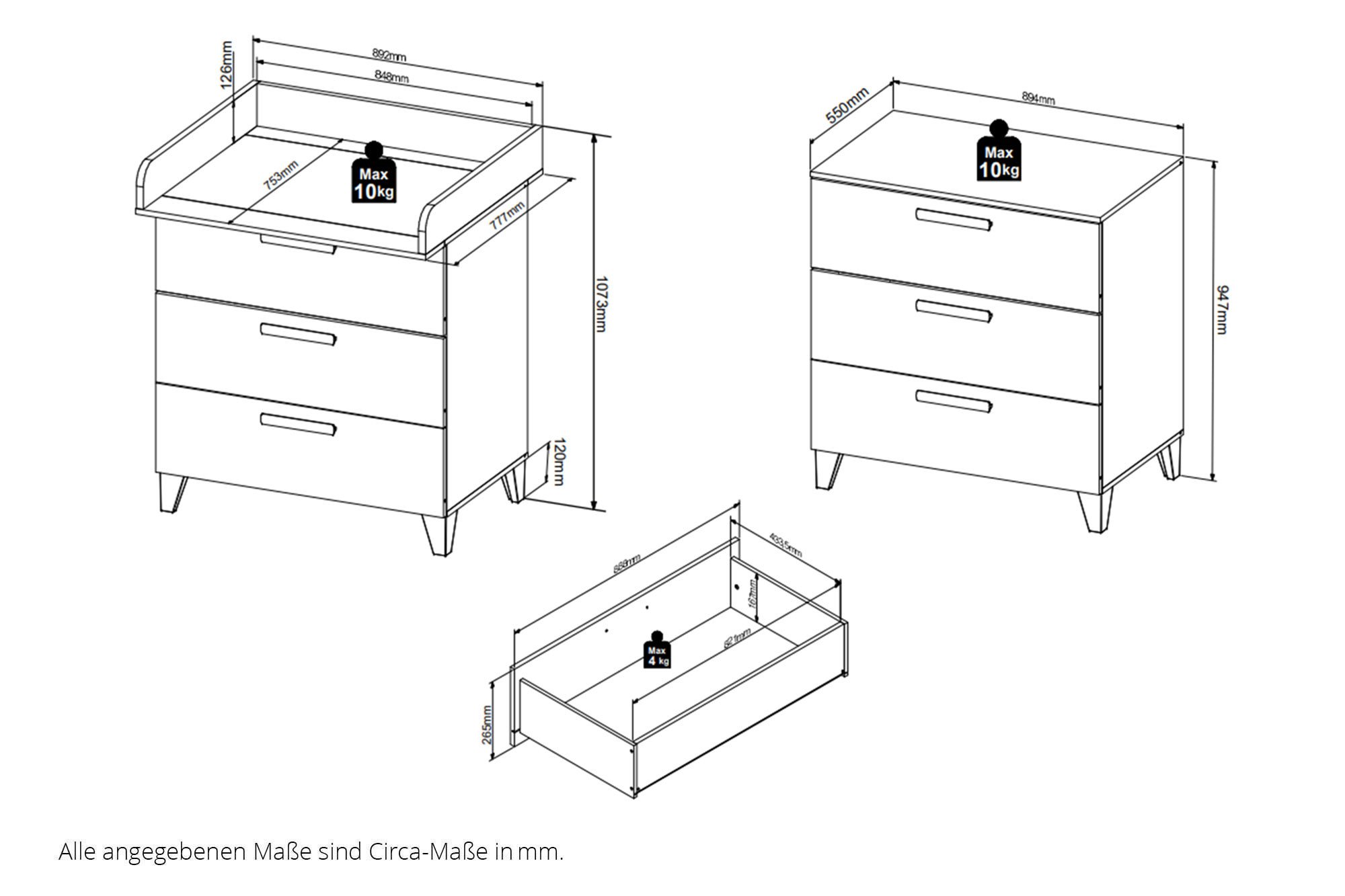 - Wickelkommode: Kommode mit abnehmbarem Wickelaufsatz, Wickelfläche ca. 85 x 75 cm, maximale Belastbarkeit 10 kg