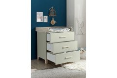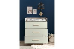 Im zarten Pastellgrün, geschmückt mit hellen Absetzungen in Aurum-Holznachbildung, stellt sich hier die schmale Wickelkommode aus dem Babyzimmer-Einrichtungsprogramm Prizzi von POL Power vor. Die auf etwa 12 cm hohen Füßen stehende Schubkastenkommode misst ungefähr 90 cm in der Breite und stellt Ihnen drei Schubfächer zur Unterbringung unterschiedlicher Dinge zur Verfügung. Diese Schubkästen haben eine maximale Belastbarkeit von jeweils vier Kilogramm, sodass hier beispielsweise Windeln, Kleidungsstücke und Pflegeutensilien bestens in greifbarer Nähe aufbewahrt werden können. Das Aufsatzelement, das nach der Wickelzeit von der Kommode abnehmbar ist, bietet Ihnen einen Wickelplatz mit einer Breite von etwa 85 cm und einer Tiefe von ungefähr 75 cm an. Sie möchten die Wickelkommode mit modelleigenen Möbelstücken wie einem Kleiderschrank und einem Kinderbett ergänzen? Schauen Sie in unseren Online-Shop oder unseren Konfigurator - hier erhalten Sie einen Überblick über alle erhältlichen Elemente des Programms Prizzy von POL Power.