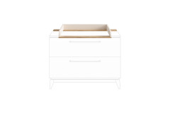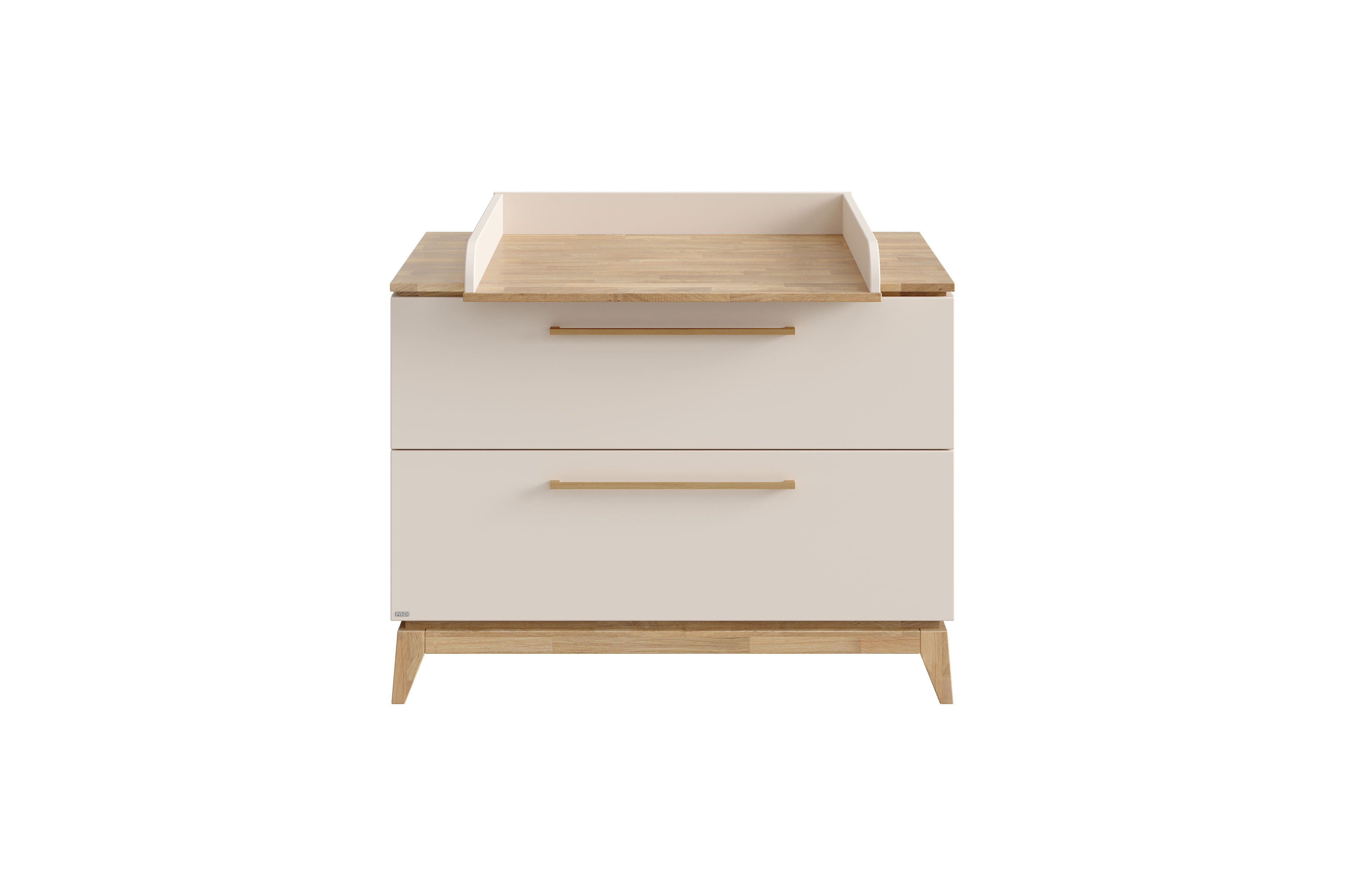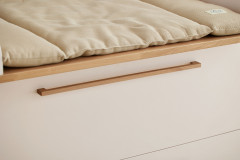Die Wickelkommode aus dem Kinderzimmer-Einrichtungsprogramm Stiene von Paidi ist passend zu den übrigen Möbelstücken designt und tritt deshalb mit cashmere-beigen Oberflächen und Absetzungen aus massivem Eichenholz auf. Der Wickeltisch besteht aus einer Kommode mit zwei offensichtlichen Schubkästen. Die obere Schublade offenbart beim Öffnen noch einen innenliegenden Auszug - so haben Sie verschiedene Unterbringungs- und Sortiermöglichkeiten. Um die großen Fächer noch übersichtlicher zu gestalten, können Sie über unsere Zusatzoptionen passende Einsätze mit Utensilienschale zum Angebot hinzufügen. Damit ein leises Schließern der Schubfächer möglich ist, verfügen sie über eine Stoppfunktion mit anschließendem Selbsteinzug. Der abgebildete Kopfschutz, der auf die hintere Wickelbarriere aufgesteckt wird, hat einen Mikrofaserbezug und kann ebenfalls über die Zusatzoptionen zum Angebot hinzugefügt werden. Alle Möbelstücke aus dem Kinderzimmer-Einrichtungsprogramm Stiene von Paidi finden Sie in unserem Konfigurator: Hier können Sie ganz nach Belieben unterschiedliche Elemente auswählen und zu einer gemütlichen Kombination zusammenstellen.