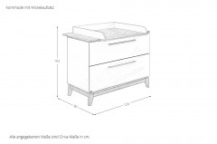 - Wickelaufsatz: Ablage hinten ca. 123,3 cm breit, Wickelfläche ca. 84,2 x 76,4 cm