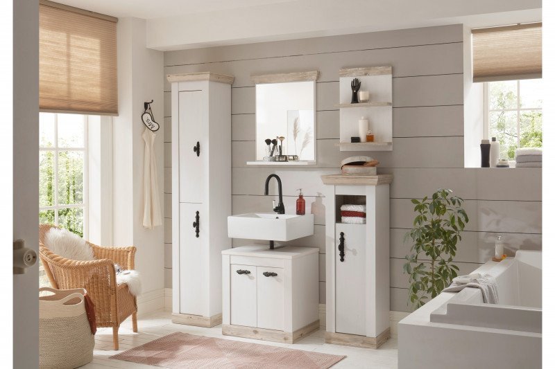 Die zwei- bzw. dreiteiligen Badmöbel-Sets lassen sich mit Schränken und Regalen erweitern, sofern diese Bestandteile nicht bereits im Angebot enthalten sind, wie es etwa bei unseren Ausstellungsstücken der Fall ist. Wichtigen Platz für Handtücher und sonstige Badtextilien bieten die Badschränke, die häufig als Hochschrank oder Midischrank daherkommen. Badezimmerschränke mit komplett geschlossener Front wirken besonders aufgeräumt, während offene Fächer die Optik auflockern. Teilweise gesellen sich zu den Türen der Badschränke noch Schubladen, sodass sich auch Nagelscheren, Wattepads und andere kleine Dinge ordentlich unterbringen lassen. Bei einem Badmöbel-Set für kleine Bäder eignen sich Hochschränke besonders, da sie das geringe Platzangebot clever nutzen. Außerdem finden Sie Badmöbel-Sets mit hängenden Möbeln, die keine Stellfläche beanspruchen, und die sich dadurch als vorteilhaft für kleine Räume auszeichnen. Ein großes Bad wirkt mit einer Badezimmerkombination mit halbhohem Midischrank, offenem Regal oder einer Kommode angenehm wohnlich. Für Spa-Feeling sorgt außerdem eine Sitzbank im Bad, die Sie mit bequemen Kissen ausstatten oder als Ablage für Ihre Badetücher nutzen können. Als Alternative zum klassischen Hochschrank ist außerdem die Kombination aus einem Unterschrank mit einem darüber platzierten Hängeschrank beliebt. Statten Sie das Badmöbel-Set durch Hinzubuchen einzelner Möbelstücke mit genau dem Stauraum aus, den Sie im Bad benötigen bzw. den die räumlichen Gegebenheiten hergeben.