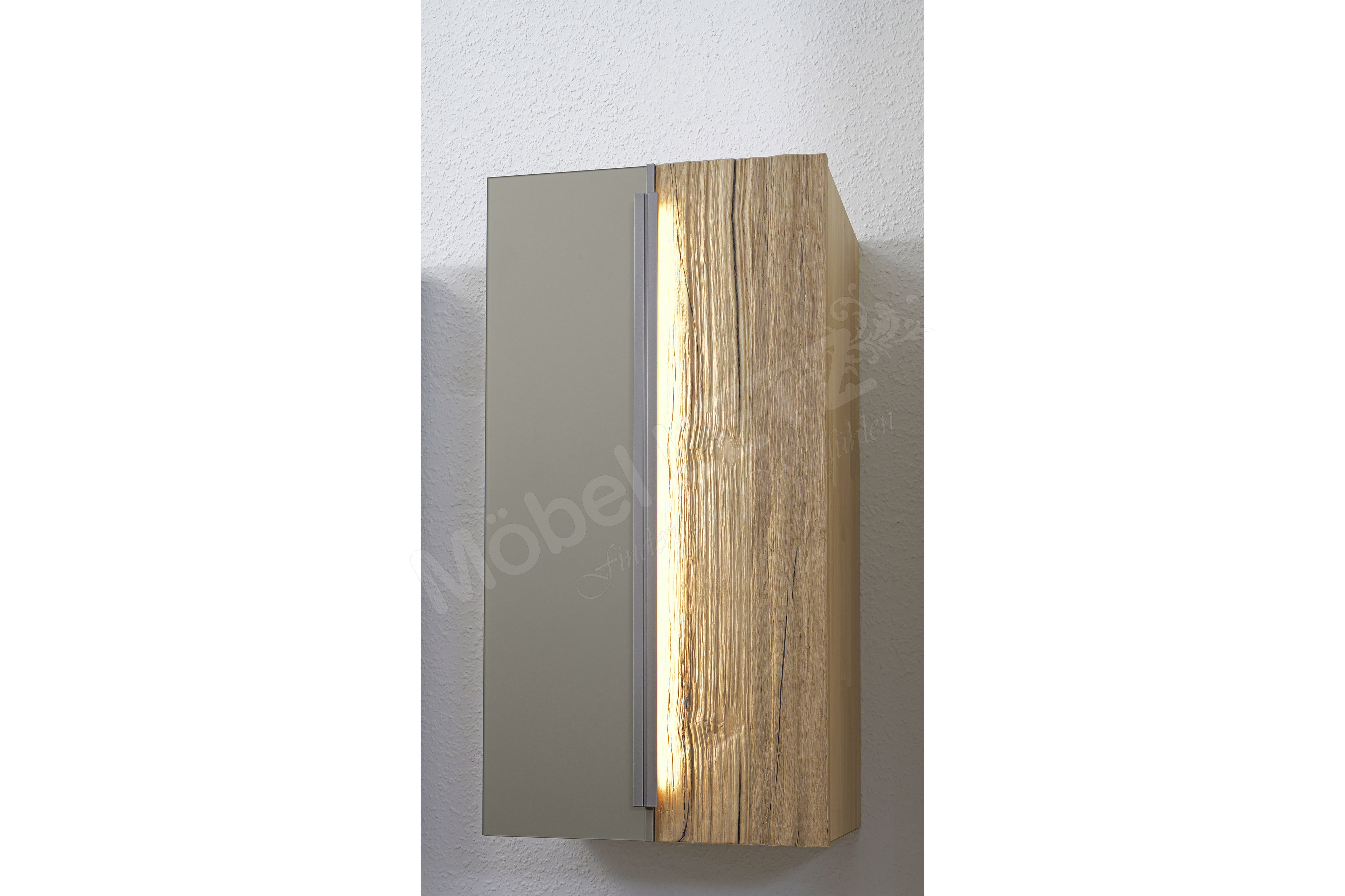 - Wandschrank mit 1 Tür (rechts angeschlagen), 2 Glaseinlegeböden, LED-Griffbeleuchtung inklusive Sensorschalter und 1 Colorglasfront (linke Türseite) und 1 Spaltholzfront (rechte Türseite)