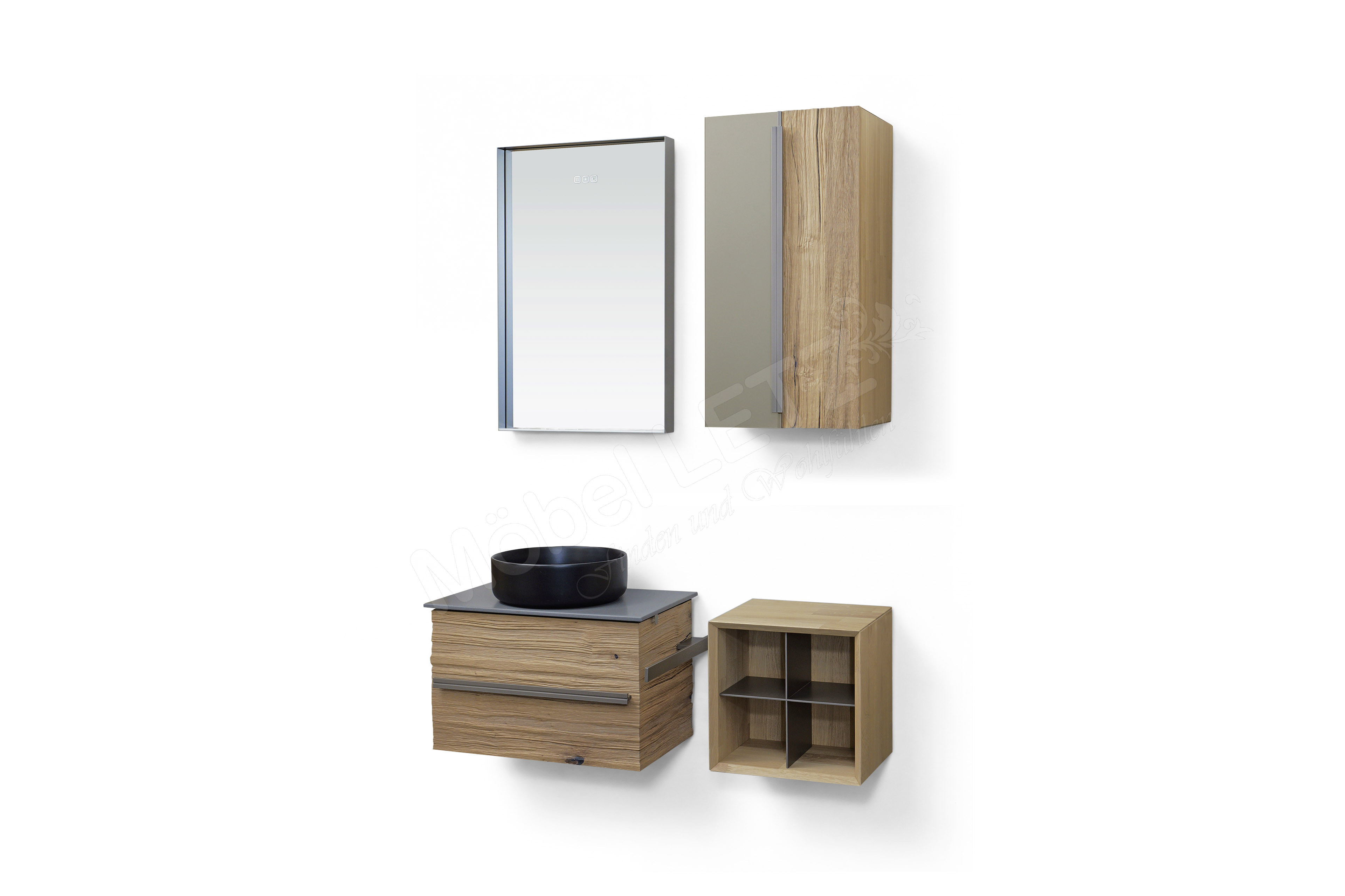 Badezimmer von Musterring - Modell Jarin Altholz-Eiche mit Colorglas titan und Aufsatzwaschtisch Jarin | das volle Verwöhnprogramm