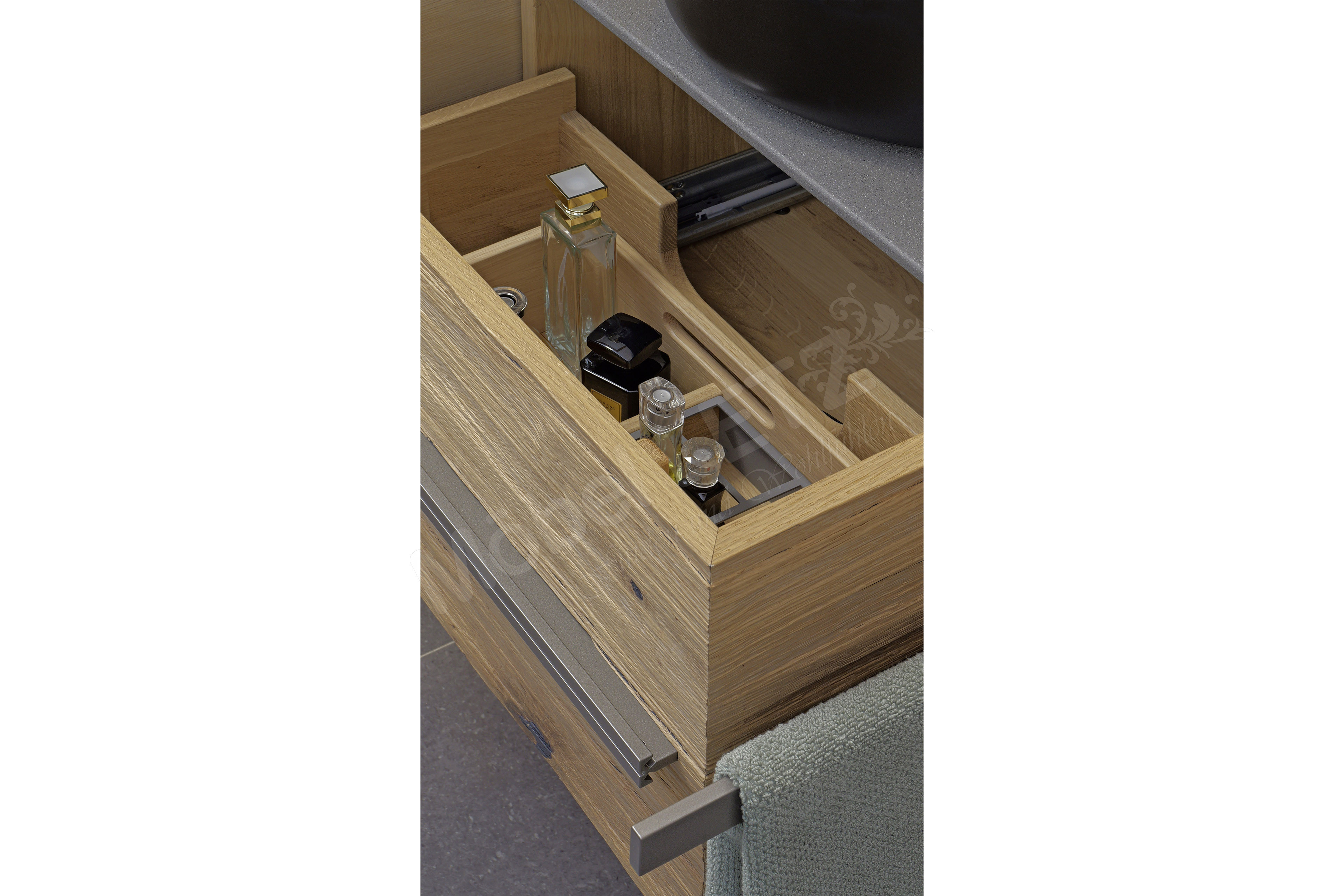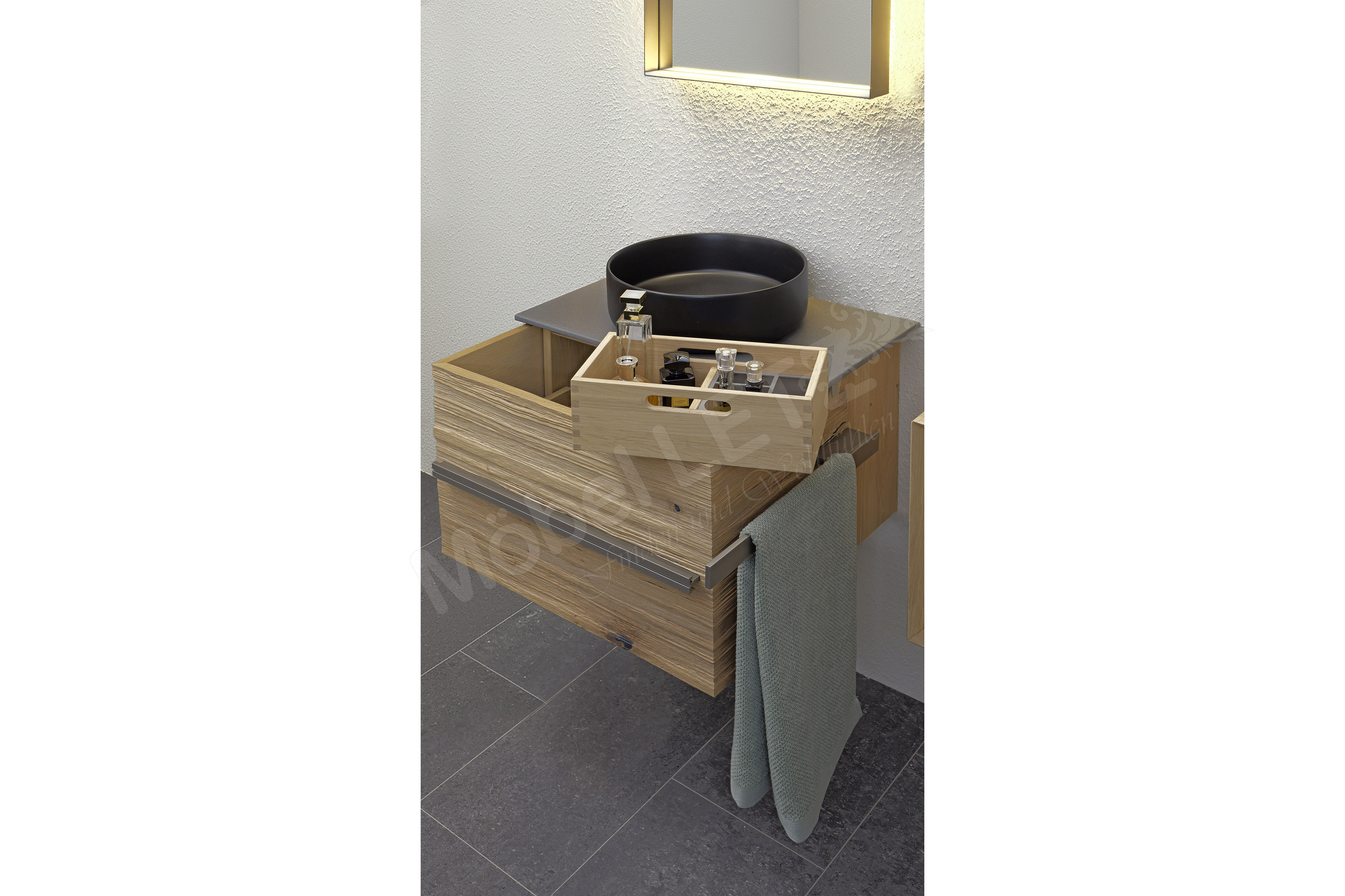 - Waschtischunterschrank mit 2 Schubkästen mit Spaltholzfront und LED-Griffbeleuchtung nach oben und unten inklusive Sensorschalter, Utensilienbox klein, Utensilienbox groß, Kosmetikeinsatz fein und Kosmetikeinsatz grob