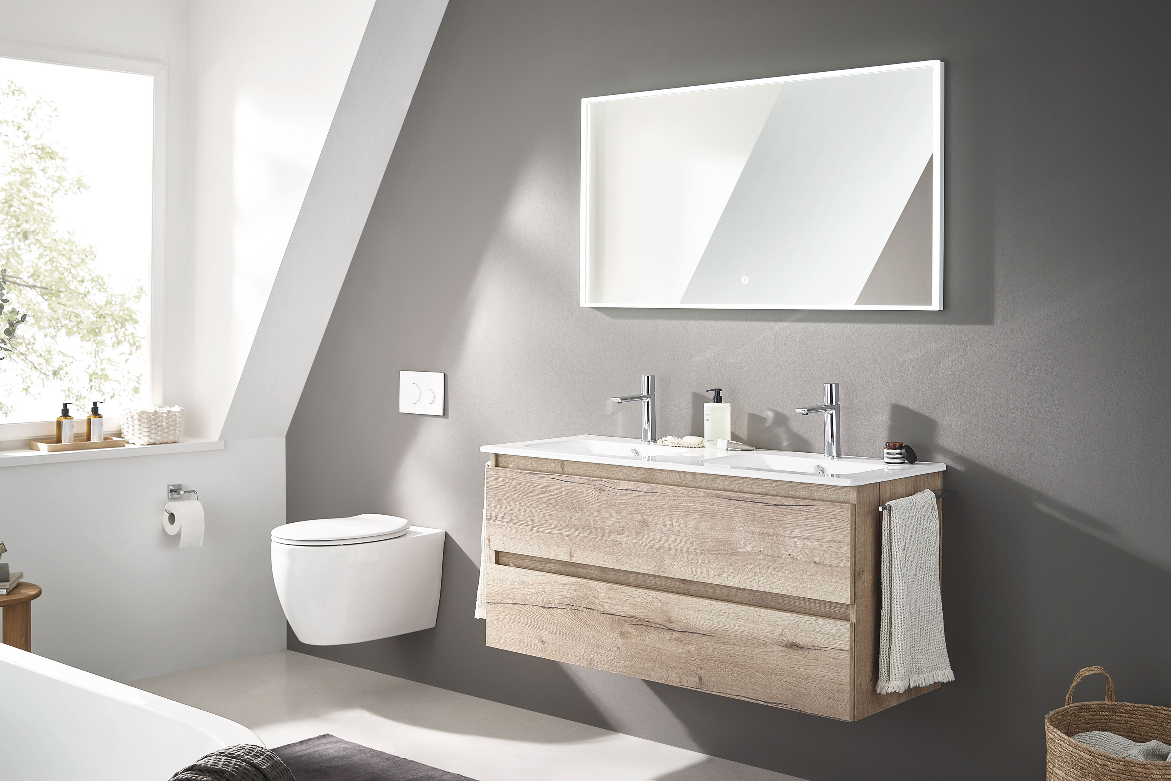 Puris hat mit Cuba ein funktionales und zugleich elegantes Badezimmer-Set entworfen, welches in der anschmiegsamen Ausführung Halifax Eiche zu Ihnen kommt. Mit diesem hochwertigen Waschtischunterschrank inklusive Doppelwaschtisch entscheiden Sie sich für ein zeitloses Design, durchdachte Stauraumlösungen und höchsten Komfort im Alltag. Der schwebend montierte Waschtischunterschrank besticht durch seine warme Optik und schafft zugleich ein luftiges Raumgefühl. Die geräumigen Auszüge bieten Ihnen viel Stauraum für Handtücher, Pflegeprodukte und Badutensilien. Ausreichend Platz für Sie und Ihre Familie bietet der großzügige Doppelwaschtisch – ideal für den entspannten Start in den Tag und eine komfortable Nutzung zu zweit. Die pflegeleichte, langlebige Oberfläche überzeugt durch ihre Widerstandsfähigkeit und einfache Reinigung. Ein besonderes Highlight ist der hochwertige Flächenspiegel mit umlaufendem LED-Acrylrahmen. Durch drei wählbare Stufen lässt sich die Lichtfarbe individuell einstellen – von warmweiß über neutralweiß bis kaltweiß – und passt sich so optimal Ihren Bedürfnissen an, ob für entspannte Abendstunden oder präzises Styling am Morgen. Die integrierte Spiegelheizung sorgt zudem für eine klare Sicht, selbst nach dem Duschen – lästiges Beschlagen gehört der Vergangenheit an. Mit diesem Badmöbel-Set Cuba von puris investieren Sie in langlebige Qualität, modernes Design und maximalen Komfort – für ein Badezimmer, das Sie jeden Tag aufs Neue begeistert.
