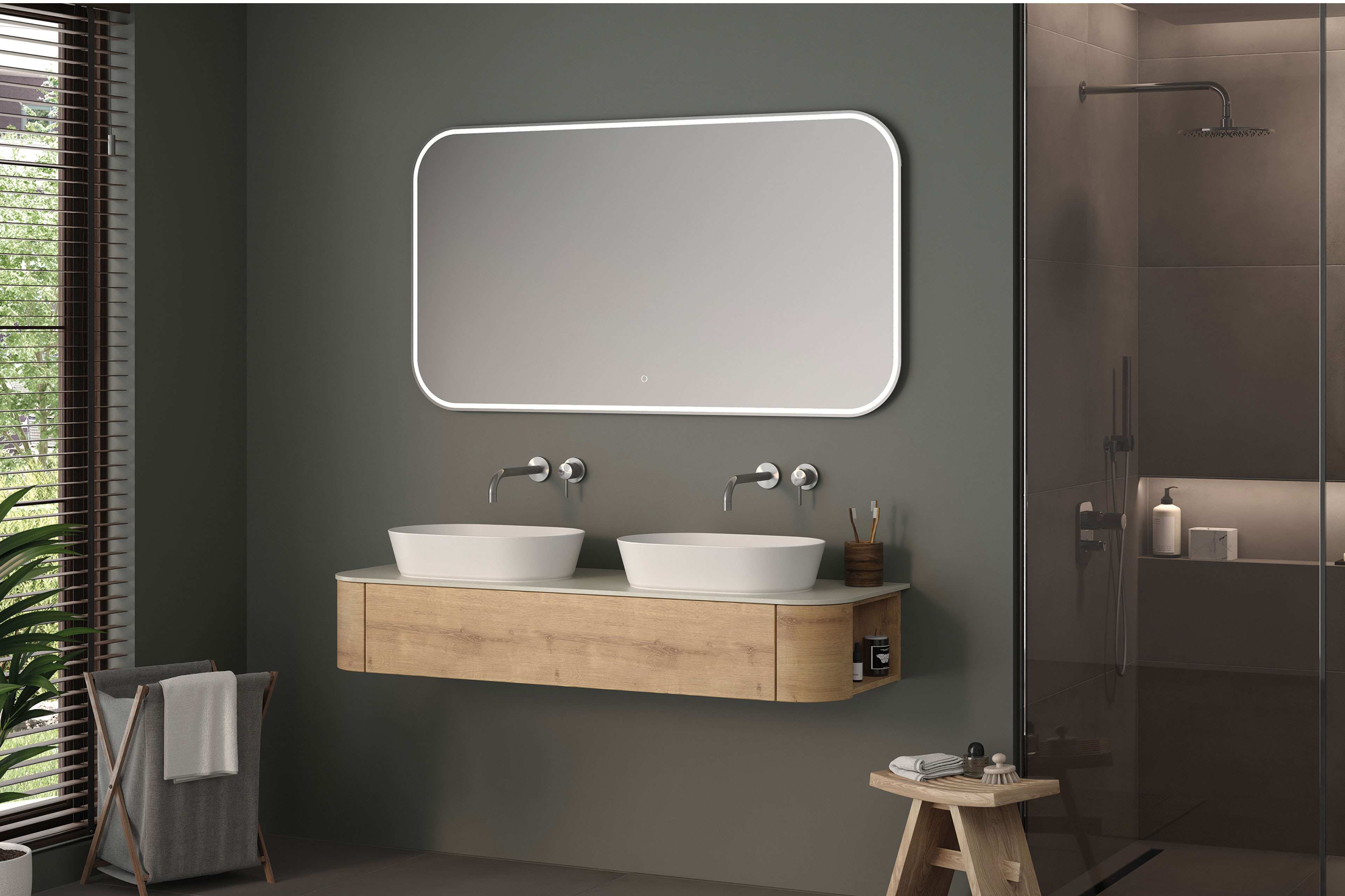 Verleihen Sie Ihrem Badezimmer mit Veluna von puris eine klare, moderne Ausstrahlung, welche Design und Funktionalität auf höchstem Niveau vereint. Im Grundangebot erhalten Sie einen hochwertig verarbeiteten Waschtischunterschrank in schwebender Optik. Die klare Linienführung und das natürliche Holzdekor schaffen eine warme, zeitlose Atmosphäre und sorgen gleichzeitig für ein aufgeräumtes Gesamtbild. Großzügiger Stauraum bietet Ihnen ausreichend Platz für Ihre Badutensilien und unterstützt Sie dabei, Ordnung stilvoll zu halten. Die edle Porzellankeramikplatte in der Ausführung Shilin Slate Finish bildet das Herzstück dieses Sets. Ihre fein strukturierte, schieferähnliche Oberfläche überzeugt nicht nur optisch, sondern auch durch ihre hohe Widerstandsfähigkeit und Langlebigkeit. Auf dieser exklusiven Platte ruhen zwei ovale Keramik-Aufsatzwaschbecken in klassischem Weiß. Ihre sanft gerundete Form setzt einen eleganten Kontrast zur klaren Linienführung des Unterschranks und bietet Ihnen gleichzeitig großzügigen Komfort im täglichen Gebrauch. Optional ist ein moderner Flächenspiegel erhältlich, der das Ensemble perfekt ergänzt. Die integrierte LED-Beleuchtung sorgt für eine gleichmäßige, angenehme Ausleuchtung – ideal für Ihre tägliche Pflegeroutine. Die zusätzliche Emotionbeleuchtung schafft eine stimmungsvolle Atmosphäre in Ihrem Badezimmer, während die integrierte Spiegelheizung das Beschlagen verhindert und Ihnen jederzeit freie Sicht garantiert. Bestellen Sie sich Veluna von dem Hersteller puris - ein Badezimmer-Set, das Sie jeden Tag aufs Neue genießen werden.