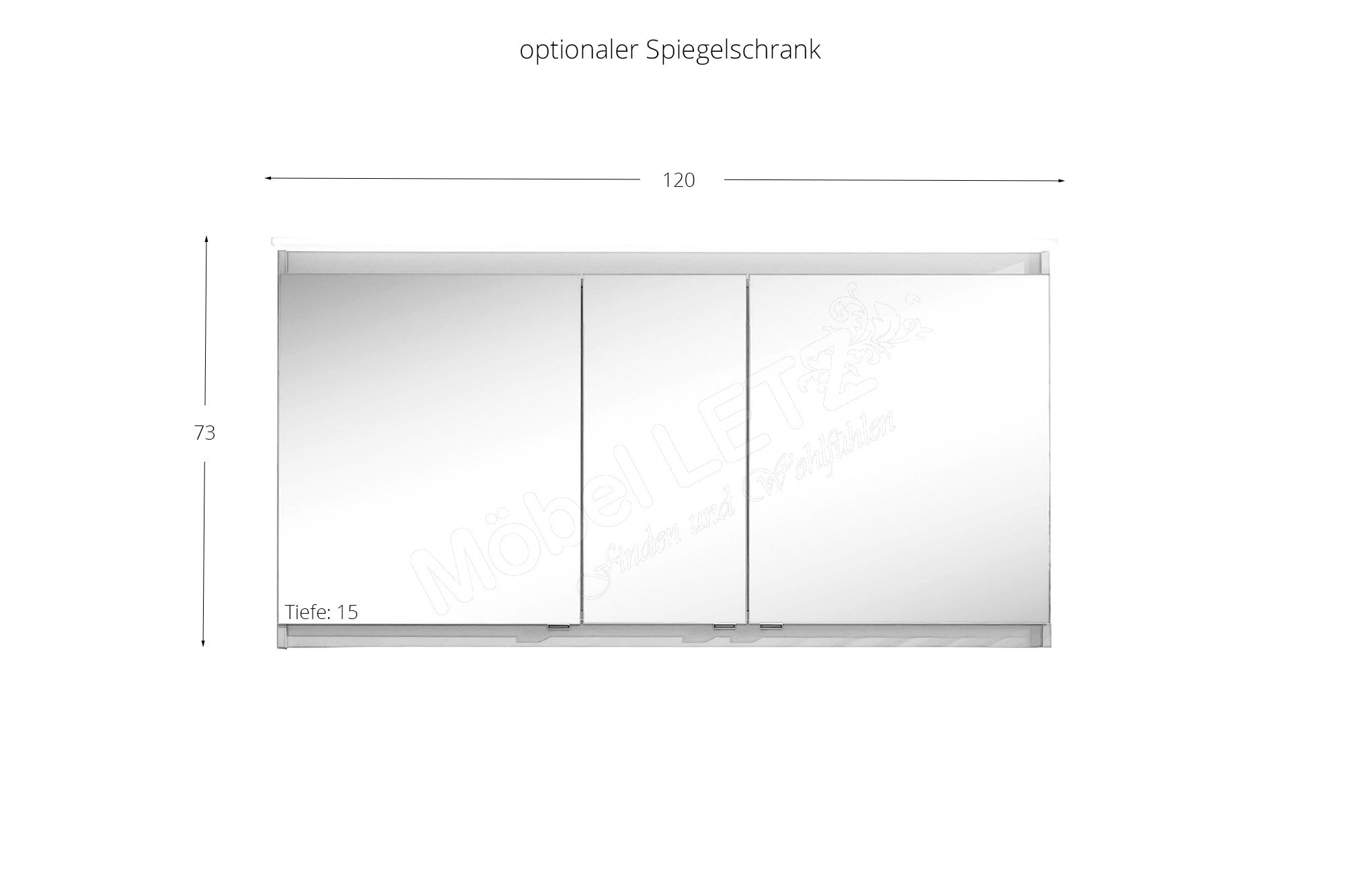 Mit 3 Doppelspiegeltüren, 2 Mittelwänden, 6 Glasfachböden, 1 LED-Flächenleuchte oben mit 1 LED-Converter und 1 Schalter-Steckdosen-Element (Art-Nr. S2A4112GE)
