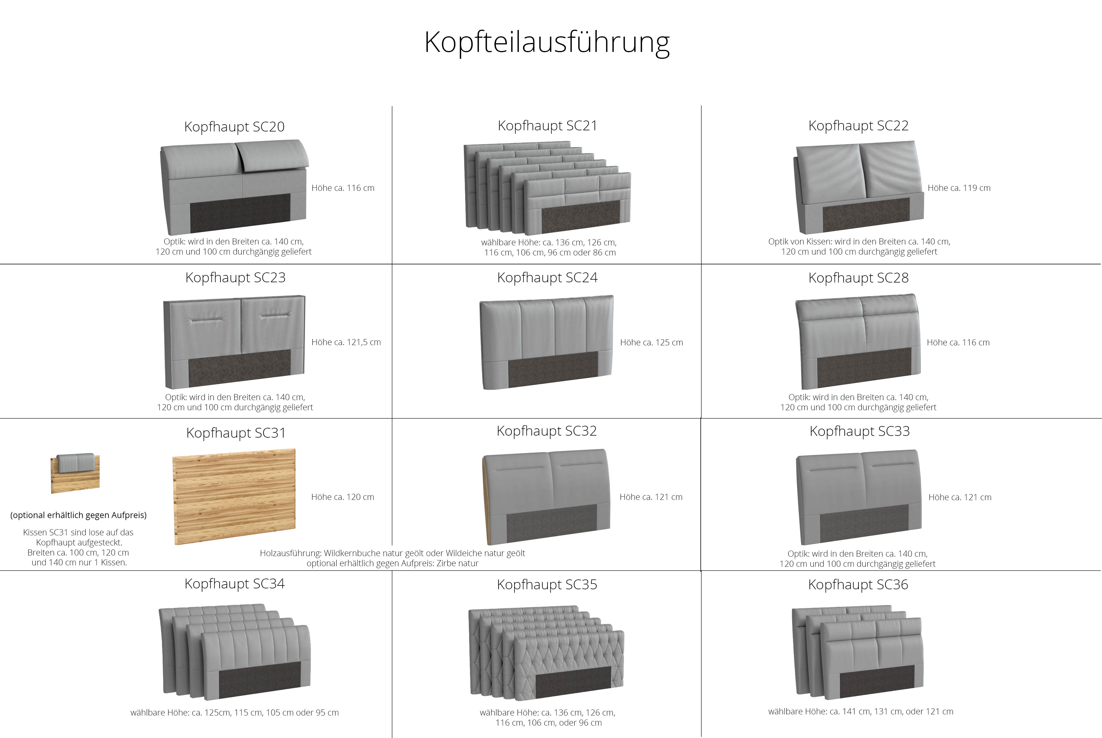 Hinweis! Holzart Kopfteile SC31, SC32 wählbar in Wildkernbuche natur geölt oder Wildeiche natur geölt. Gegen Aufpreis auch in Zirbe natur 500 geölt erhältlich. - optionale Fußausführung:
