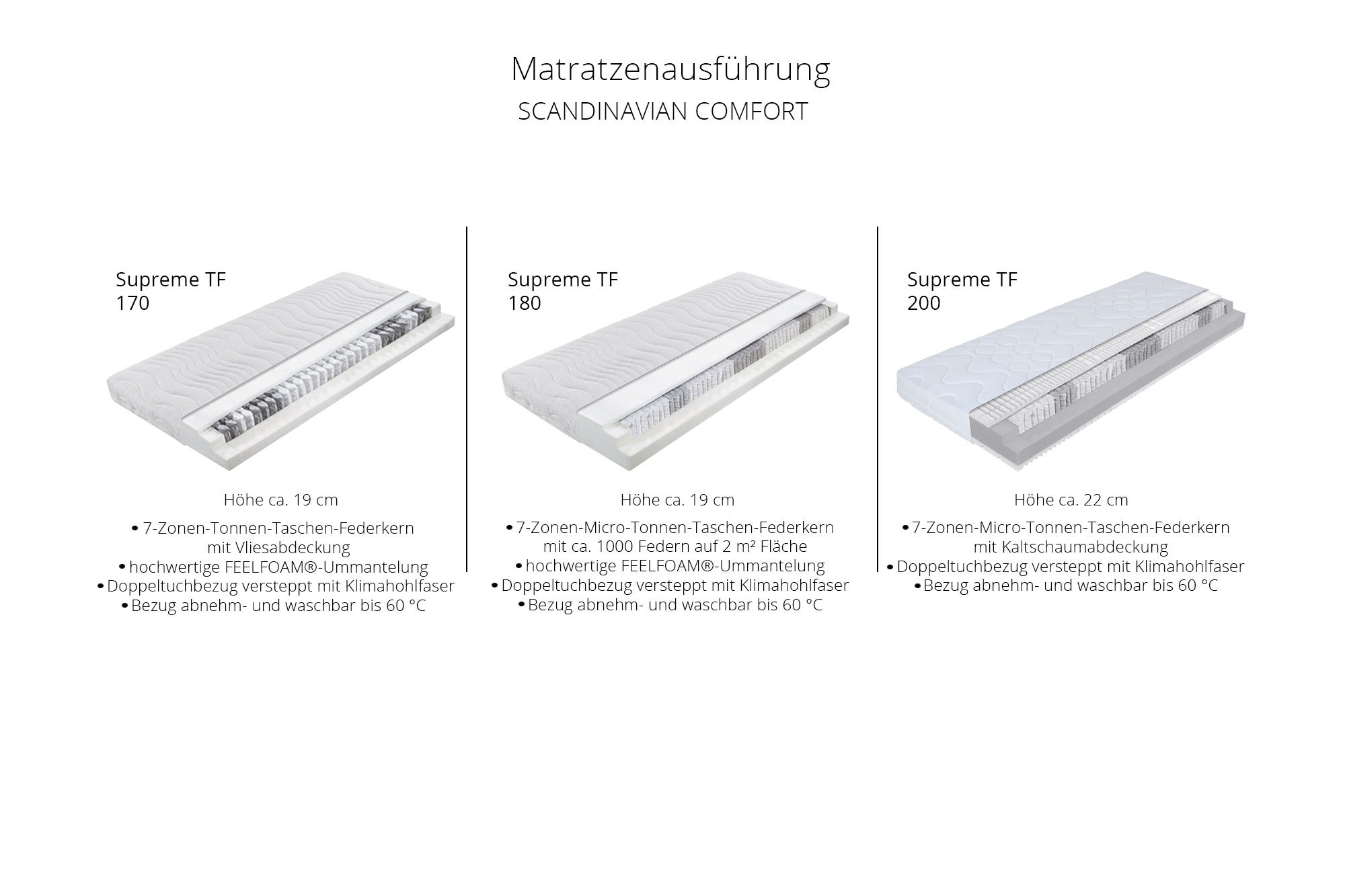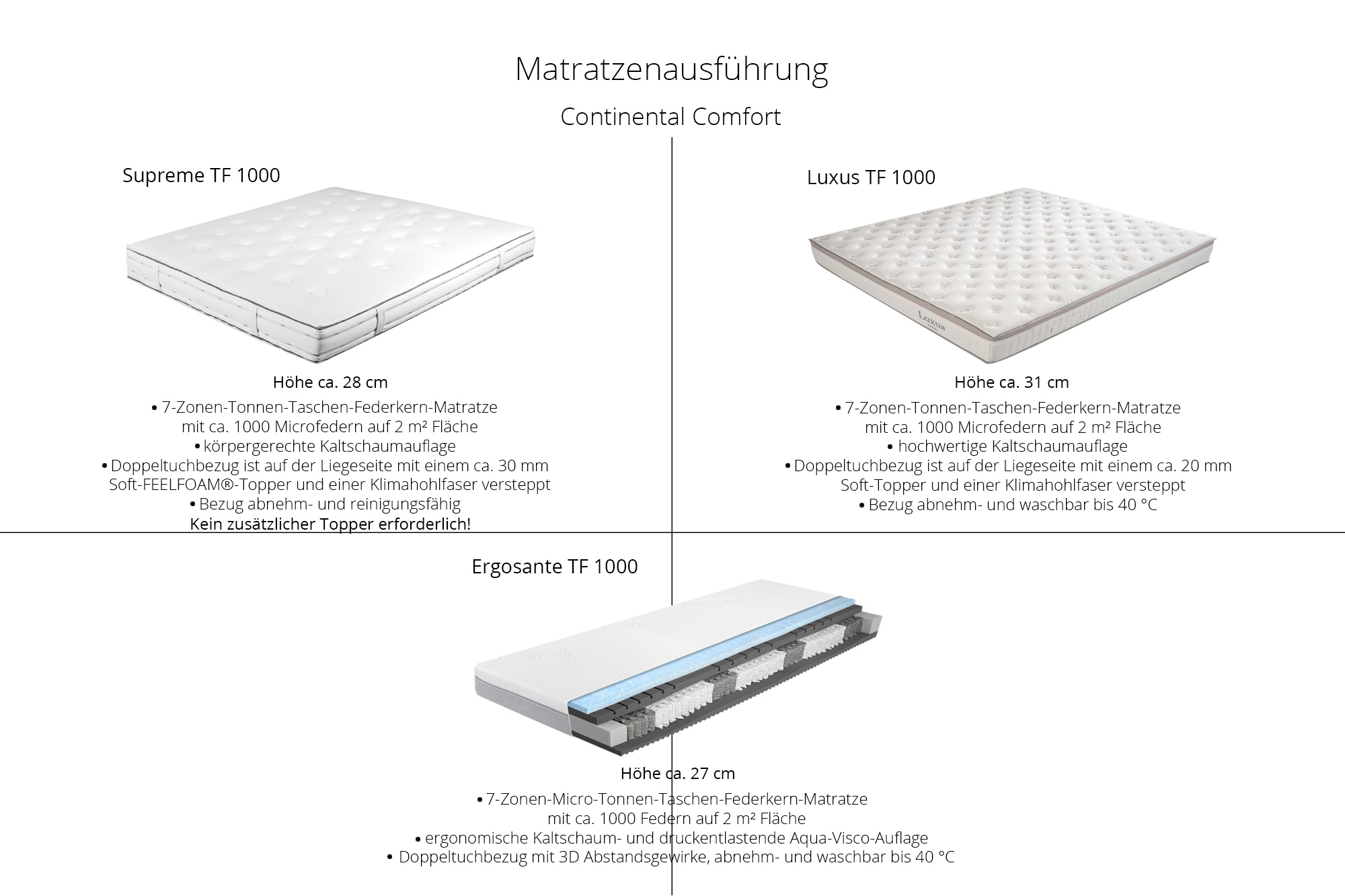 - Matratze: Supreme TF 1000 - 7-Zonen-Tonnen-Taschen-Federkern (ca. 1000 Federn auf 2 m²) mit Soft-Feelfoam®-Topper, Doppeltuchbezug mit Klimaborder, Bezug dank 4-seitigem Reißverschluss abnehmbar und reinigungsfähig