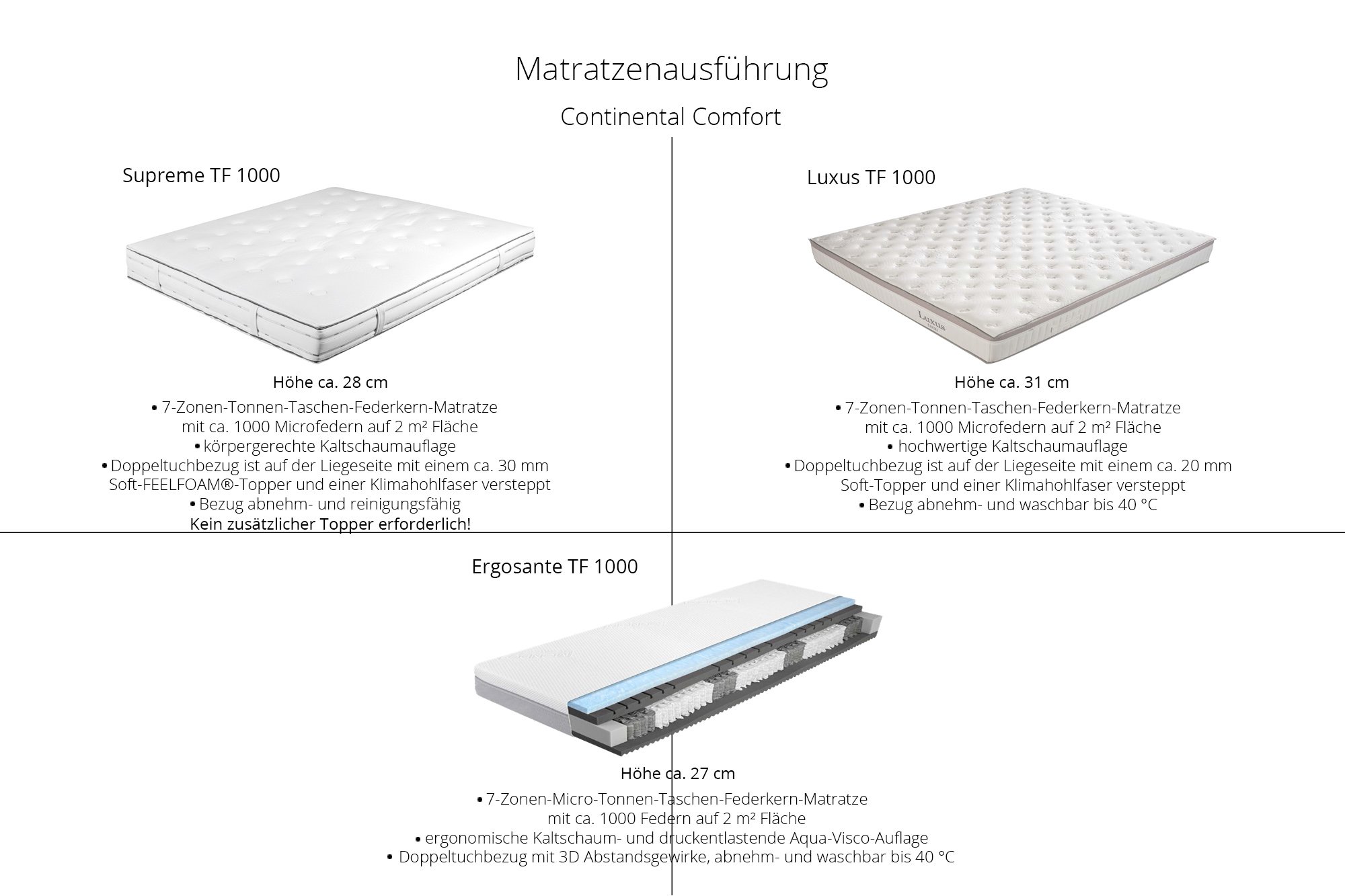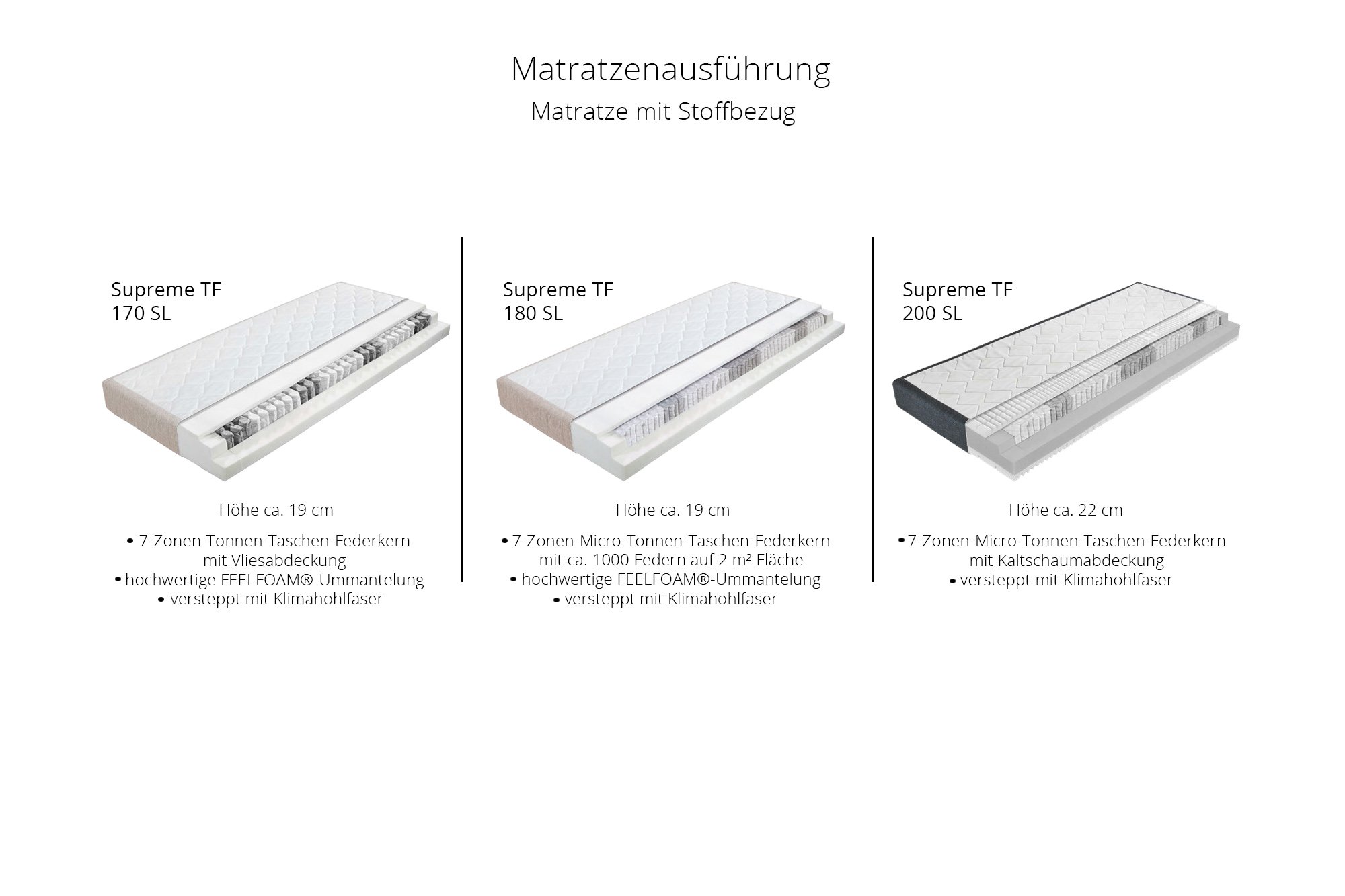 - Matratze: Supreme TF 170 SL - punktelastischer 7-Zonen-Tonnen-Taschen-Federkern mit hochwertiger FEELFOAM®-Ummantelung, Stoffbezug mit beidseitigem Gradlspiegel, beidseitig versteppt mit feuchtigkeitsregulierender Klimahohlfaser