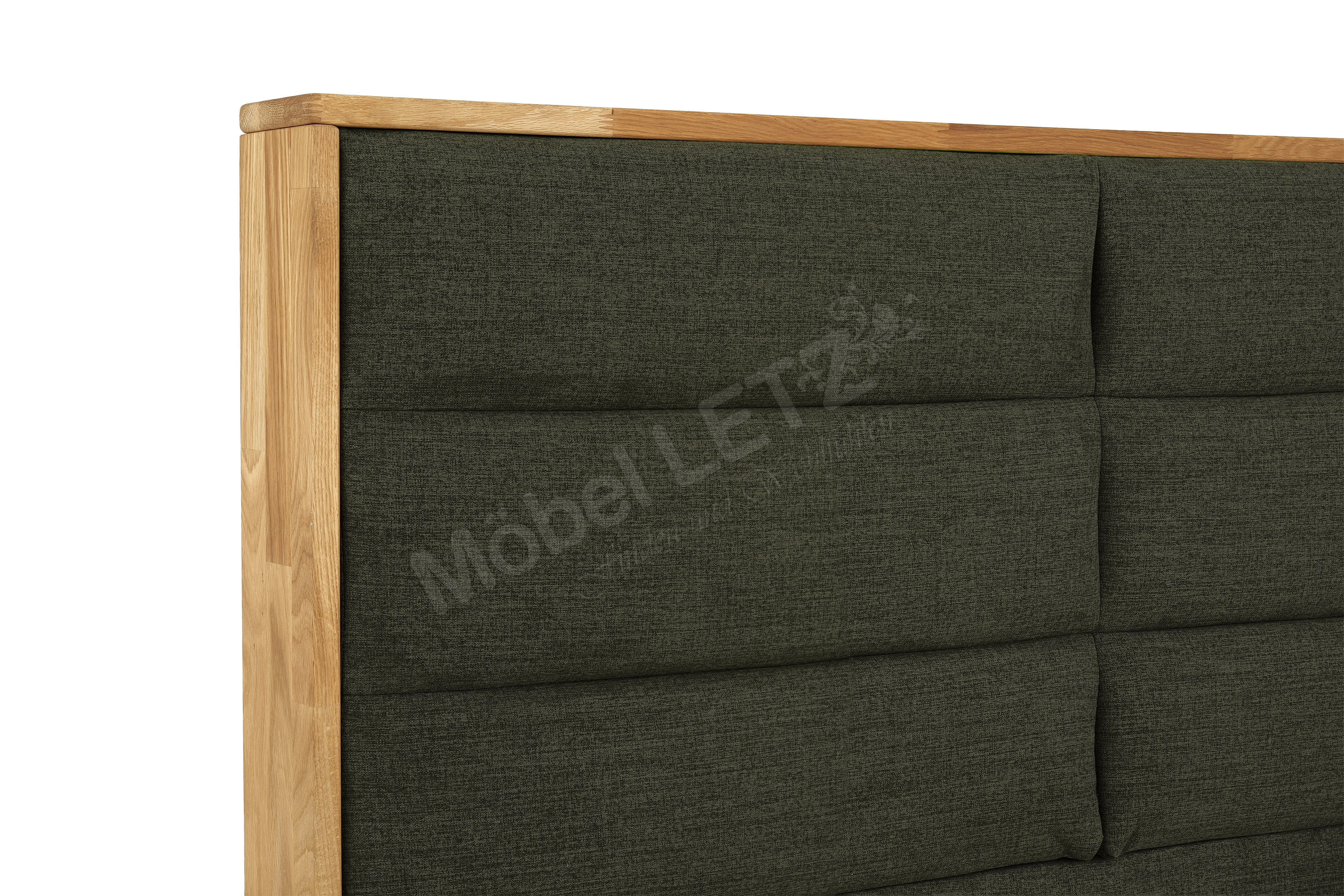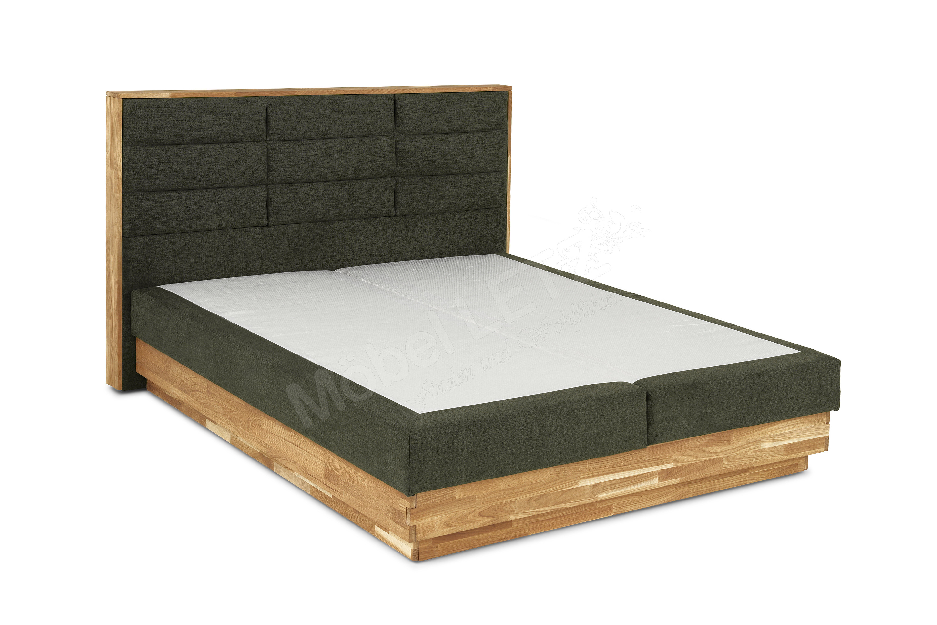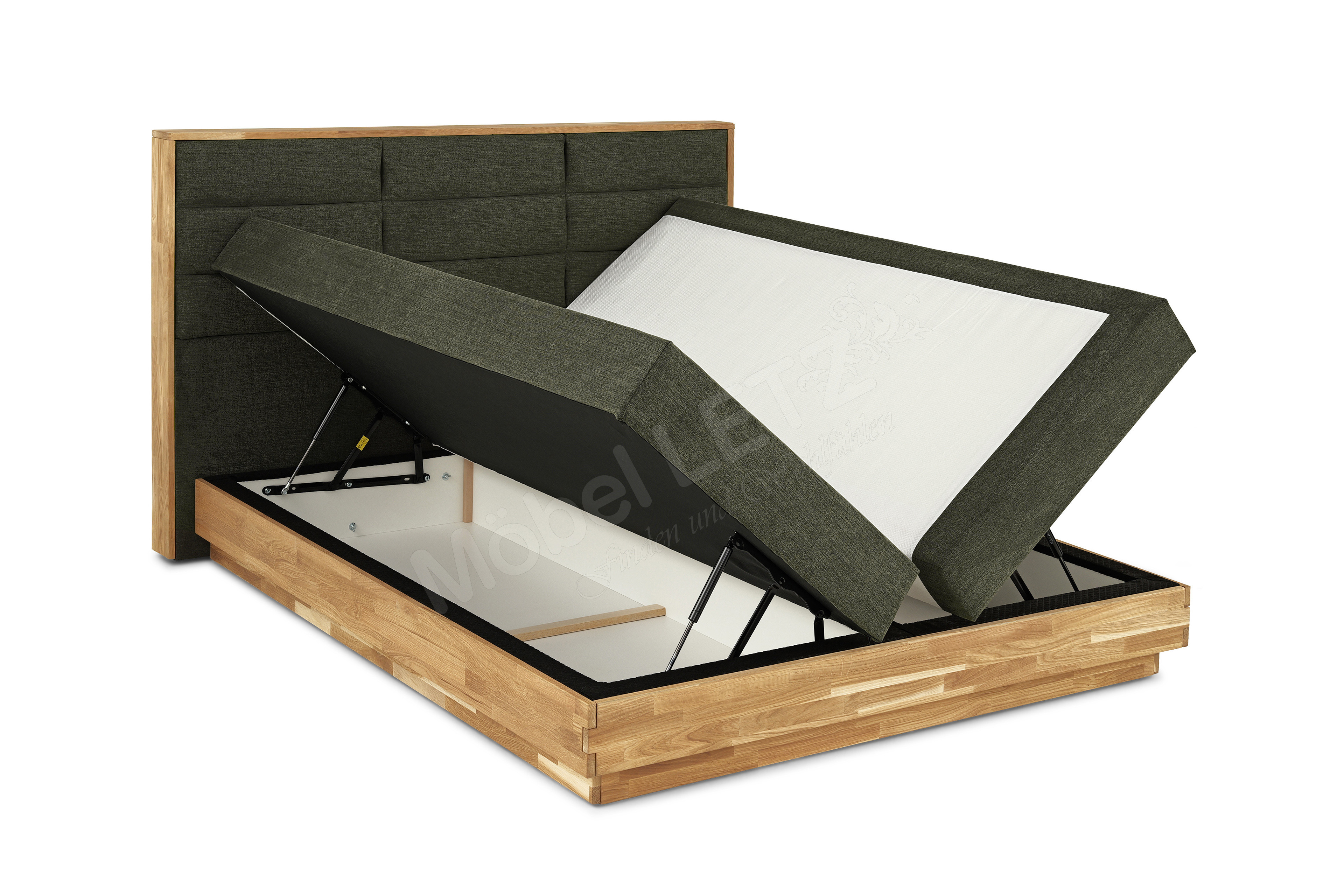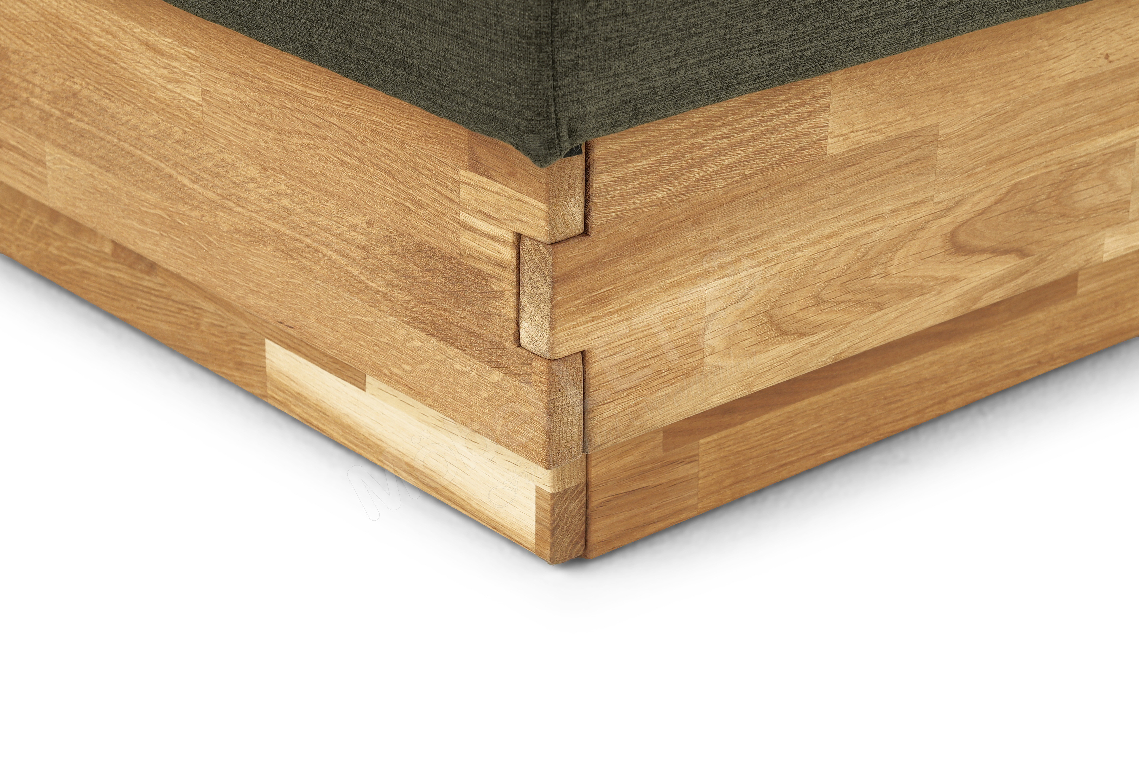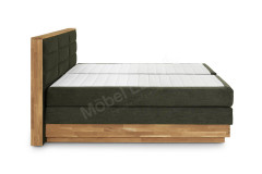 - Box: tragende Teile aus Massivholz, 5-Gang-Bonell-Federkern-Polsterung (ca. 220 Federn bei Größe 100 x 200 cm), Sichtholzrahmen in Eiche massiv geölt