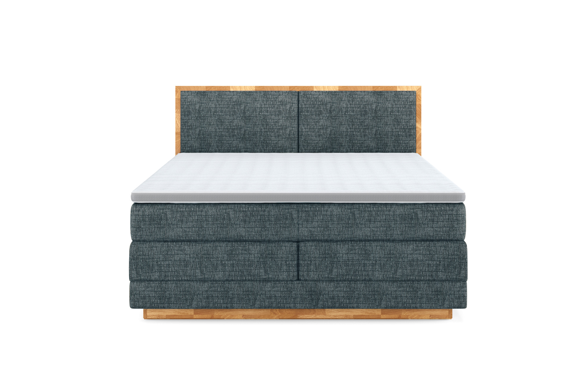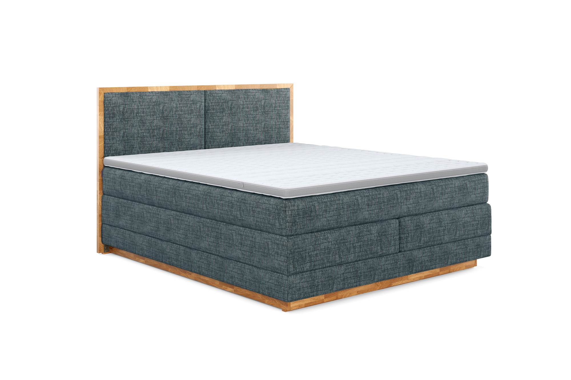 - Box: tragende Teile aus Massivholz, 5-Gang-Bonell-Federkern-Polsterung (ca. 220 Federn bei Größe 100 x 200 cm), Sichtholzrahmen in Eiche massiv geölt