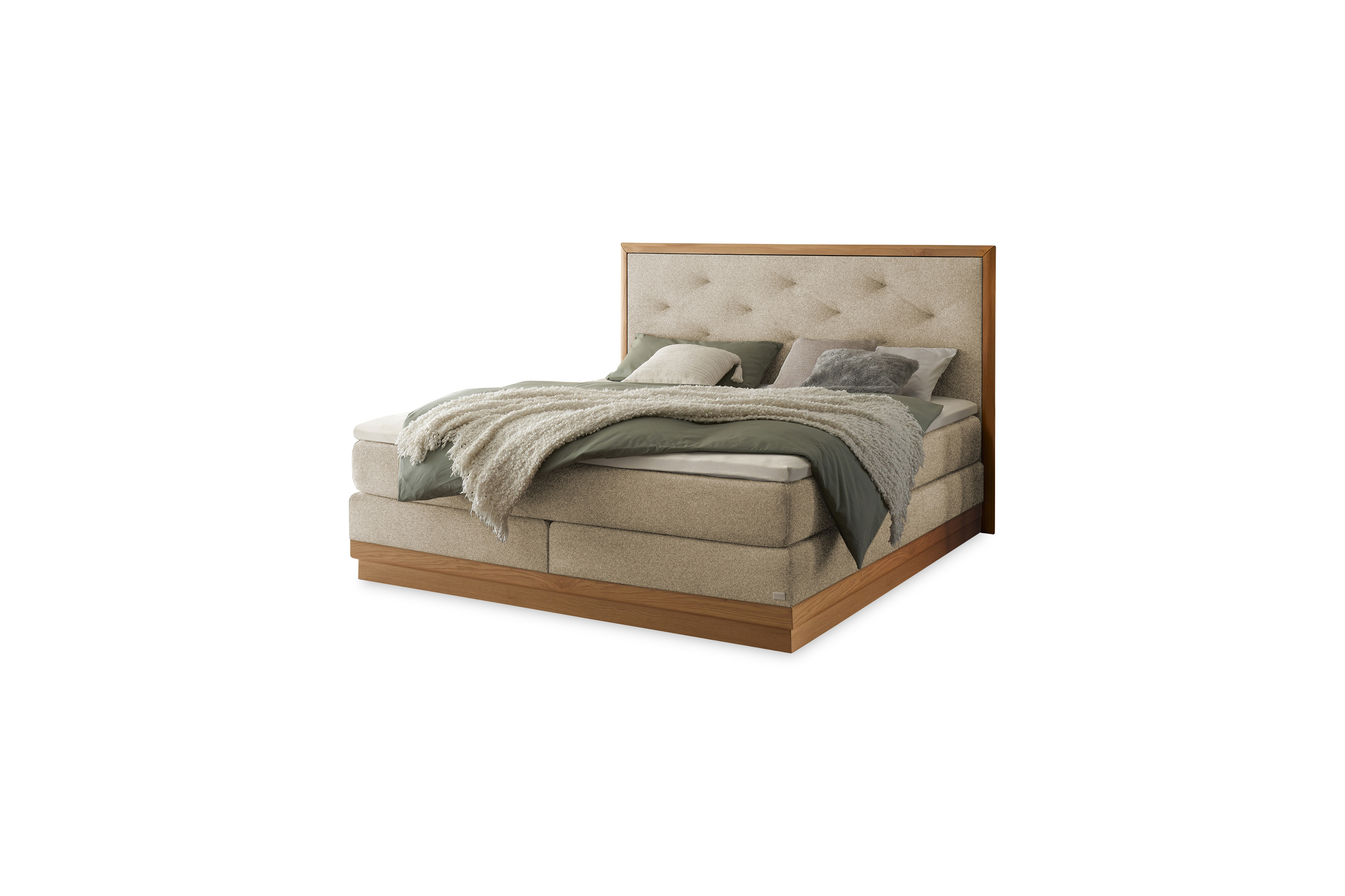 Elegant, apart und mondän präsentiert sich Ihr neues Boxspringbett von Hasena: Der Bezug im beigen Bouclé füllt den Raum mit Wärme und ergibt zusammen mit der Kopfteilumrandung und dem Sockel aus Eiche bright einen beeindruckenden Kontrast. Diese Farbkombination ermöglicht Ihnen, dieses Bett problemlos in Ihr Schlafzimmer zu integrieren. Das Untergestell und die Matratze brillieren durch ihren hohen Liegekomfort, der aufgrund der Taschen-Federkerne entsteht und Sie somit erholt in den Tag starten lässt. Im Grundangebot enthalten ist eine durchgängige Matratze, welche Sie jedoch optional auch geteilt oder gar als Partnermatratze mit zwei Kernen in einem Bezug erhalten können. Selbstverständlich können Sie auch die Liegefläche erweitern oder Ihren Liegekomfort mit einem der neun möglichen Topper unterstützen. Zwischen einer Vielzahl von Farbvarianten haben Sie die Möglichkeit, Ihren persönlichen Wunschbezug zu wählen und diesen an eine der aufgeführten Holzausführungen anzupassen. Haben Sie sich für eine dieser drei Varianten entschieden, sollten Sie es nicht versäumen, Ihr Schlafzimmer mit dem passenden Beistelltisch auszustatten. Eliza von Hasena Comfort - ein Boxspringbett, welches verzaubert und jeden in seinen Bann reißt.