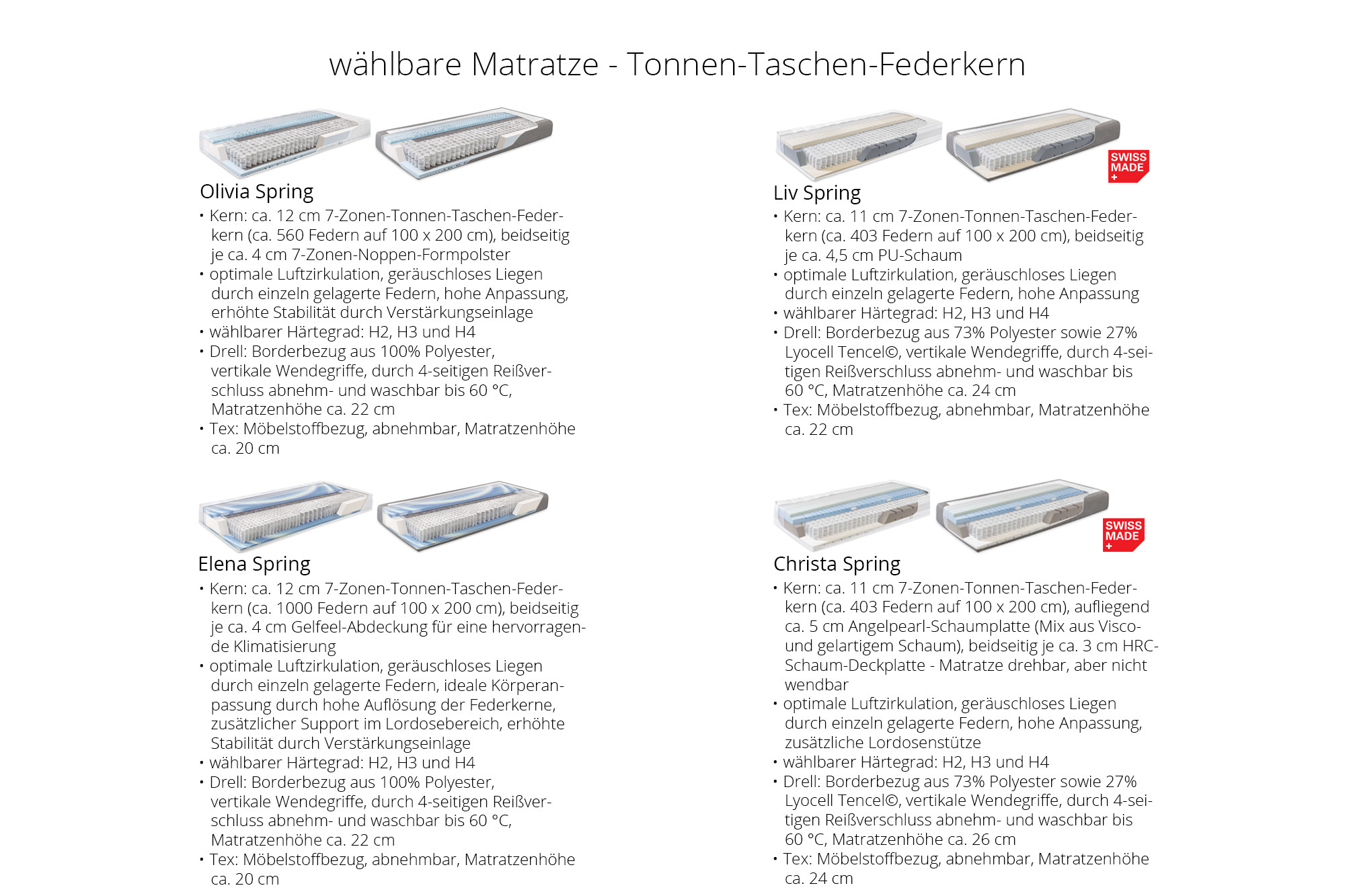 - Matratze: Olivia Spring Tex - 7-Zonen-Tonnen-Taschen-Federkern (ca. 560 Federn auf 100 x 200 cm) mit beidseitigem 7-Zonen-Noppen-Formpolster, abnehmbarer Möbelstoffbezug