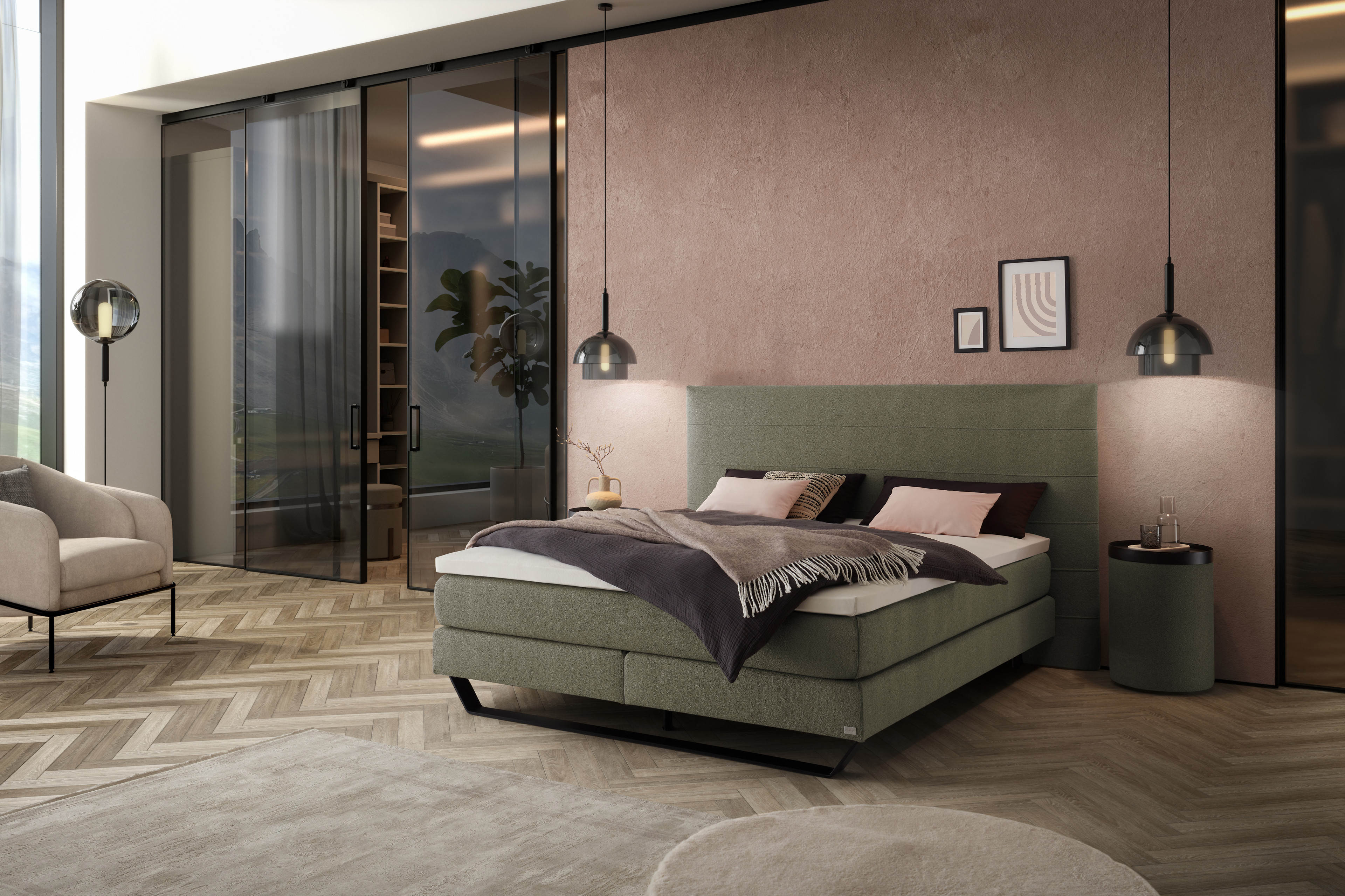 Sie haben sich Ihren Bademantel übergezogen, haben eine Tasse Kaffee in der Hand und wollen den Morgen in völliger Ruhe beginnen, um Kraft für den Tag zu gewinnen. Sie durchqueren das Schlafzimmer und begeben sich direkt auf die Terrasse, um die Eindrücke der Natur auf sich wirken zu lassen. Umso wichtiger ist es, dass dieser wohltuende Moment nicht augenblicklich entkräftet wird, wenn Sie sich wieder in Ihr Schlafgemach begeben. Eine harmonische Aura ist nicht zu verkennen und genauso wichtig für die Sinne wie für einen ausgewogenen Schlaf. Der Farbton Mintgrün des Boxspringbettes wirkt elegant sowie dezent und schenkt Ihnen dadurch vollkommene Gelassenheit und Entspannung. Aber nicht nur das äußere Erscheinungsbild macht das Boxspringbett Mary von Hasena zu etwas ganz Besonderem, sondern auch der sensationelle Liegekomfort, der sich durch die Taschen-Federkerne begründet, welche im Untergestell sowie auch in der Matratze zu finden sind. Passend zu der Kufe aus schwarzem Metall und der Bezugsausführung bieten wir Ihnen in unseren Zusatzoptionen die praktische Nachtkonsole an. Nehmen Sie sich die Zeit und entdecken Sie alle Möglichkeiten, die Ihnen dieses Bett gibt, um Ihre persönlichen Wünsche zu erfüllen. Boxspringbetten von Hasena - ein Genuss für die Sinne.
