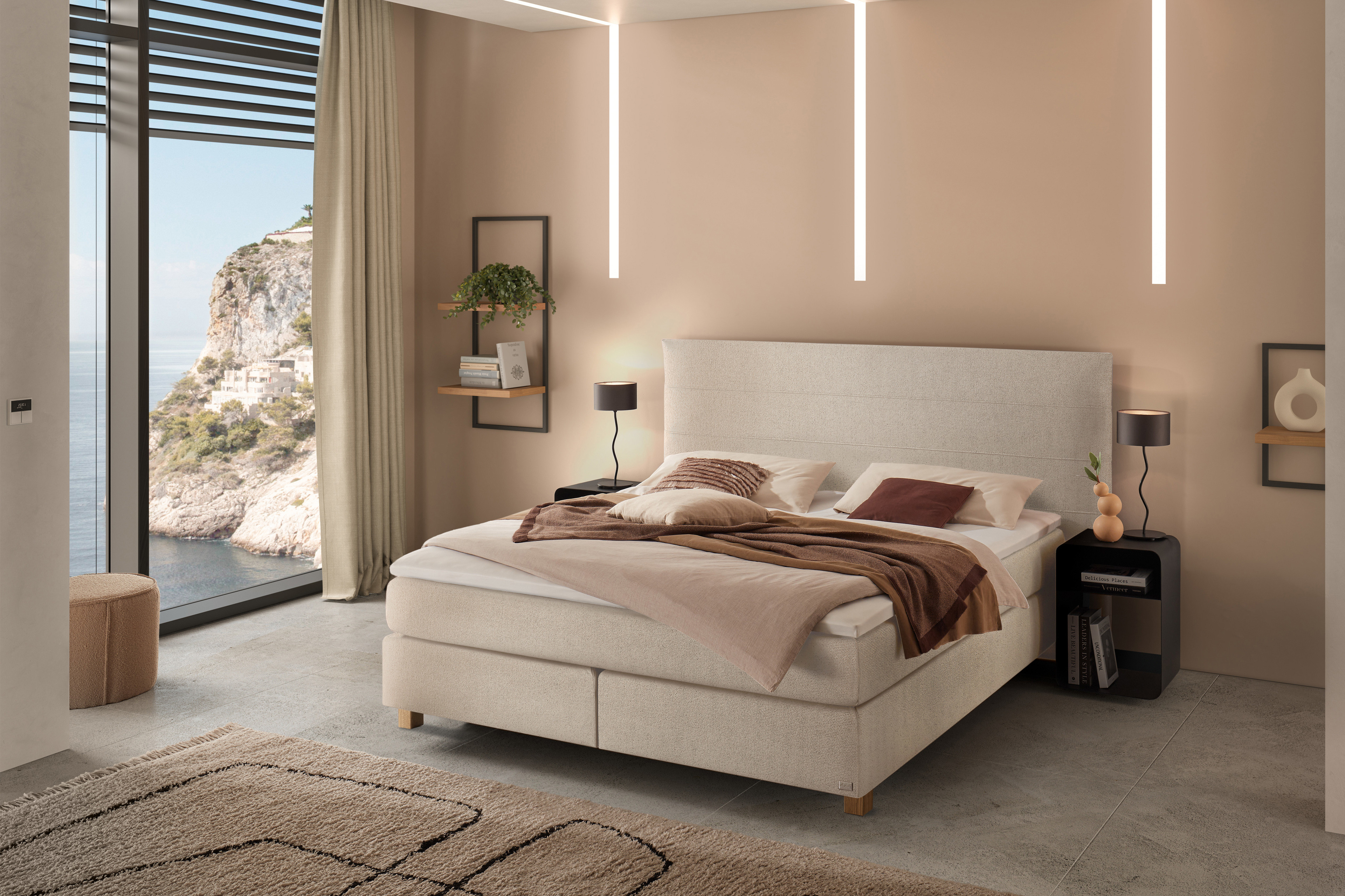Beim Anblick dieses Boxspringbettes verfällt man umgehend in Urlaubsstimmung. Man schließt die Augen und stellt sich vor, wie man am Morgen erwacht und der erste Blick aus dem Fenster zu rauschenden Wellen und weißen Felsen fällt. Wenn Sie mit solch einem Gedanken zu Bett gehen, können Ihre Träume ganz einfach nur fantastisch werden. Mary aus der Reihe Comfort von Hasena wurde mit Liebe zum Detail kreiert und ist somit ein Modell, das unwiderstehlich ist. Erkennbar ist dies bereits an den Details am Kopfteil, welches mit wunderschönen Nähten verziert wurde. Atemberaubend ist gleichermaßen der Chenille-Flachgewebebezug, der sich angenehm sanft anfühlt und unter der Rubrik „Wunschbezug“ in verschiedenen Farben erhältlich ist. Nicht nur der Bezug ist komfortabel, sondern auch das Liegegefühl - die Taschen-Federkerne des Untergestells und der Matratze sorgen für den erholsamen Schlaf und der optionale Topper, den Sie je nach Belieben unter unseren Zusatzoptionen wählen können, unterstreicht das Ganze noch zusätzlich. Dort finden Sie außerdem die passende Nachtkonsole und die wählbaren Holzausführungen für die Füße Tess. Comfort Boxspringbetten von Hasena – erinnern Sie jede Nacht an die erholsamsten Tage des Jahres.