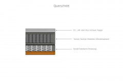 - Matratze: Tonnen-Taschen-Federkern (ca. 390 Federn auf 100 x 200 cm), Wendekern (eine Seite soft H2, eine Seite fest H3)