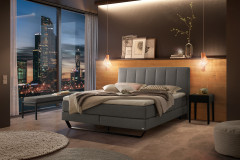Die Kollektion Hasena Pronto präsentiert sich mit dem anmutigen Boxspringbett Ambra, das Ihr Schlafzimmer mit seinem angenehmen Äußeren aufwertet und mit seinem freundlichen grauen Bezug Energie sowie Vitalität versprüht. Die edle Kufe wurde aus hochwertigen schwarzen Metall gefertigt und wird durch die in Stoff bezogenen Boxen sowie Matratze geschmackvoll abgerundet. Passend dazu können Sie über unsere Zusatzoptionen die funktionale Nachtkonsole Chilly, die sich perfekt in Ihr bestehendes Interieur einfügt und durch die praktische Schublade Platz für wichtige Utensilien bietet oder die gemütliche Bank Pato, dazubuchen. Damit es Ihnen auch am Komfort nicht fehlt, ist im Grundangebot bereits ein durchgängiger PU-Schaum-Topper mit festem Liegekomfort enthalten, der optional auch mit einem weicheren Schlafgefühl erhältlich ist und Sie in Kombination mit der Tonnen-Taschen-Federkern-Matratze und den Bonell-Federn im Untergestell Nacht für Nacht gut schlafen lässt. Boxspringbetten von Hasena – garantieren himmlischen Schlaf zu jeder Tageszeit.