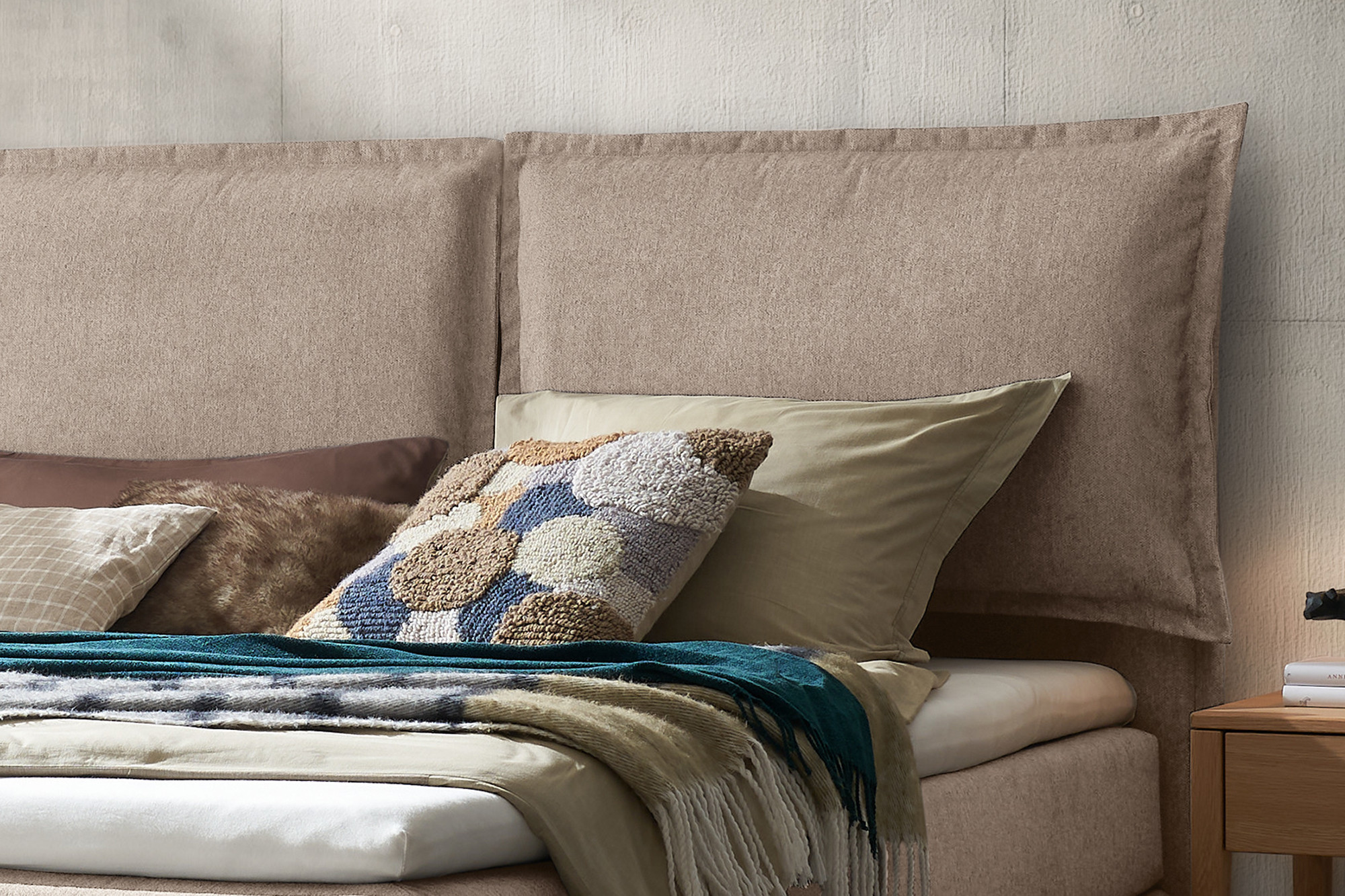 - Kopfteil: doppelt gepolstert, lose Kissenoptik