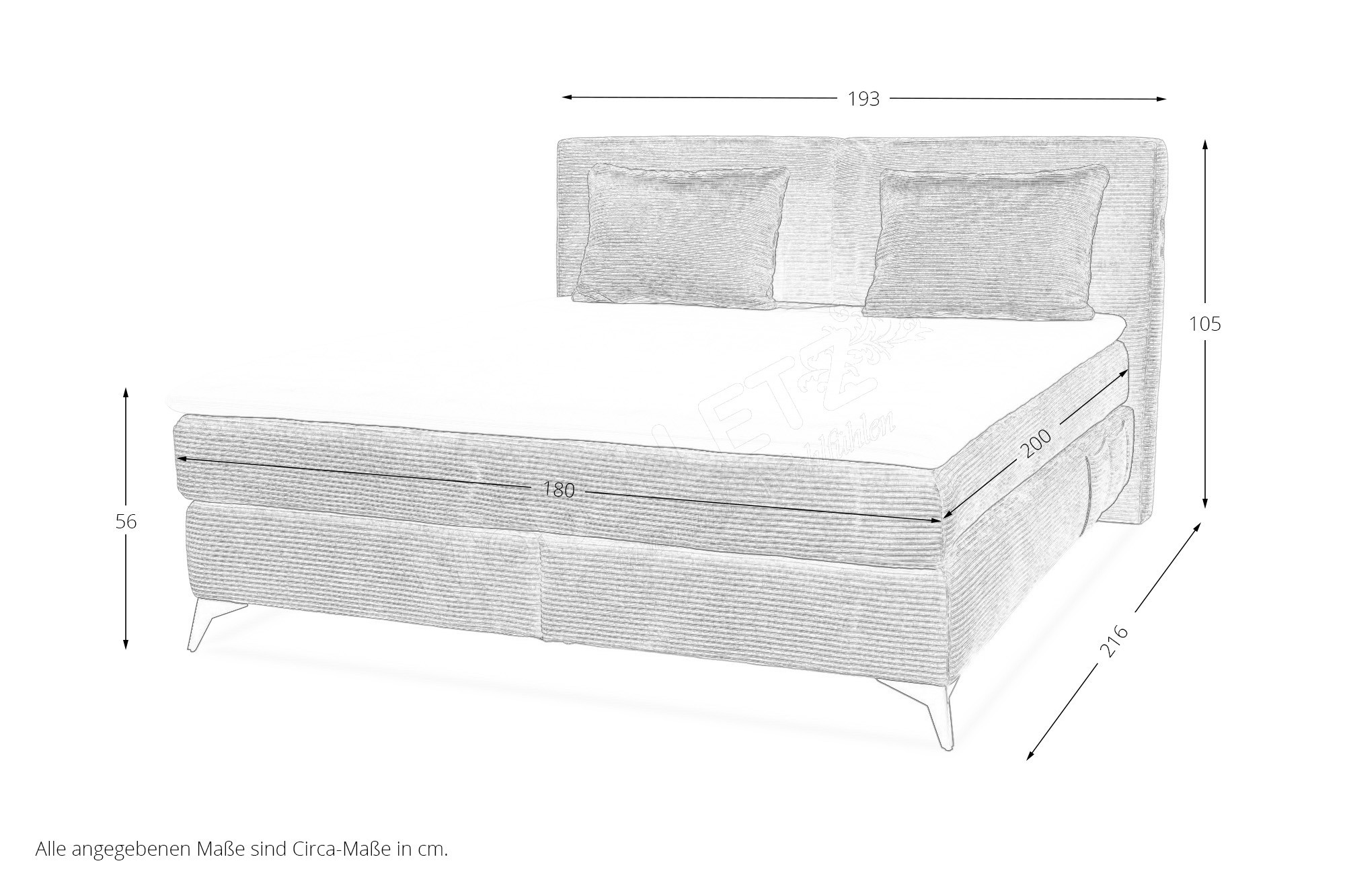 - Box: Bonell-Federkern-Polsterung (ca. 184 Federn auf 90 x 200 cm), Unterbodenbeleuchtung (LED-Leiste)