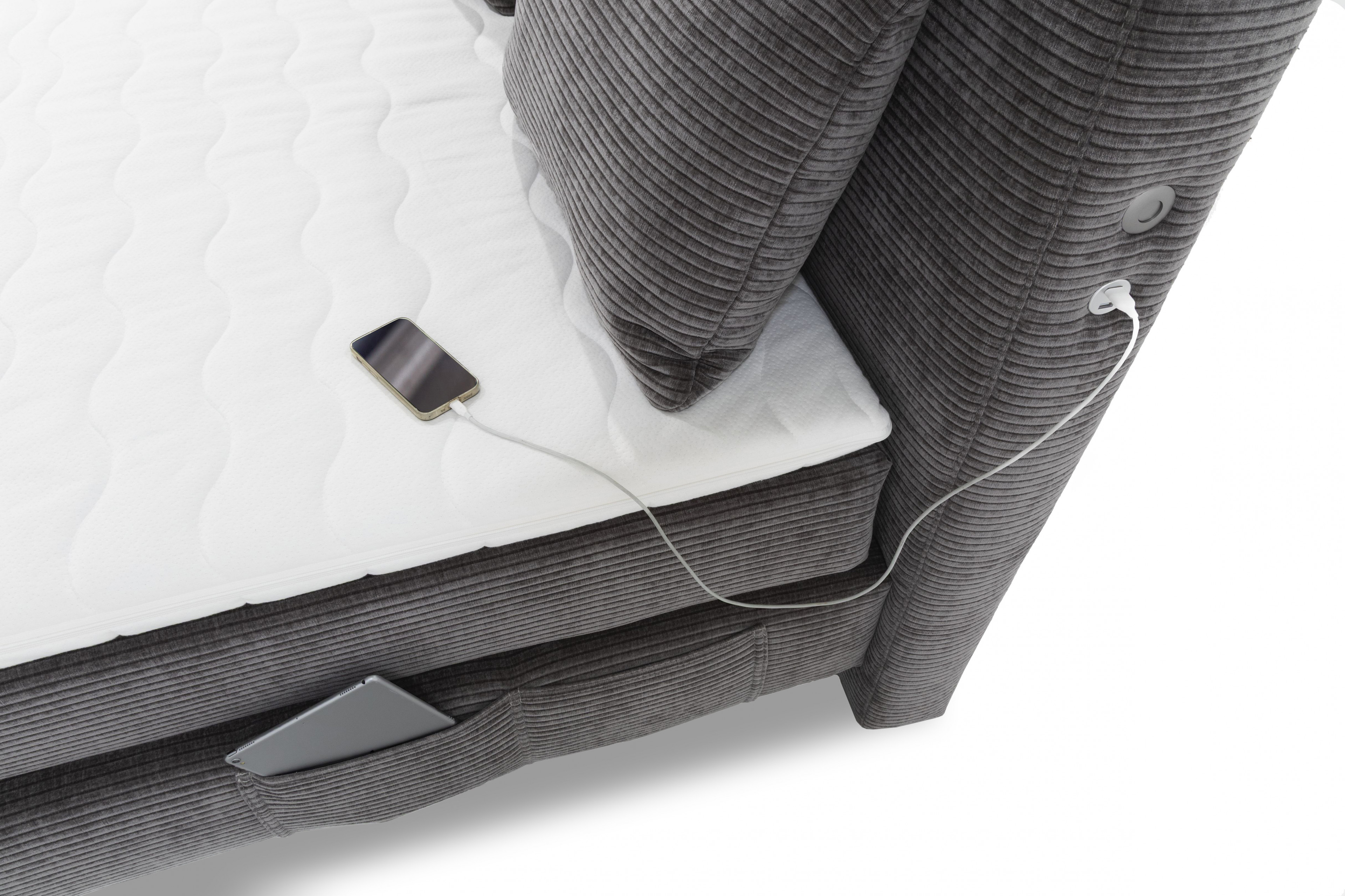 - Kopfteil: mit vertikaler Ziernaht, USB-Ladeports und Schaltknopf für Unterbodenbeleuchtung