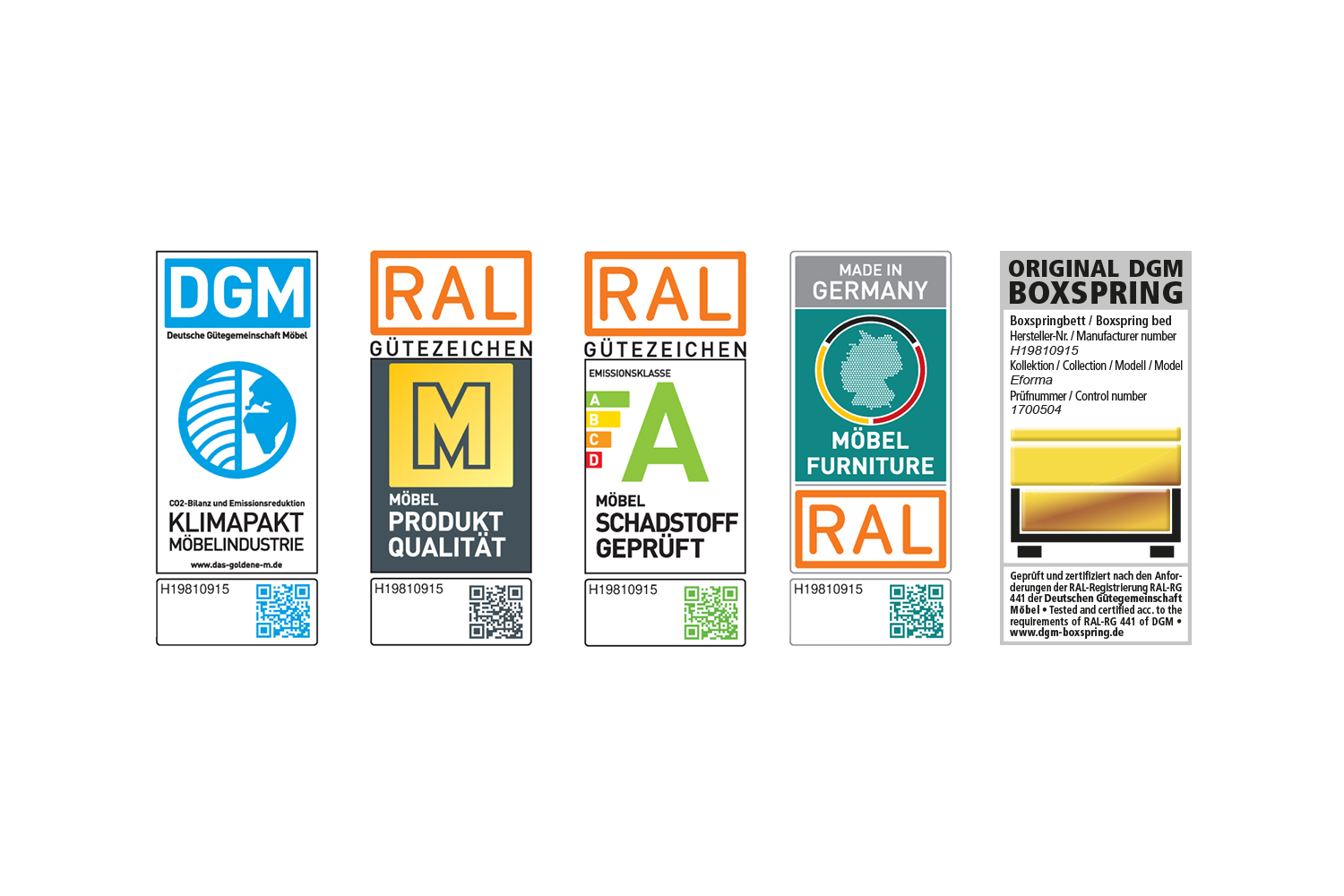 - Box: BodyID-Unterfederung - mit 5 Zonen, bestehend aus Tonnen-Taschen-Federkern und innovativen Fiberglas-basierten Flex-Elementen mit Federholzleisten und beidseitig stufenlos verstellbaren Schiebereglern in Schulter- und Beckenzone