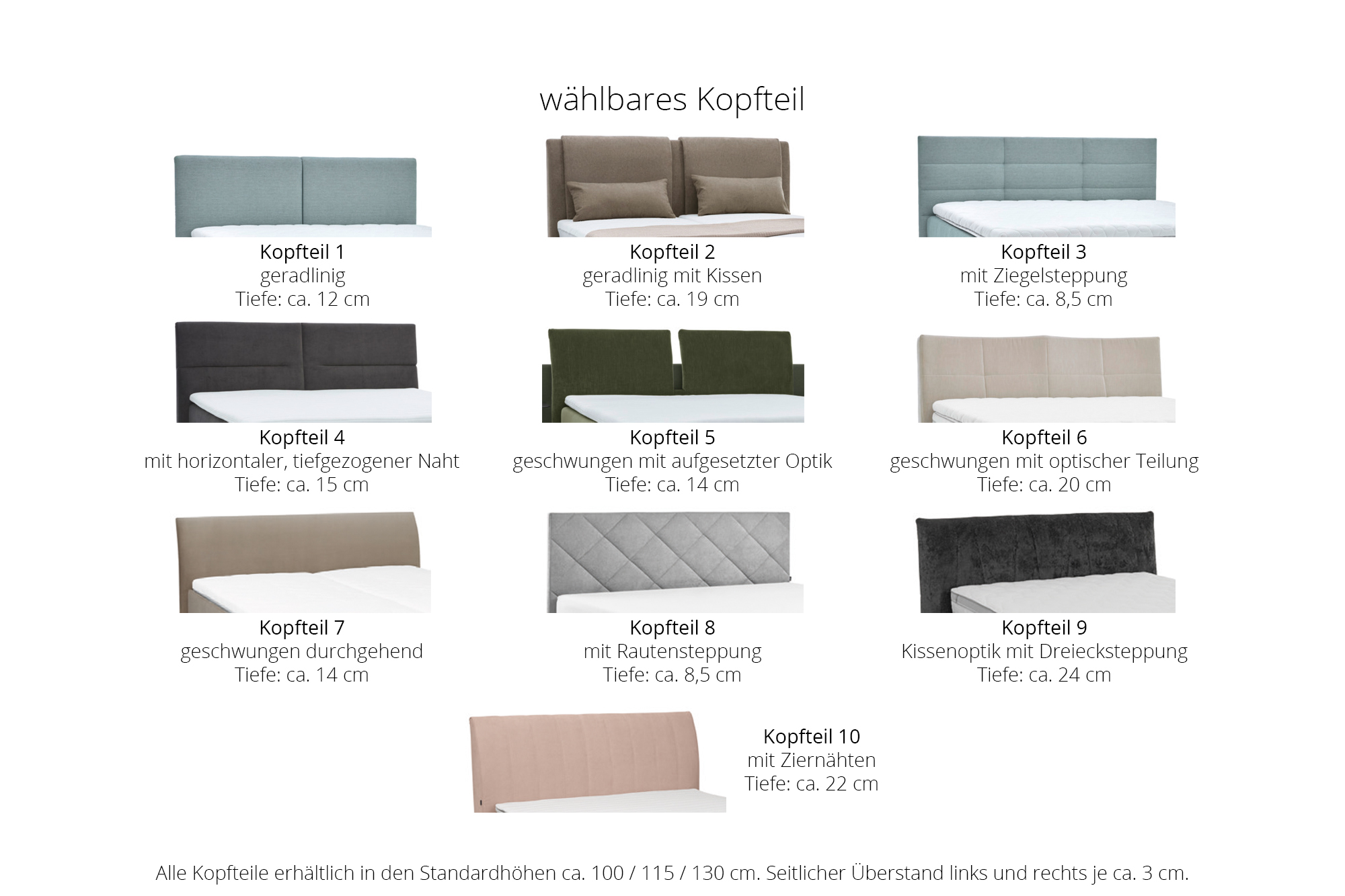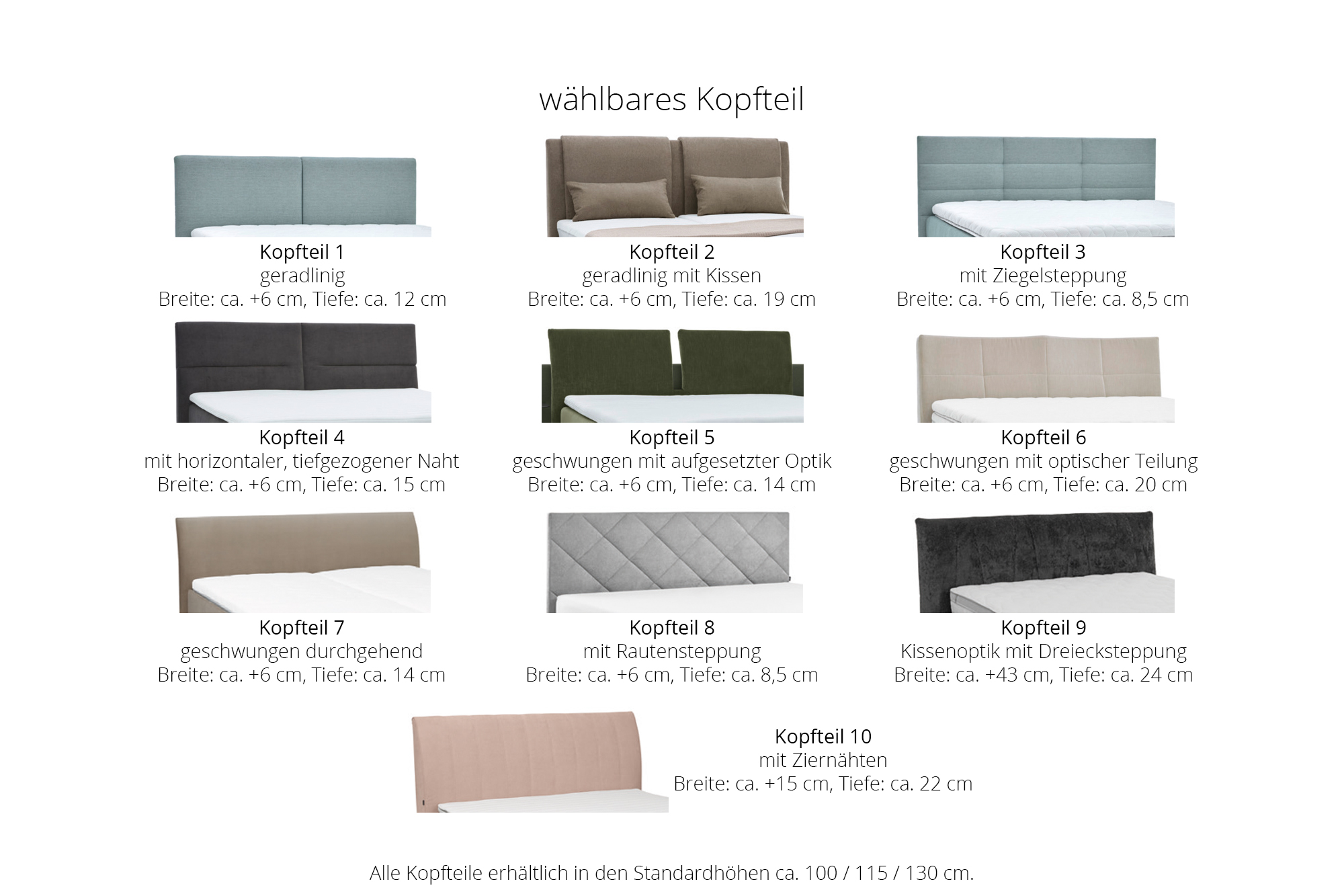 Hinweis! Alle Kopfteile sind in den Standardhöhen ca. 100, 115 und 130 cm erhältlich, die Kopfteile 1, 2, 3 und 8 sind zudem auf Anfrage zentimetergenau bis auf ca. 75 cm kürzbar. Der seitliche Überstand beträgt links und rechts je ca. 3 cm.
