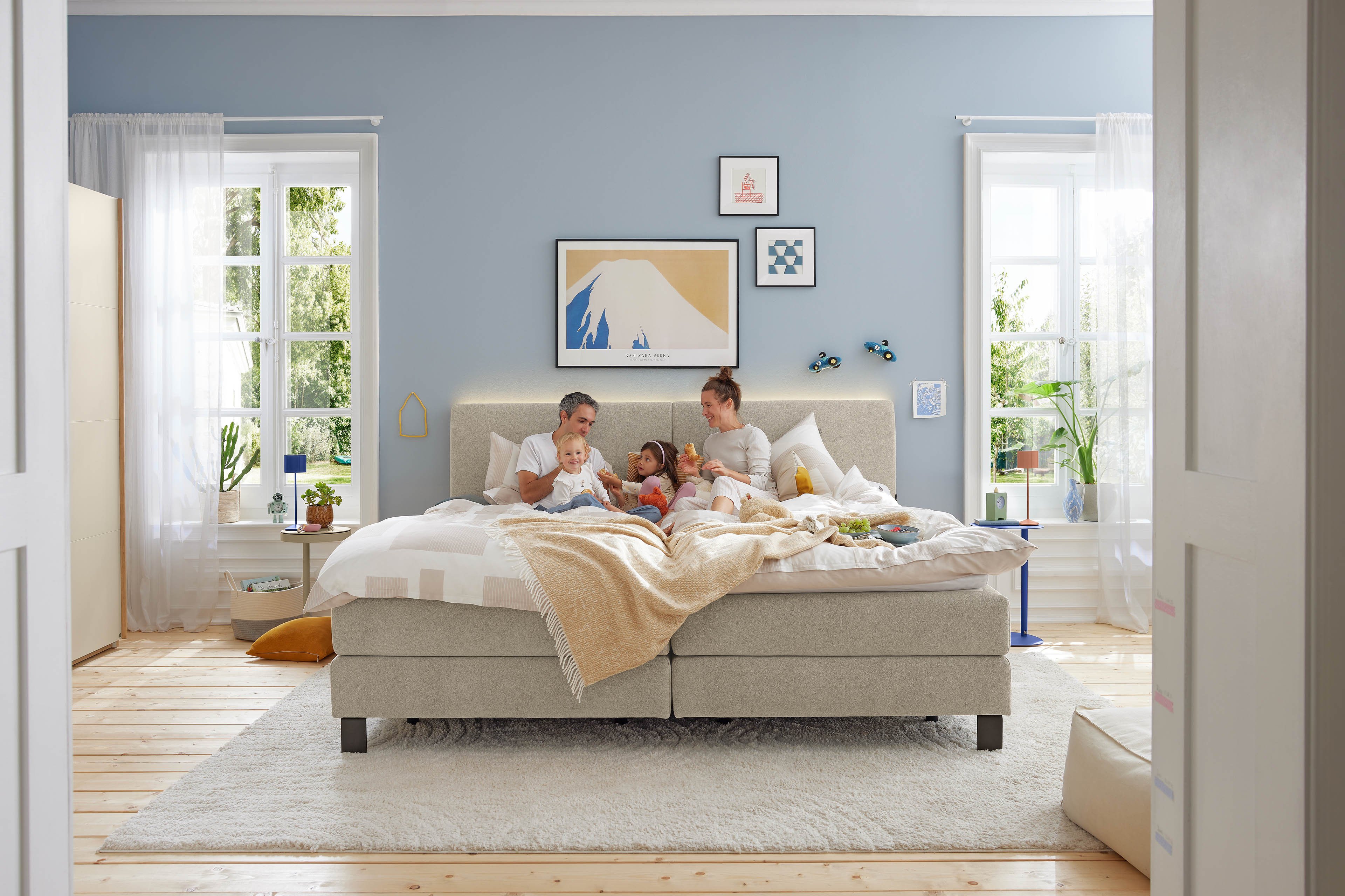 Endlich ist genug Platz für alle – auch für die kleinen Übernachtungsbesucher, die sich immer wieder zu Ihnen mit ins Bett schleichen. Das extra breite Familien-Boxspringbett Elias-Dream von Musterring lädt Sie ein, es sich auf seiner beeindruckend geräumigen Liegefläche von rund 240 x 200 cm gemütlich zu machen und jeden Moment der gemeinsamen Kuschelzeit zu genießen. Selbstverständlich überzeugt auch dieses Familienbett mit der gewohnten, unschlagbaren Musterring-Qualität, sodass Sie sich hier ganz unbesorgt niederlassen können, um in den Genuss seines umwerfenden Schlafkomforts zu kommen. Hochwertige Tonnen-Taschen-Federkerne sind sowohl in den Boxen als auch in den darauf liegenden Matratzen verarbeitet, während ein durchgehender Kaltschaumtopper als dritte Ebene nicht nur den Liegekomfort abrundet, sondern auch die störende „Besucherritze“ zwischen den beiden Einzelmatratzen verschwinden lässt – so kann jeder überall gut schlafen. Mit einigen Anpassungsmöglichkeiten, die wir Ihnen hier auf dieser Seite zur Verfügung stellen, verleihen Sie Elias-Dream, beispielsweise mit der Auswahl des Bezuges oder der Fußausführung für das Untergestell, eine persönliche Note und erschaffen sich somit eine ganz eigene Wohlfühloase für Ihr Schlafzimmer. Traumhaft schöne und gleichzeitig bequeme Boxspringbetten von Musterring … hier werden all Ihre Träume wahr.