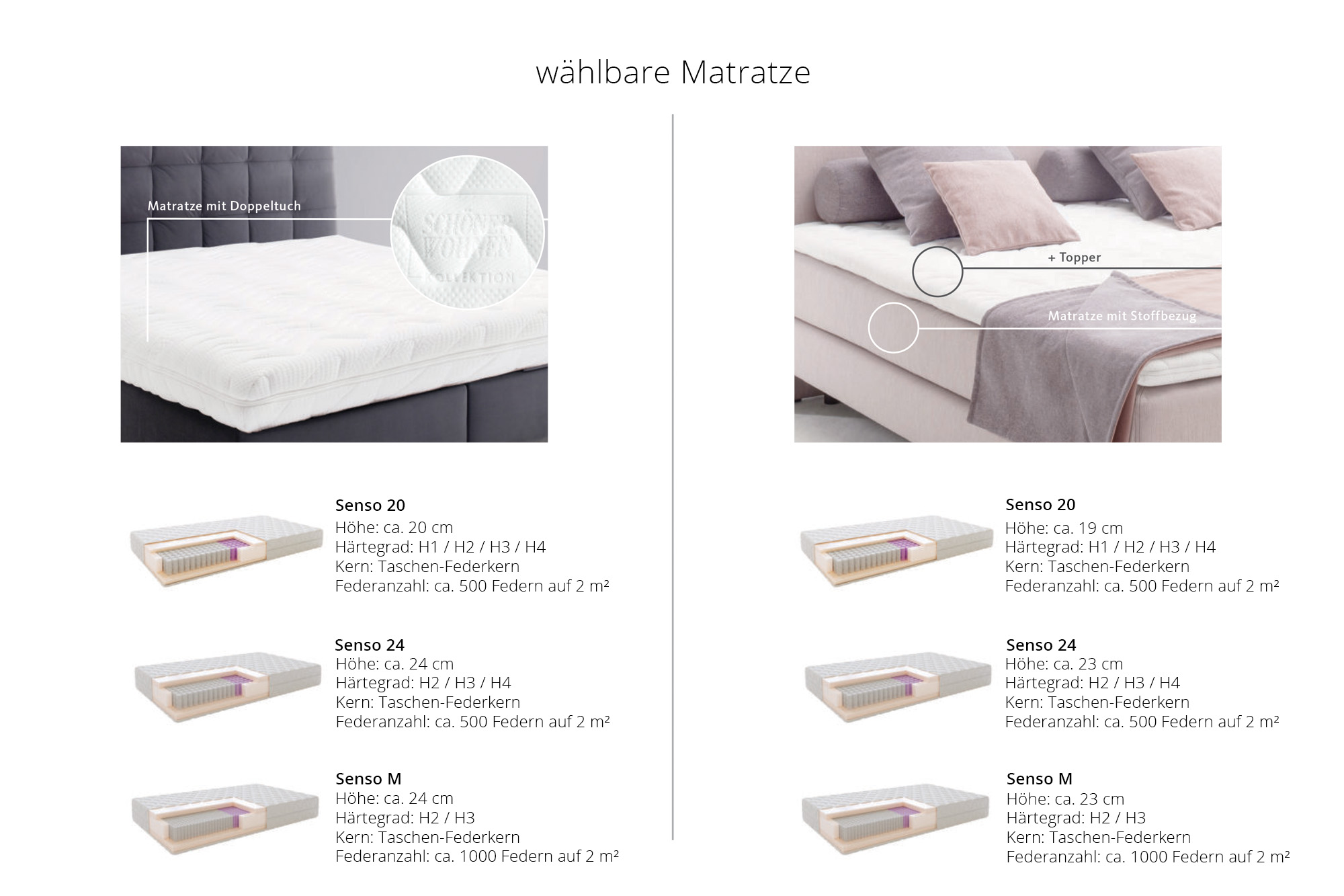- Matratze: Senso 20 mit Taschen-Federkern (ca. 500 Federn auf 2 m²), stoffbezogen