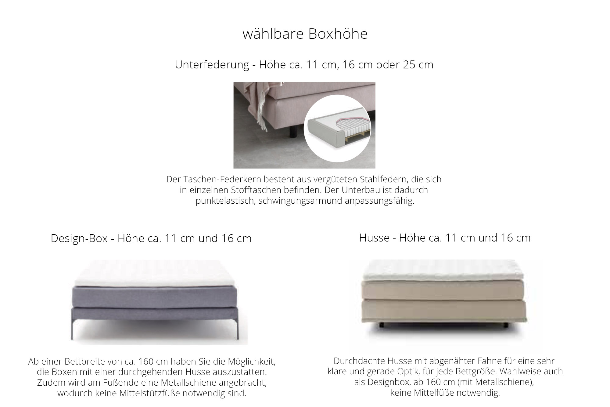 - Box: Designbox UF 11 cm, mit Taschen-Federkern, unverstellbar, mit Metallschiene und durchgehender Husse