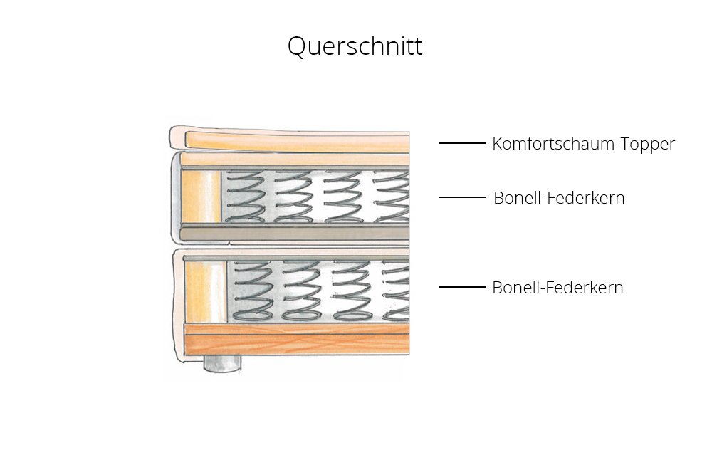 - Matratze: Bonell-Federkern, Umrandung bezogen mit Möbelstoff, mit fest vernähtem Komfortschaum-Topper, Liegefläche dank Reißverschluss abnehm- & waschbar
