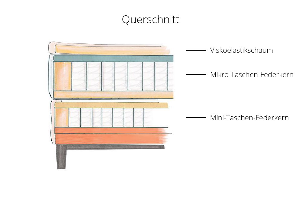 - Matratze / Topper: 7-Zonen-Mikro-Taschen-Federkern (ca. 1000 Federn auf 100 x 200 cm), im Bezug wendbar mit einer weichen (H2) und einer festen (H3) Liegeseite, mit fest vernähtem Viskoelastik-Topper mit umlaufendem Klimaband am Steg & Kedereinfassung, Oberseite des Topperbezuges ist mithilfe des umlaufenden Reißverschlusses abnehm- und waschbar