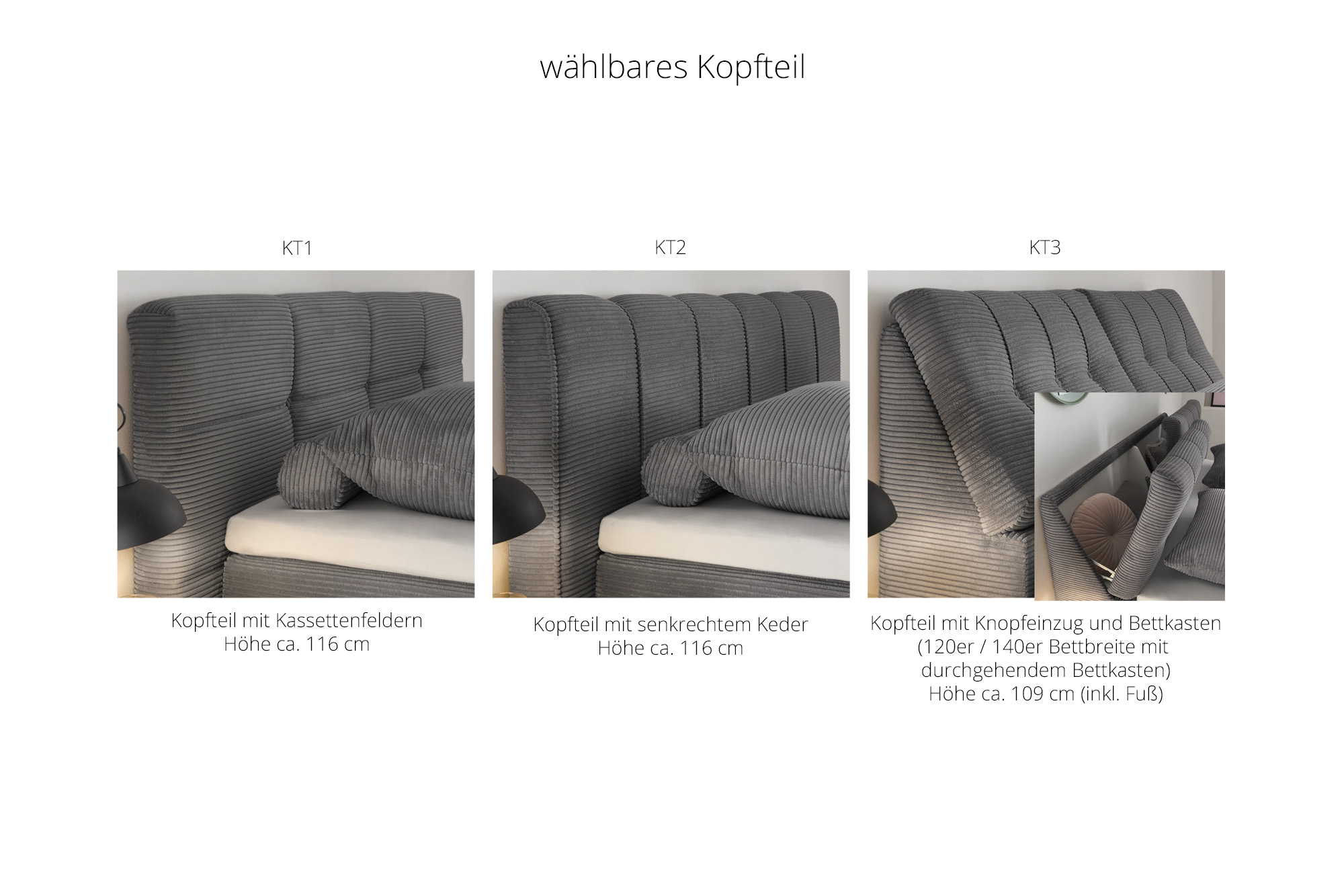 - Kopfteil: mit Bettkasten und Knopfeinzug