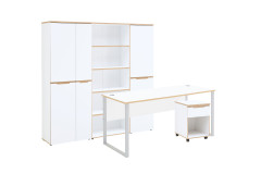 Die perfekte Zusammenstellung für ein modernes, stilvolles Büro erhalten Sie mit den vorgestellten Innostyle Büromöbeln Memphis-Office. Dank des harmonischen Designs in der erlesenen, weißen Farbauswahl mit stilistischen Akzenten in Artisan Eiche wird jeder Arbeitsplatz aufgewertet, was zu einem angenehmen Arbeitsumfeld beiträgt. Das Büromöbel-Set umfasst einen geräumigen Schreibtisch, einen praktischen Rollcontainer und eine großzügige Aktenschrankkombi – also alles um zeitnah mit der Arbeit zu starten. Für ausreichend Arbeitsfläche sorgt die melaminbeschichtete Tischplatte des Bürotisches und stellt dank des eleganten Rahmengestelles viel Beinfreiheit zur Verfügung. Der Rollcontainer besitzt ein offenes Fach, in dem Ordner und Fachbücher Platz finden, während im darüber liegenden Schubkasten Ihre Arbeitsmaterialien stets griffbereit sind. Zusätzlichen Stauraum für Ordner und Akten bietet die Büroschrank-Kombination, deren Einzelelemente auch solitär im Raum aufgestellt werden können, um Ihren individuellen Bedürfnissen gerecht zu werden. Bestellen Sie also noch heute die gelungene Bürokombination Memphis-Office von Innostyle.