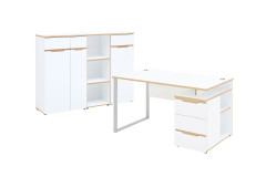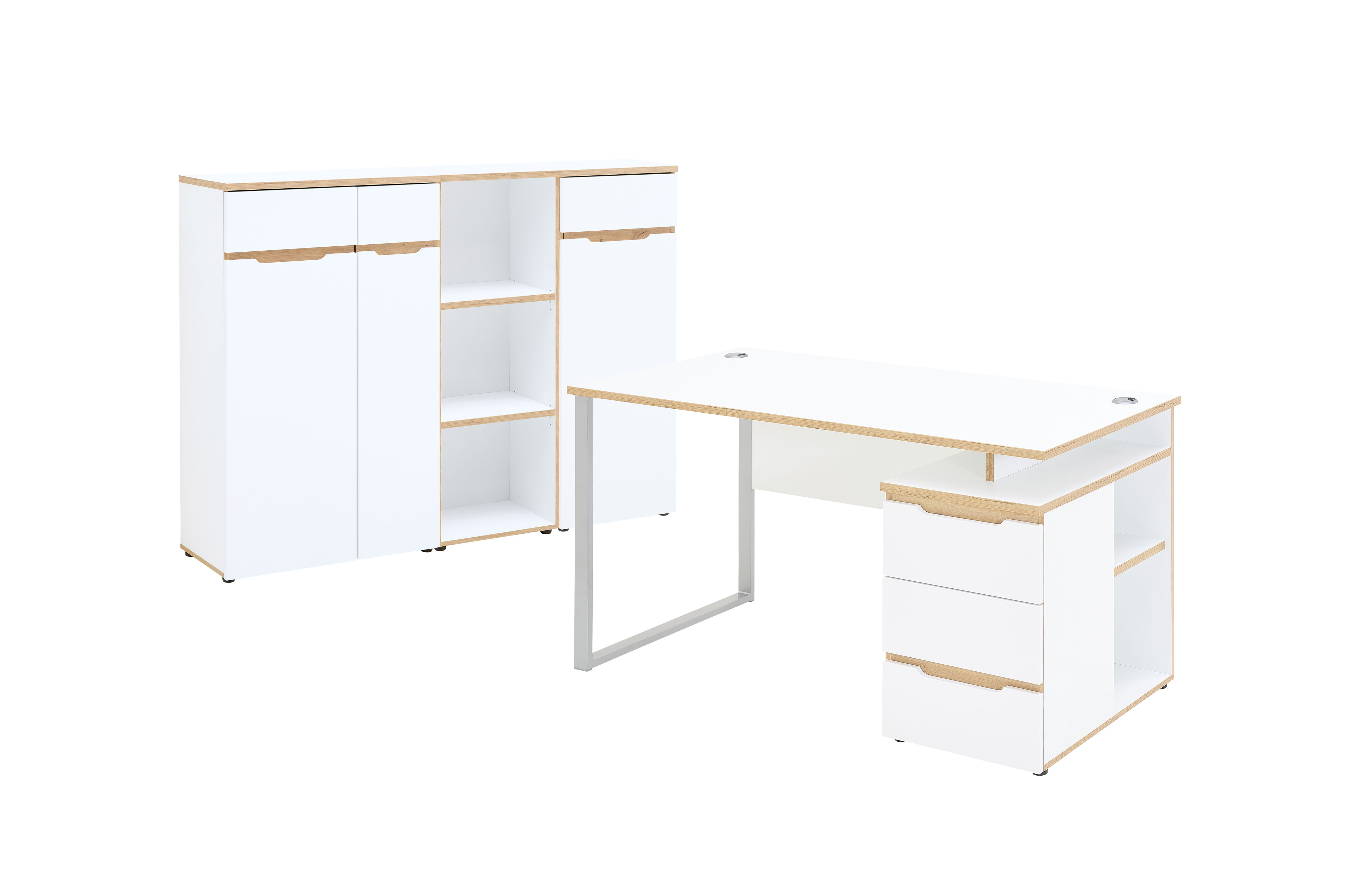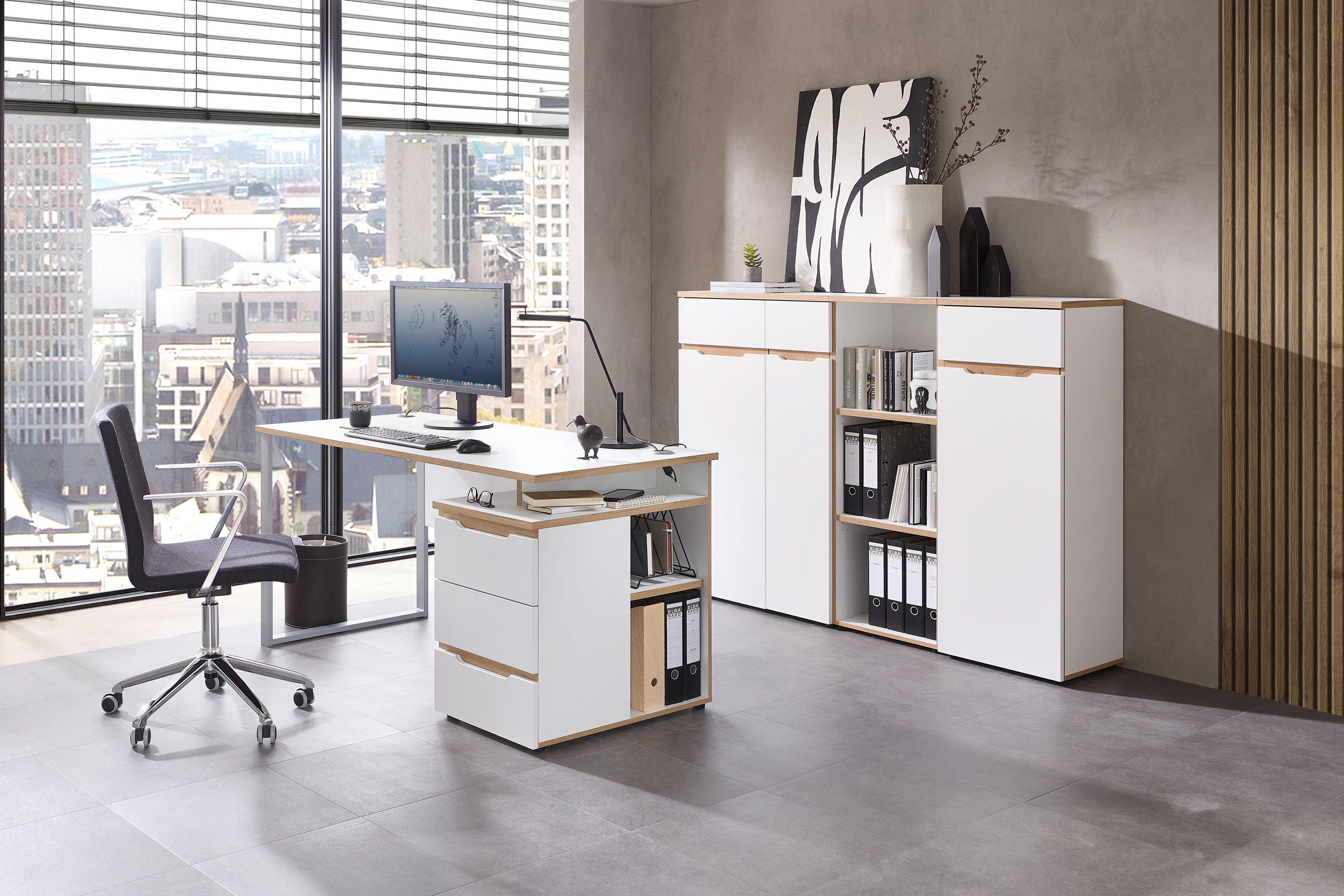 Das Büromöbelset Memphis-Office von Innostyle eignet sich dank seines schlichten Arrangements, aus einem geräumigen Schreibtisch und einer Highboardkombi bestehend, ideal für das Homeoffice. In seiner freundlich-weißen Ausführung, das mit seinem innovativen Kantendesign punktet, trägt die Büromöbelkombi zu einem harmonischen Arbeitsumfeld bei. Clever gestaltet ist der Schreibtisch, der einen integrierten Container enthält. So haben Sie alle wichtigen Unterlagen parat, sowohl in den drei Schubfächern, als auch in der seitlichen Aussparung, die Platz für Ordner und Bücher zur Verfügung stellt. Damit ist die Arbeitsfläche schnell aufgeräumt und im Zwischenraum können kleine Utensilien bereitliegen, die aus dem Blickfeld sein sollen. Die halbhohe Aktenschrankkombi bietet hinter ihren Türelementen zusätzlichen Stauraum für Ordner sowie Dokumente. Weiteren Raum haben Sie im offenen Regal zur Verfügung, das Sie gern mit wenigen Dekoelementen oder Pflanzen bestücken können. Überzeugen Sie sich von der Funktionalität sowie dem Design der Innostyle Büromöbel Memphis-Office und schaffen Sie sich ein stilvolles, effizientes Arbeitsumfeld.